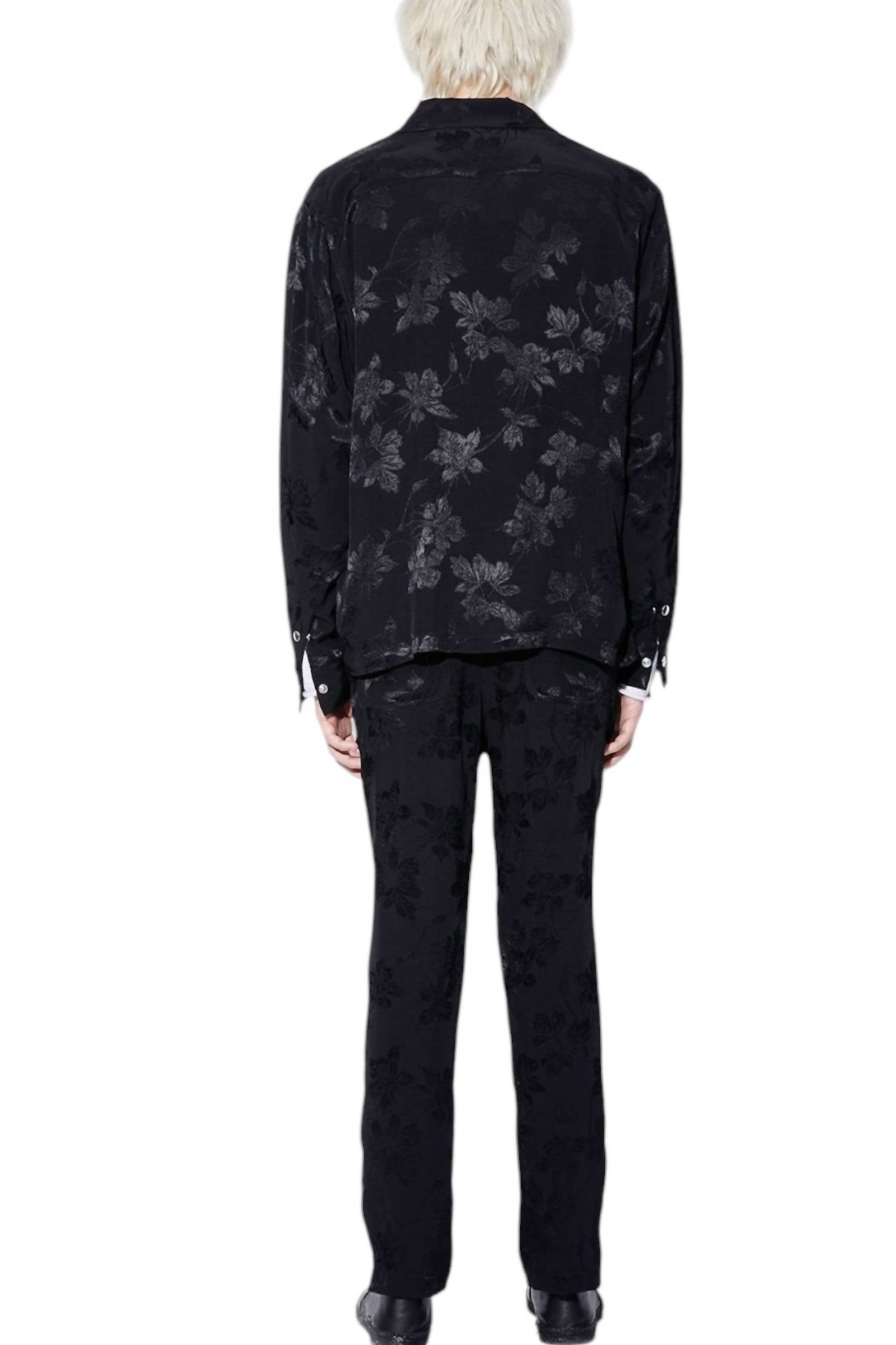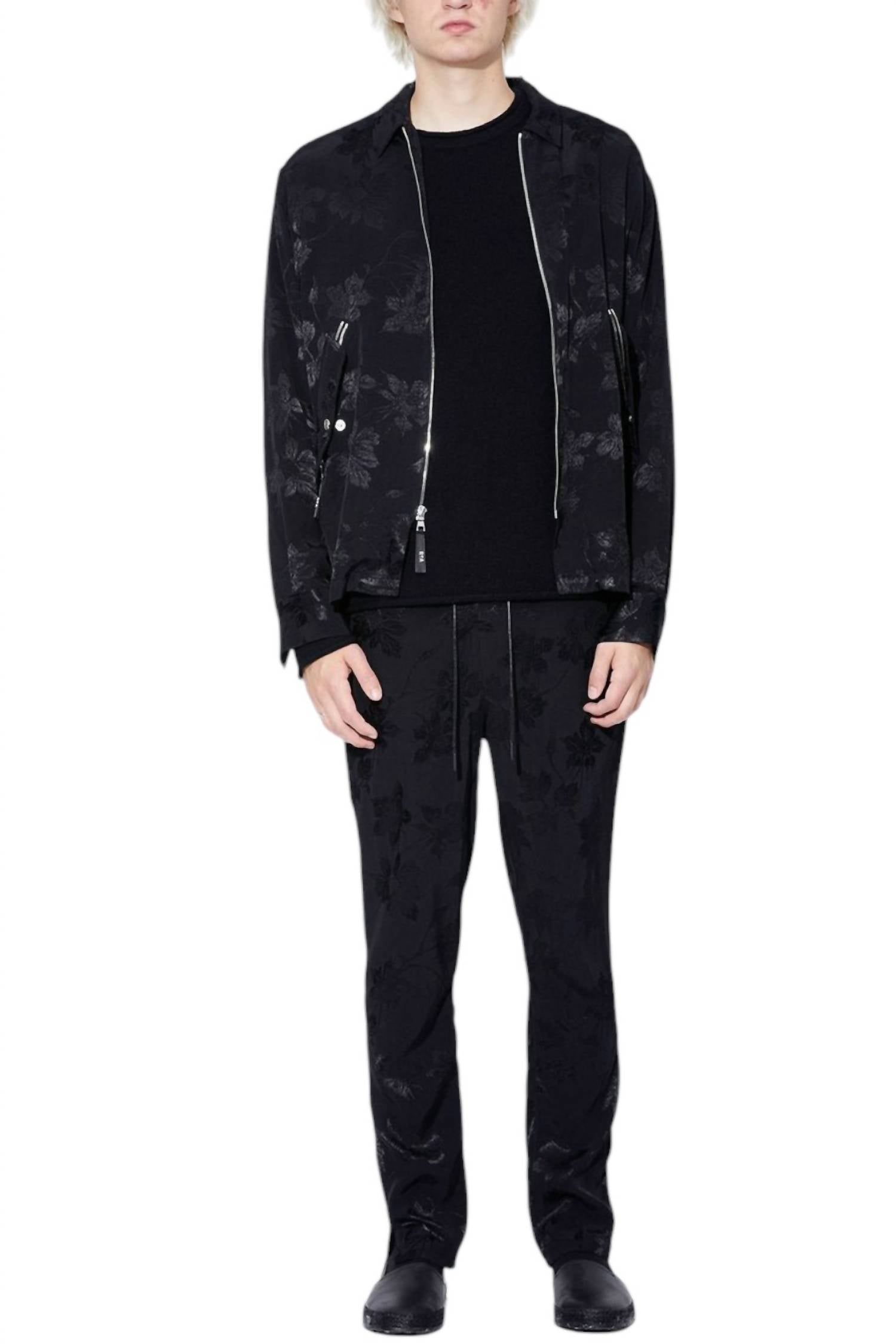 The Caden Jacket by RtA combines refined style with a relaxed, luxurious fit. Crafted from smooth rayon in black camo, it features a floral jacquard pattern for added depth and sophistication. Designed for men, this jacket includes a practical zip closure, functional zip pockets, and button flap details for a touch of utility. With long sleeves and a collared design, it merges bomber and varsity influences, making it a versatile piece for effortless layering and stylish ensembles.