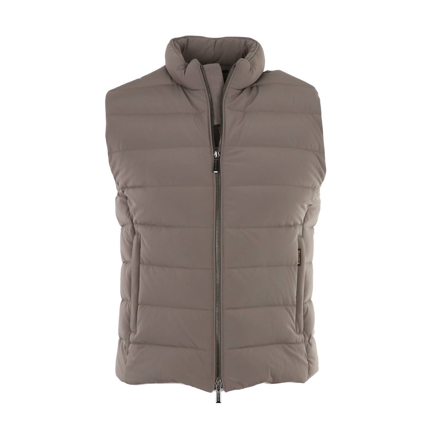 Experience the Men's Oliver Quilted Down Vest by MooRER, a stylish addition in ocean blue designed for functionality and flair. This sleeveless vest is constructed with bi-stretch, water-repellent polyamide fabric, featuring a striking boudin quilted outer shell injected with goose down. Measuring 61 cm in length, it boasts a practical wide stand collar, zip closure with a brushed metal double glider, and multiple pockets, including side welt pockets with metal zips and interior valuables pockets. For care, simply machine wash.