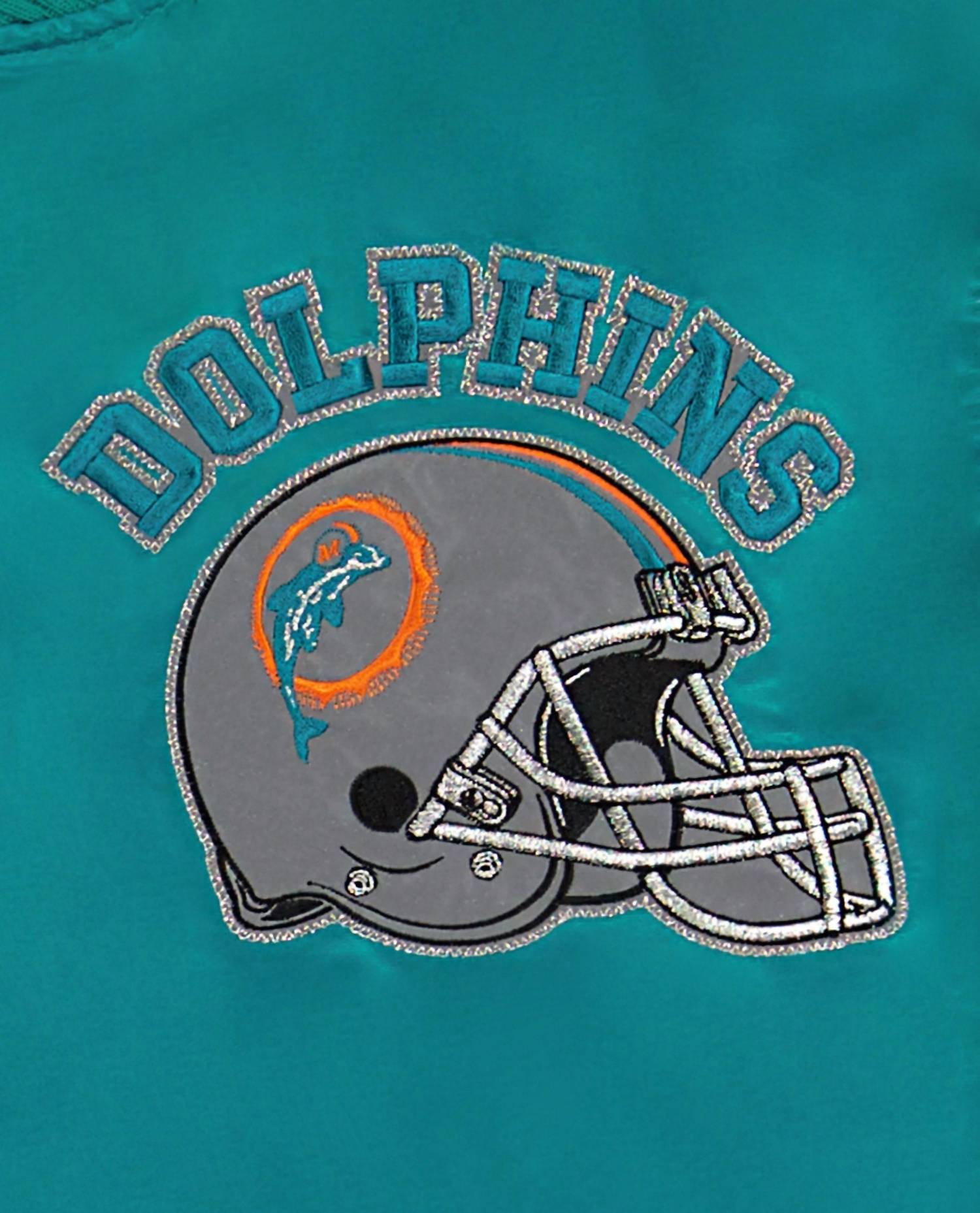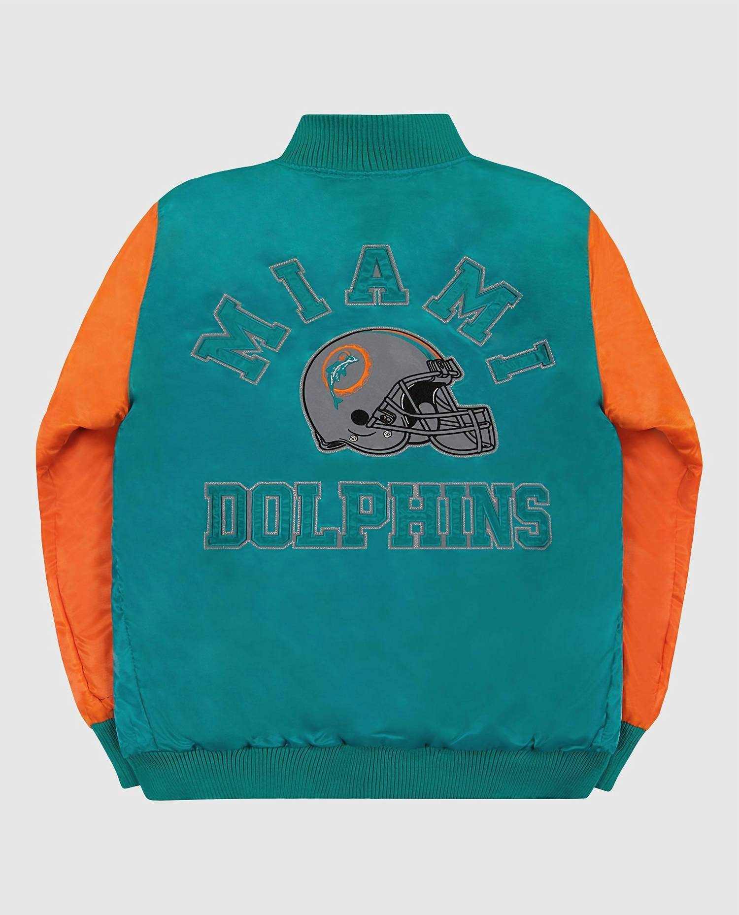 Elevate your game day style with the Miami Dolphins Varsity Jacket in a striking aqua and orange combination. Featuring long sleeves and crafted from durable polyester, this jacket showcases vibrant team graphics with twill applique logos for a bold statement. Complete with a snap front button closure and functional pockets, it's a practical yet standout piece. Perfect for fans, the jacket sports a crewneck rib knit collar with Starter silver lurex branded embroidery and a retro NFL shield patch.