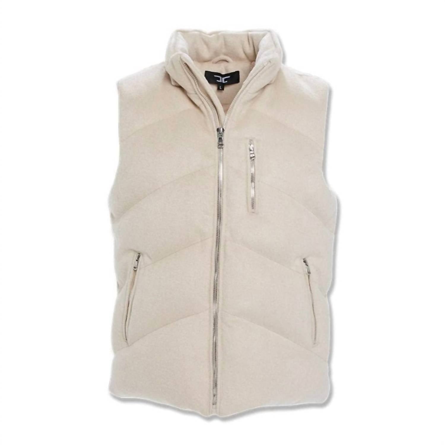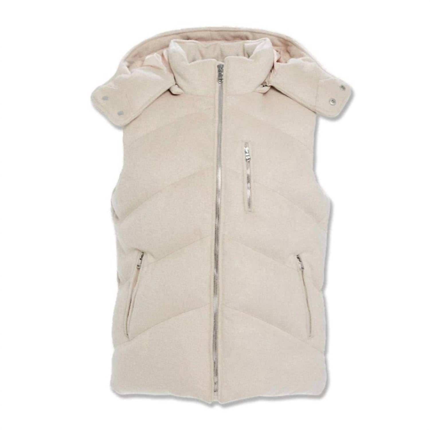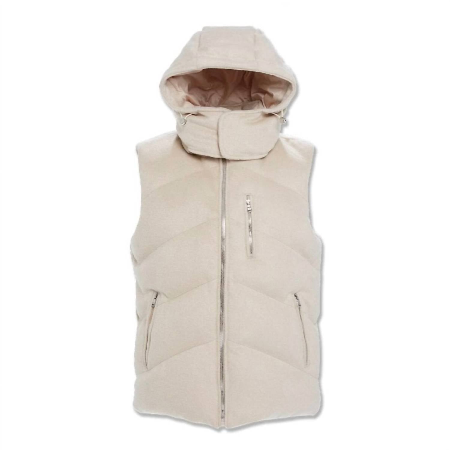 Classic puffer sleeveless vest features a wool shell with a puffer silhouette, enhanced by a removable hood with an adjustable bungee cord. Boasts a composition of 40% Wool and 60% Polyester. Jordan Craig-branded zipper closures. Care for this textured piece with a simple machine wash.