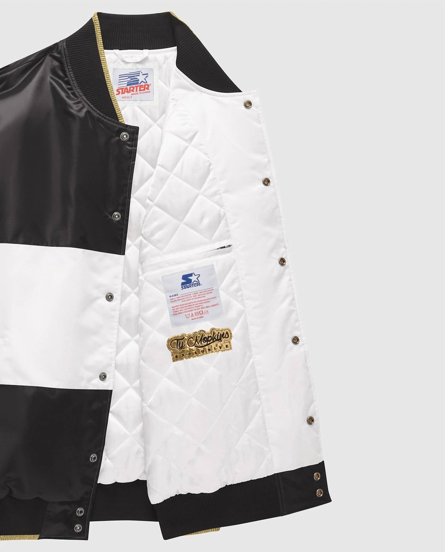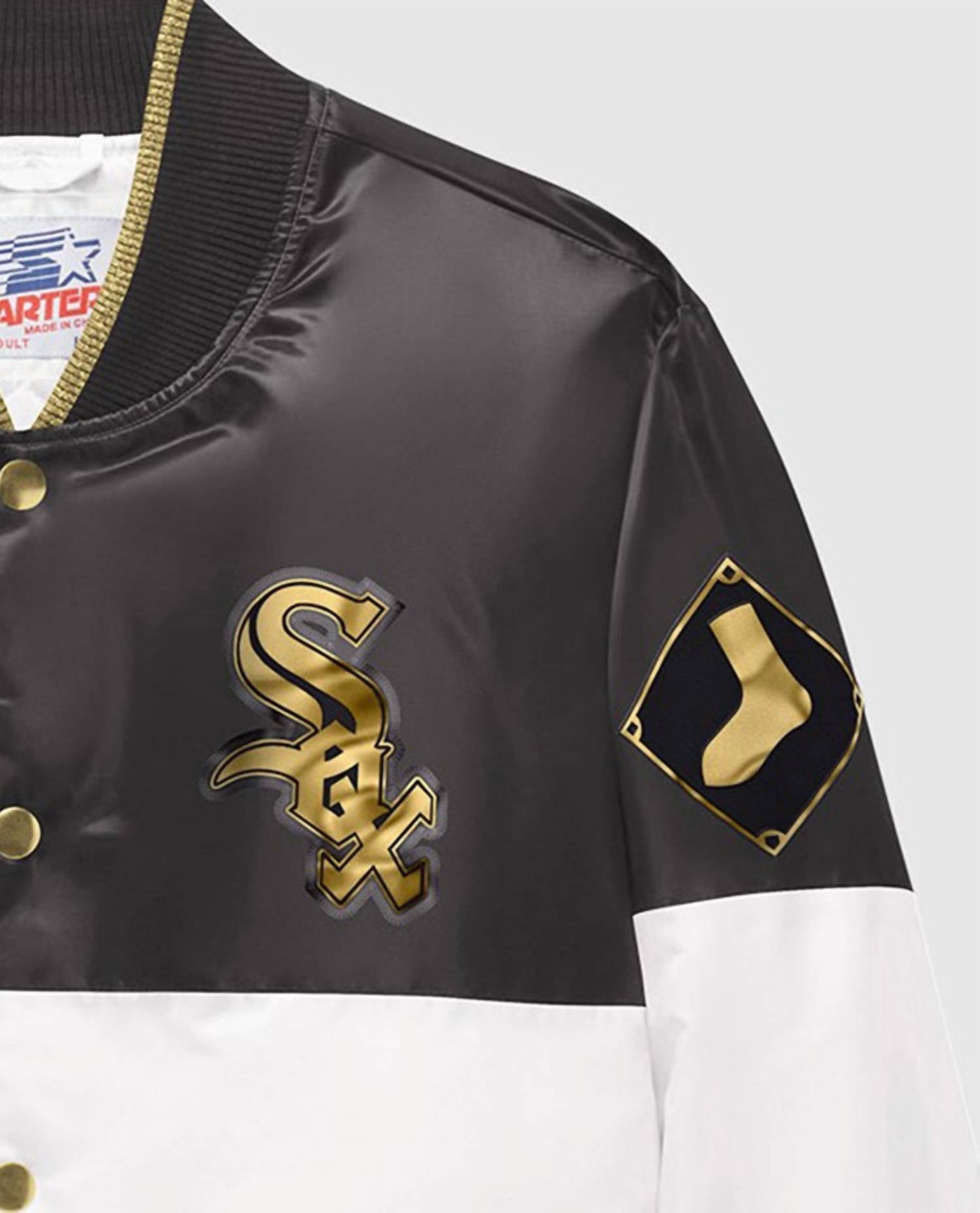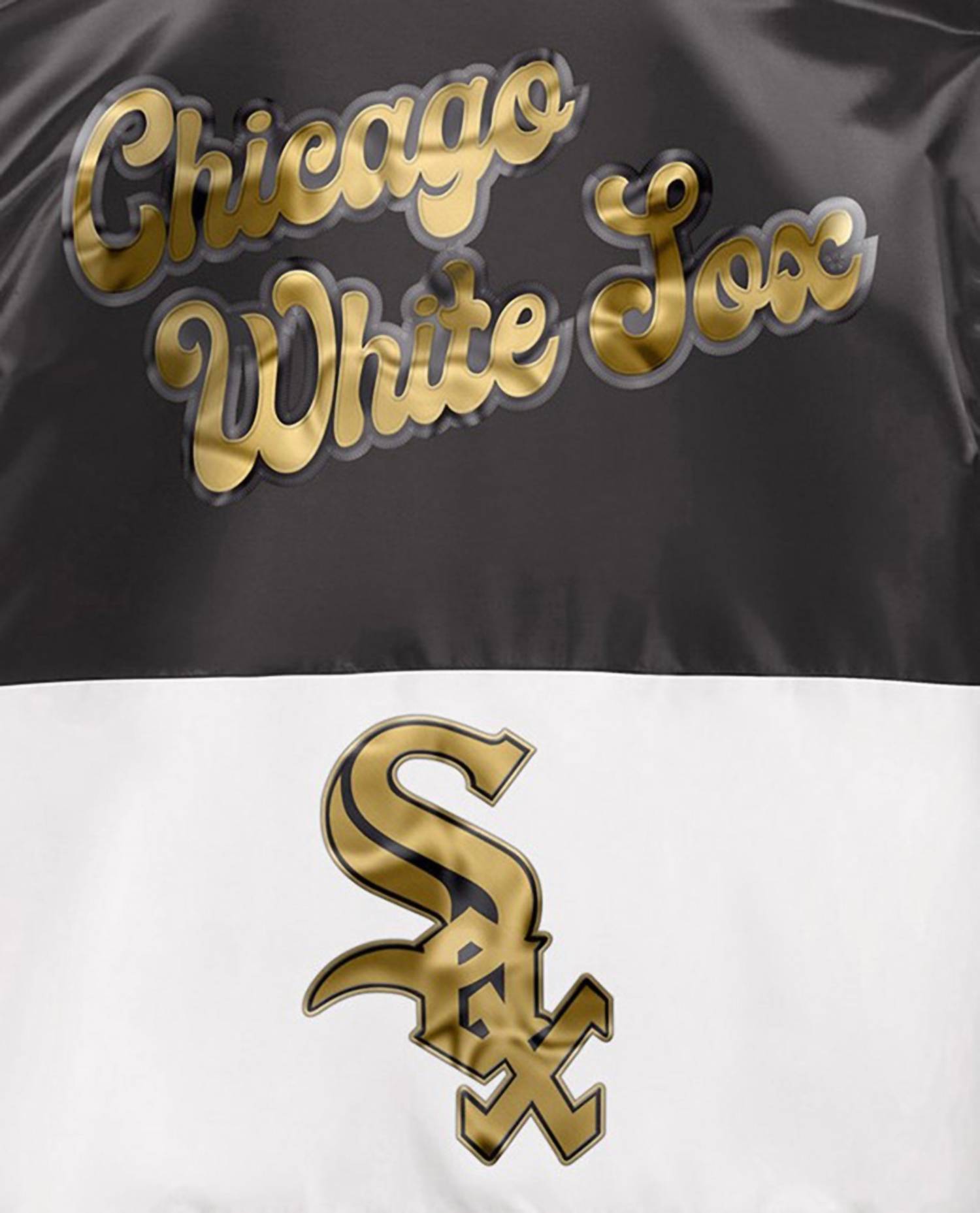 Introducing the Ty Mopkins Chicago White Sox Satin Full Snap Jacket by Starter, a bold statement piece for any fan. This bomber-inspired jacket features a sleek satin finish with long sleeves and a striking black color accented with white stripes. Adorned with gold team logo appliques on the left chest and sleeves, and a team wordmark and logo applique on the back, it celebrates team spirit with style. Closure: Snap closure.