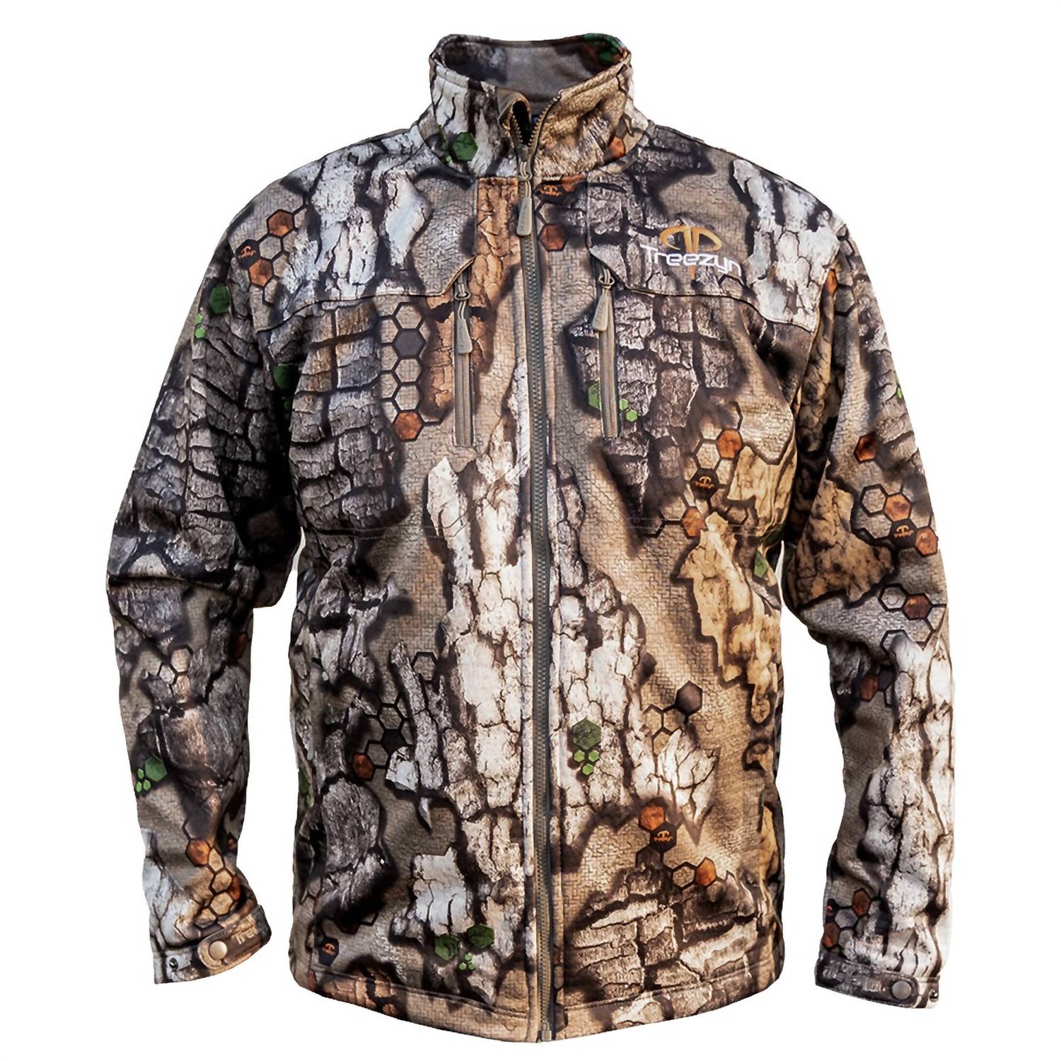 Introducing the Men's Late Season Jacket by Treezyn, designed for the dedicated treestand hunter. This camouflaged jacket features long sleeves and is crafted from 365 GSM bonded microfleece with HexFlow lining, ensuring you stay dry and comfortable. With a reliable zip closure and weighing just 28.8oz (817 grams), it includes two zippered waist and chest pockets, plus an interior pocket with electronic pass-through for practicality. Whether you're out in wind or rain, this water-resistant and windproof jacket has you covered.