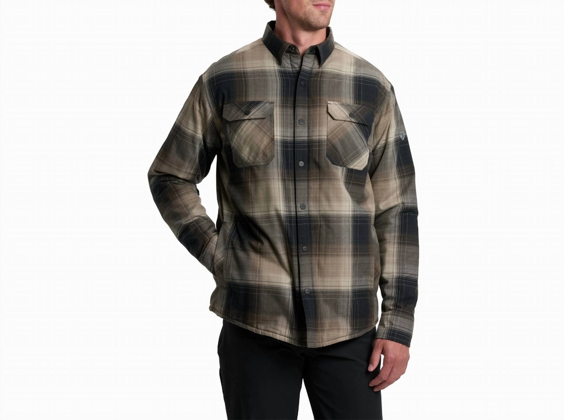 Discover comfort and style with the KUHL Joyryder Shirt Jacket in Sandstorm, perfect for spring vacations and capturing 90s fashion trends. This men's long sleeve jacket features a plaid pattern and a hidden button-down collar, crafted from a cotton blend for ultimate durability and warmth. Designed for everyday performance, it boasts ultra-soft fleece lining with quilted nylon-lined sleeves for easy wear. With a convenient snap-up front, two snap-secured chest pockets, and handwarmer pockets, it ensures practicality. Closure: Button closure. Care: Machine wash and tumble dry.