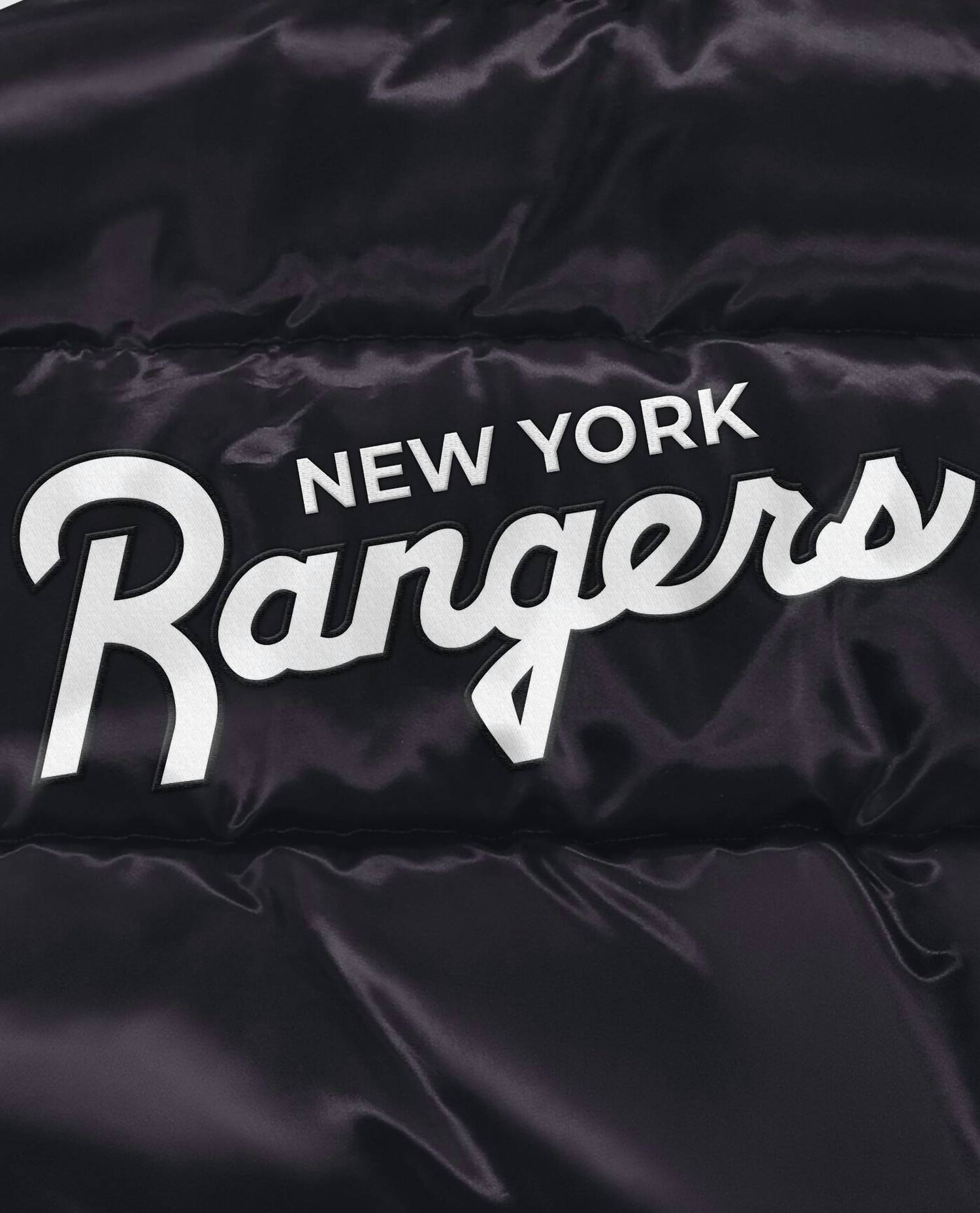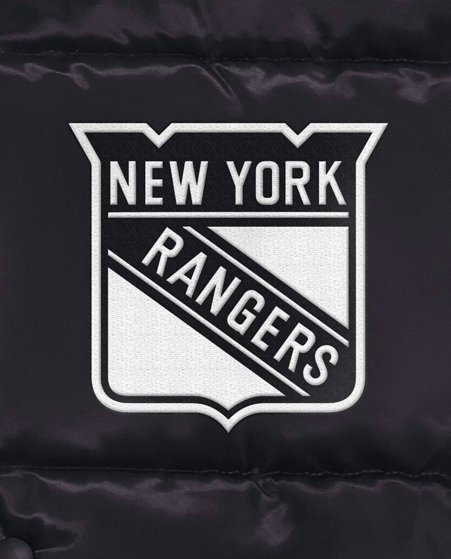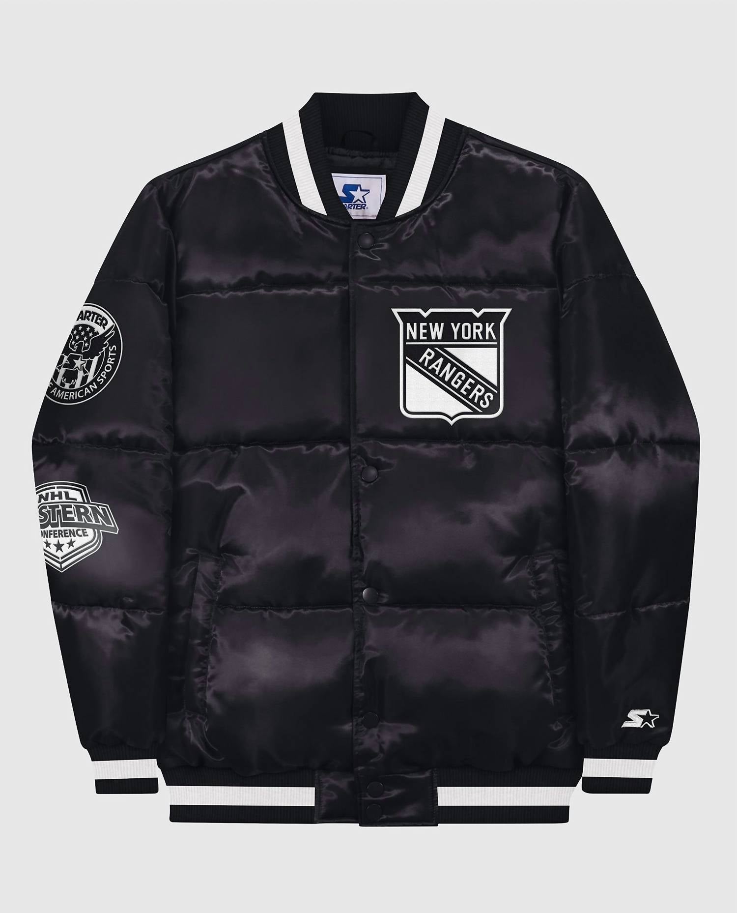 Introducing the Men's New York Rangers Down Fill Puffer Jacket by Starter, a stylish tribute to your favorite team. This long-sleeved jacket is crafted from sleek satin in classic black, adorned with contrast black and white stripes on the elastic collar, cuffs, and waistband. It features a full zip closure and eye-catching team logo and name twill appliques, complete with NHL conference and Starter branded patches for added flair. Stay warm while showcasing your team spirit with this essential sporty piece.