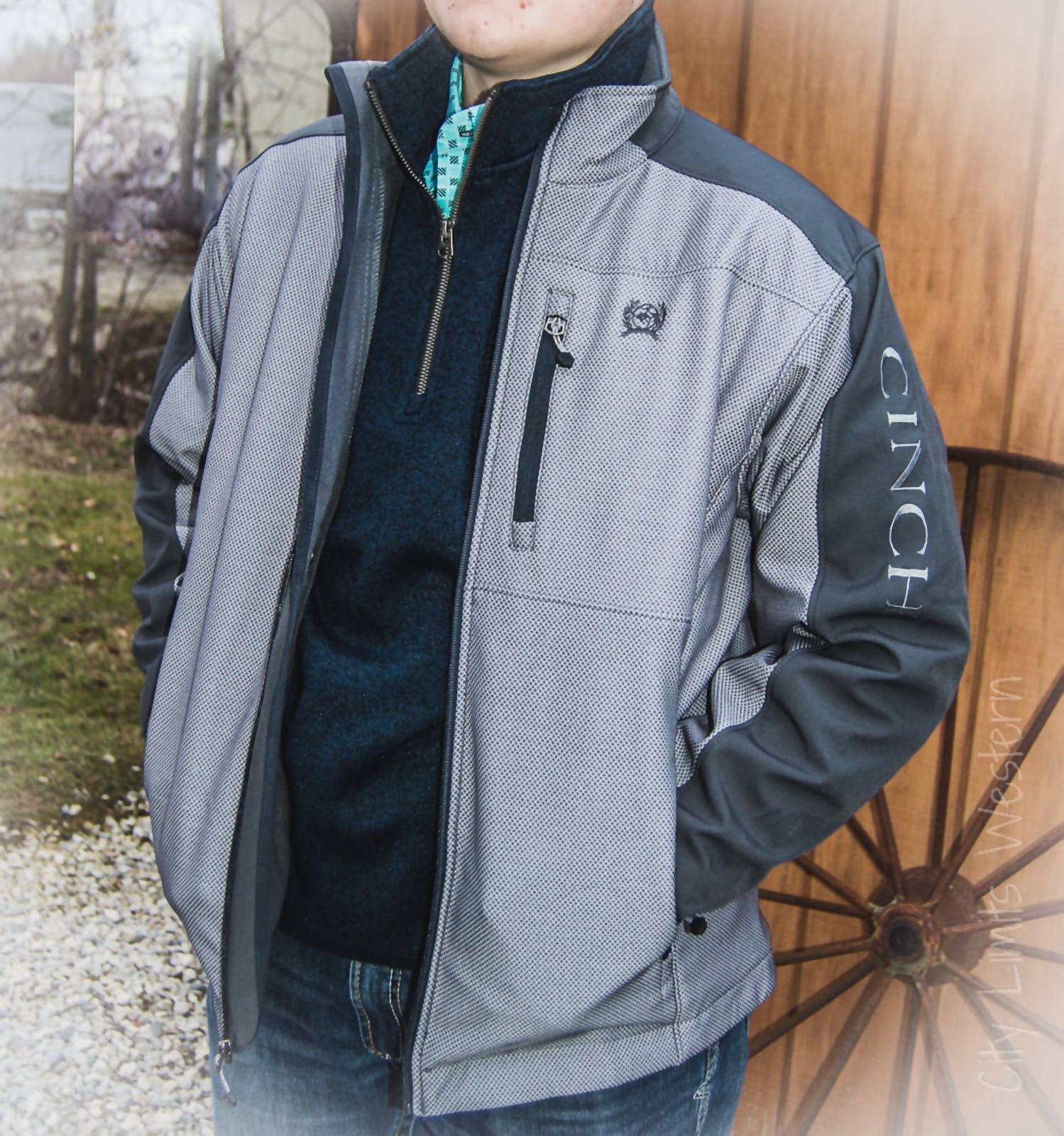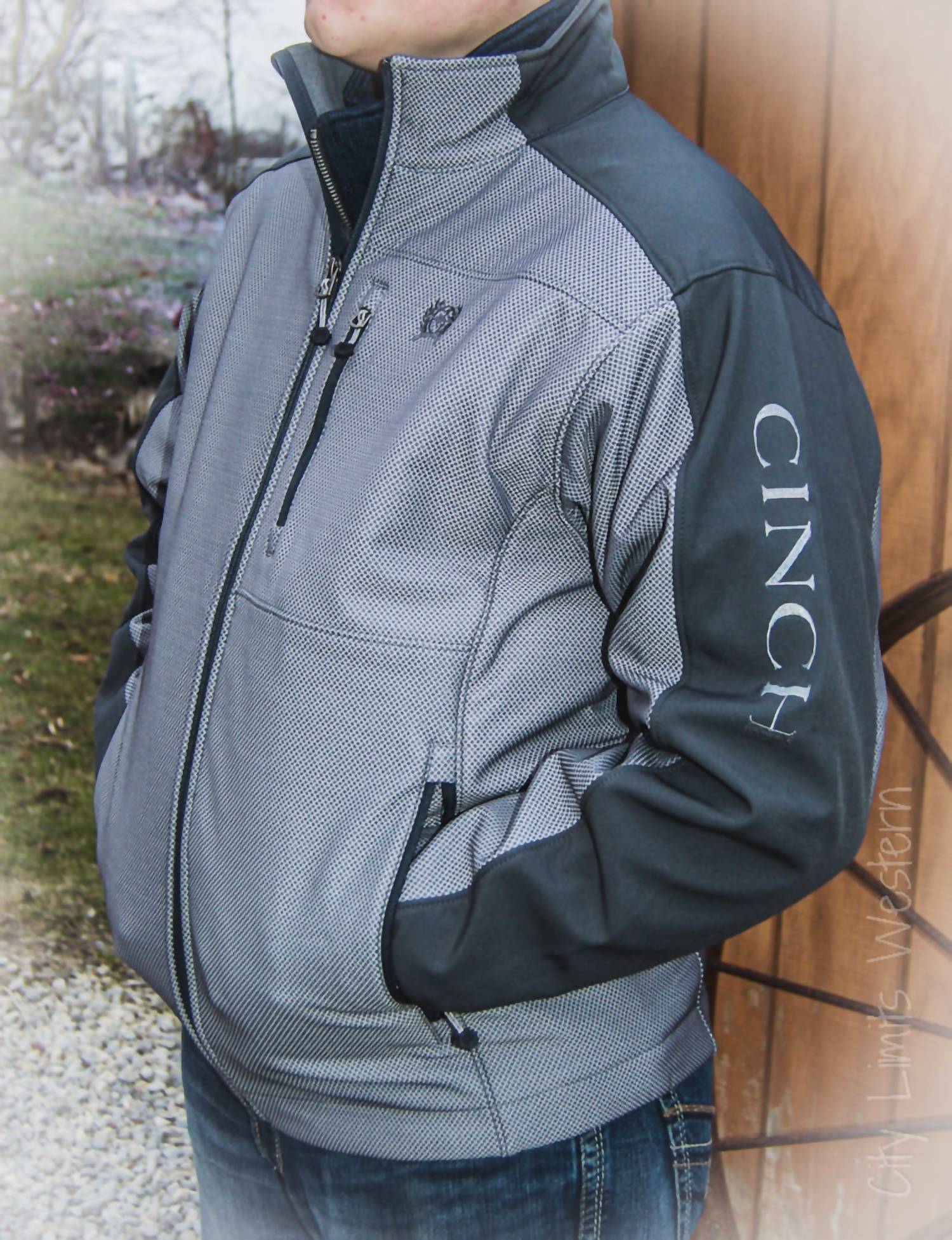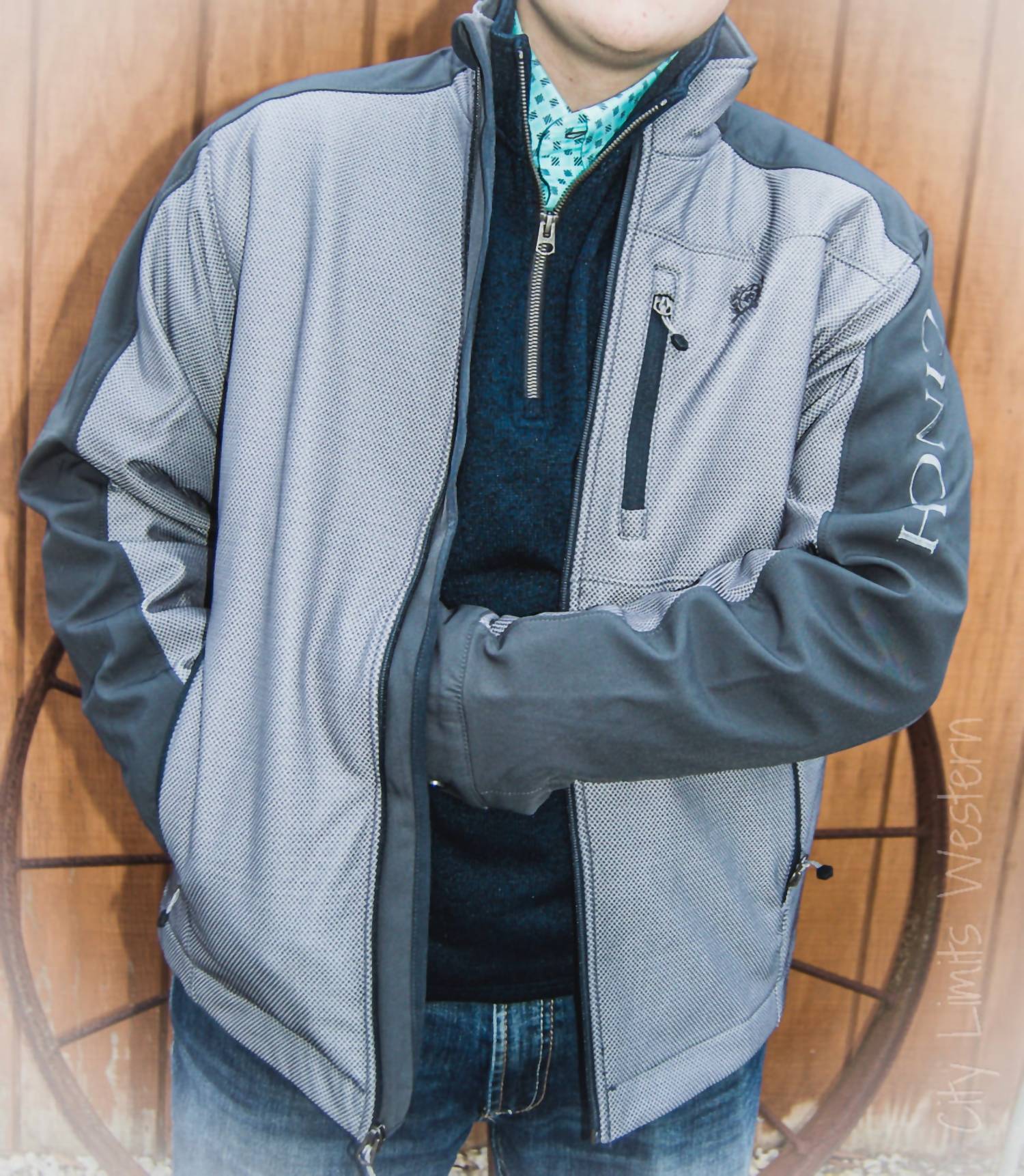 Experience the ultimate in style and protection with the Men's CC Bonded Jacket by CINCH, presented in a dynamic Grey on Grey colorway. This lightweight, solid patterned jacket features long sleeves and a flexible poly-spandex construction with a mock neck design. It includes multiple practical elements like dual concealed inner pockets, zip closure, and zippered exterior pockets, all enhanced by a Durable Water Resistant (DWR) finish. Perfect for winter, this jacket does not include specific wash or dry instructions, so handle with care.