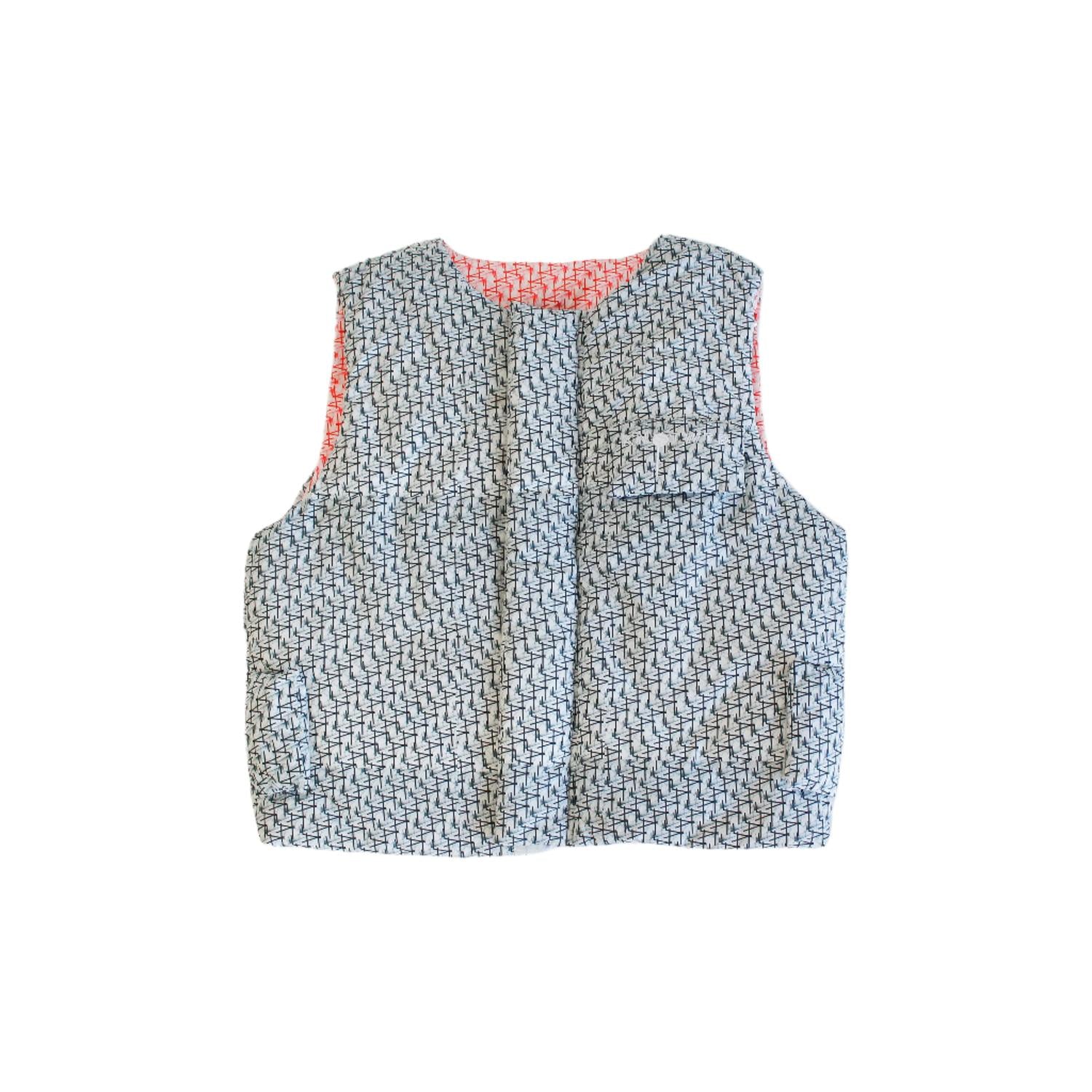 This reversible puffer jacket features a sleeveless design with a crewneck and zip closure, offering two distinct styles for versatility. Crafted from sustainable materials, it provides comfort and warmth for both chilly and rainy days.