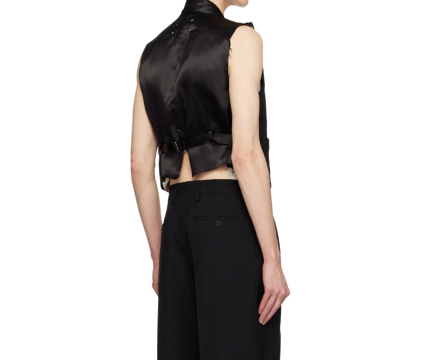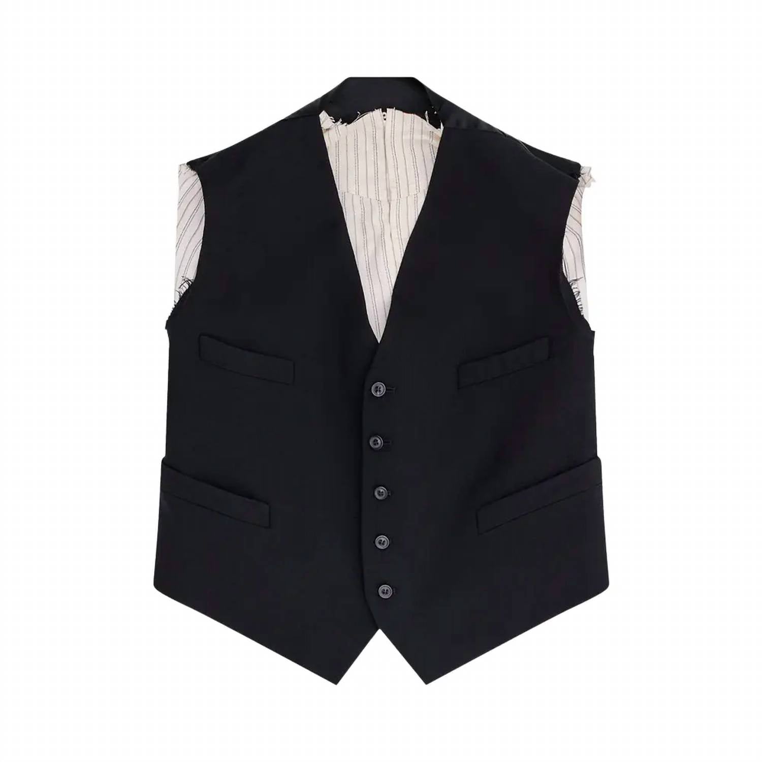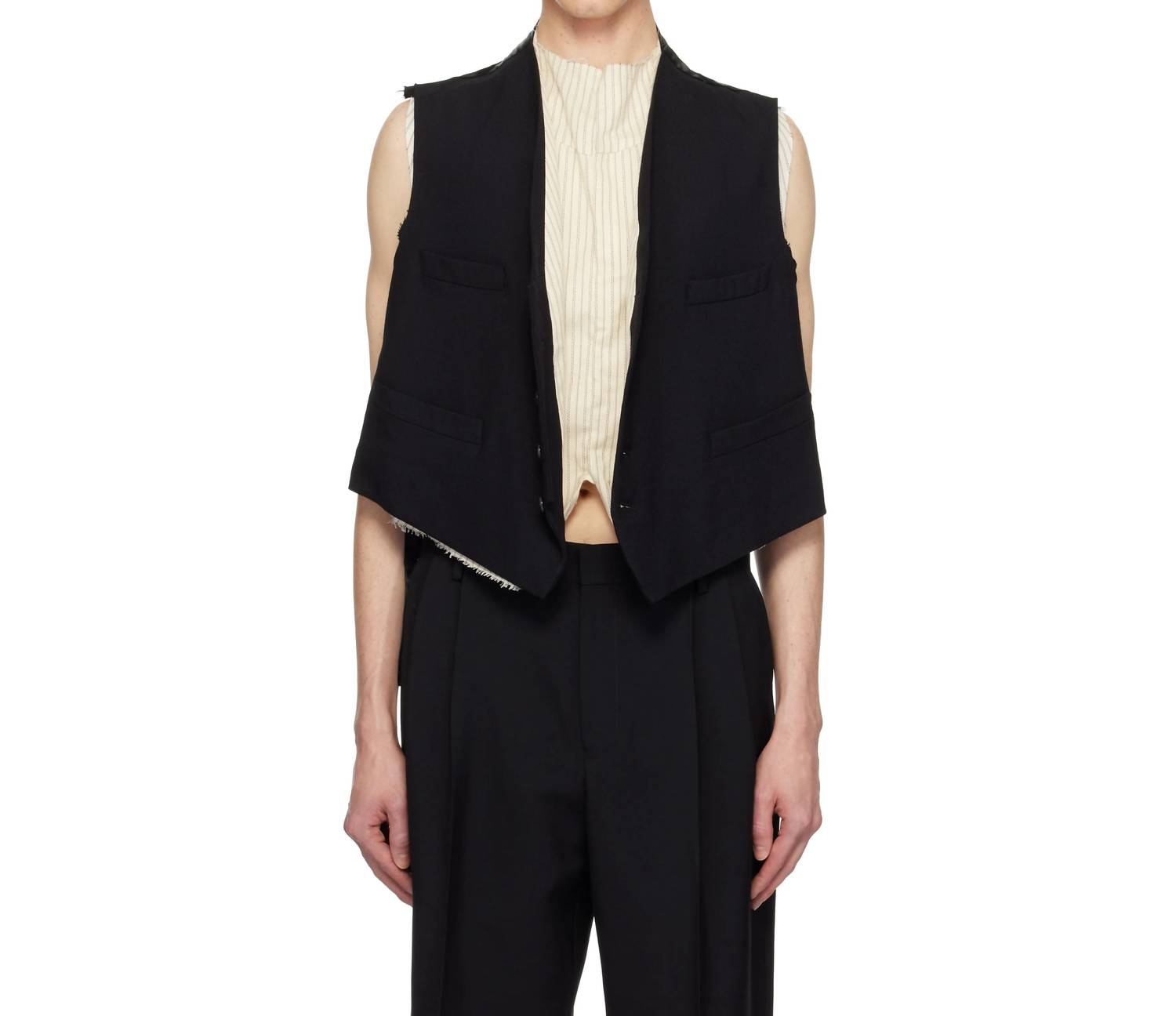 Discover refined elegance with the Maison Margiela Wool Gilet, expertly crafted in Italy from 100% virgin wool for a luxurious yet edgy look. This sleeveless gilet features a concealed button closure and is adorned with a distinctive layered design, distressed finish, and vertical stripe pattern. The high neck and asymmetric hem add a modern twist, while functional details include two chest welt pockets and two front welt pockets, highlighted by the signature four-stitch logo and a rear martingale. Care for this piece by dry cleaning only to maintain its pristine condition.
