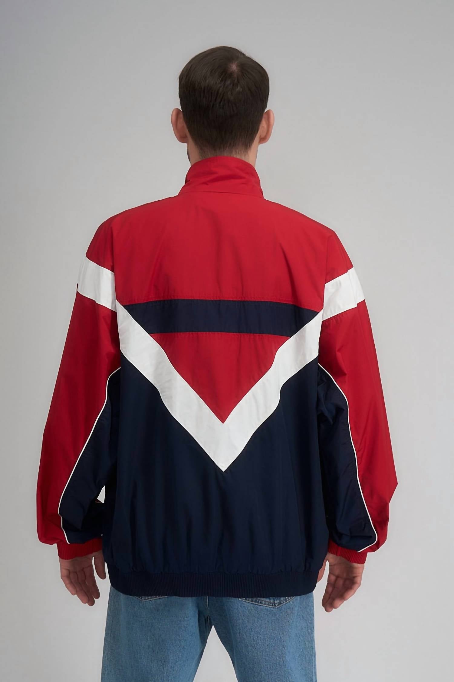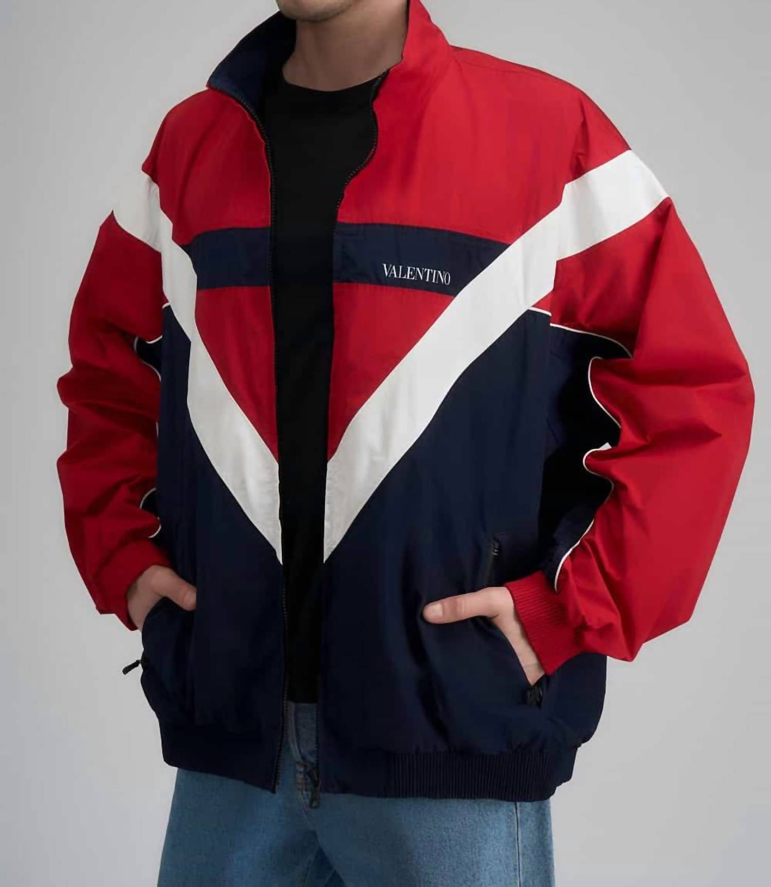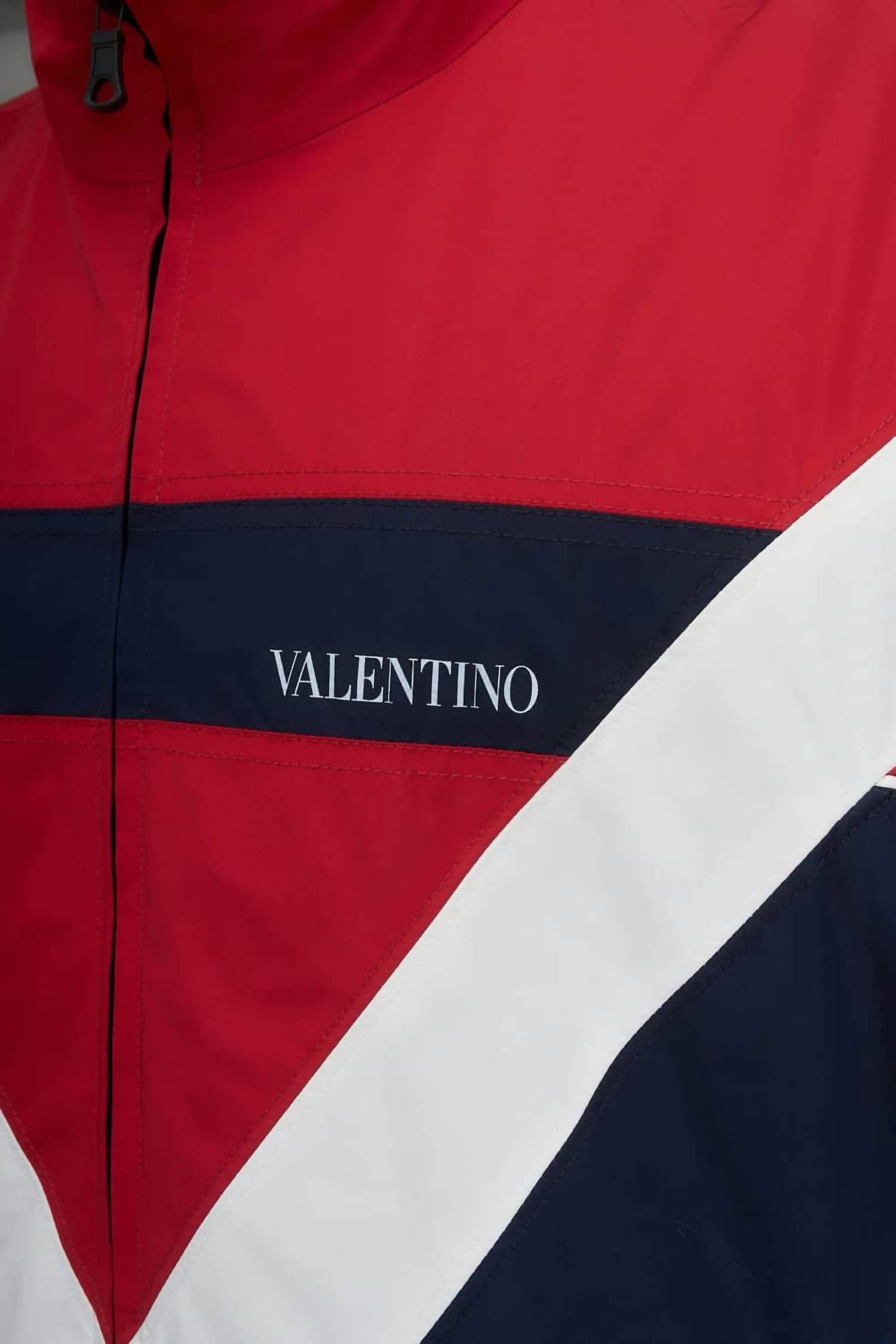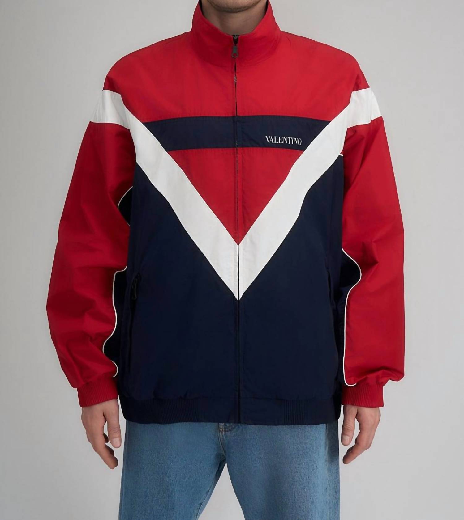Introducing the Valentino Zip-up Jacket, an eye-catching windbreaker crafted with a stylish color block design in red, white, and navy blue. This men's jacket features long sleeves, a stand collar, and convenient front zip closure, enhancing its graphic appeal. Composition: 62% Polyester, 38% Cotton. Made in Italy. Equipped with two side zipped pockets and stylish elasticated cuffs and hem, this piece is a perfect addition to your fall wardrobe. Dry clean only. Model is 183 cm and wearing size IT 58.