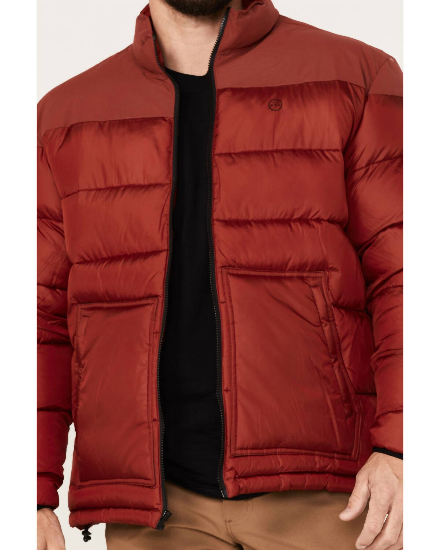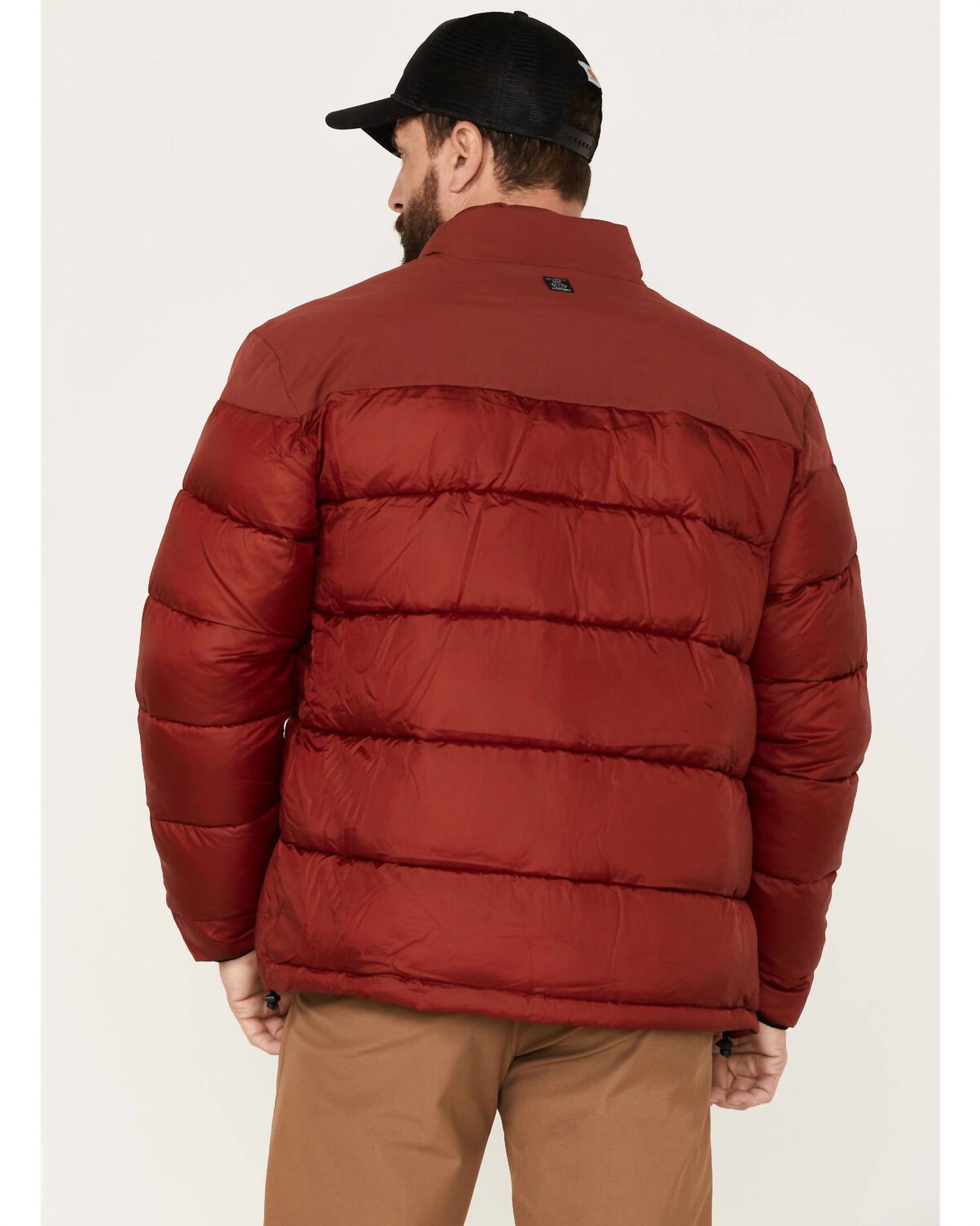 Introducing the All-terrain Classic Zip-front Puffer Jacket by Wrangler, expertly crafted for your winter hiking adventures. This men's puffer jacket in a rich burgundy hue features long sleeves and a practical zip closure, designed to keep you warm and stylish with its minimalist, solid pattern. Made from durable polyester, it has a functional mockneck and convenient pockets for added utility. Perfect for tackling the elements in style.