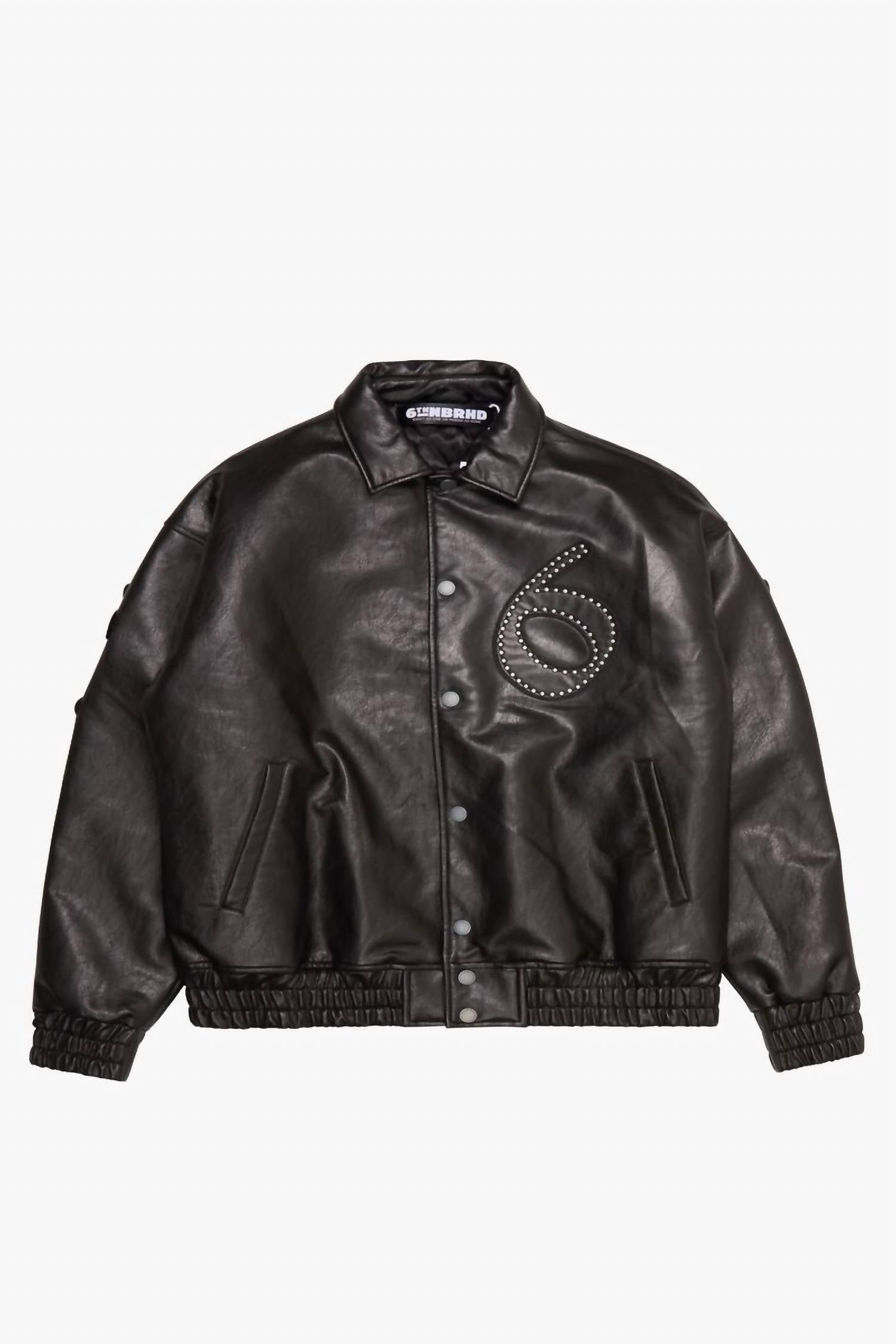 Introducing the Men's "Star Studded" Leather Jacket by 6TH NBRHD, a striking piece in timeless black. This long-sleeve bomber and varsity style jacket is crafted from patterned faux leather and features a practical button closure. With a classic collar and handy pockets, it’s perfect for winter outings. Care instructions are not specified.