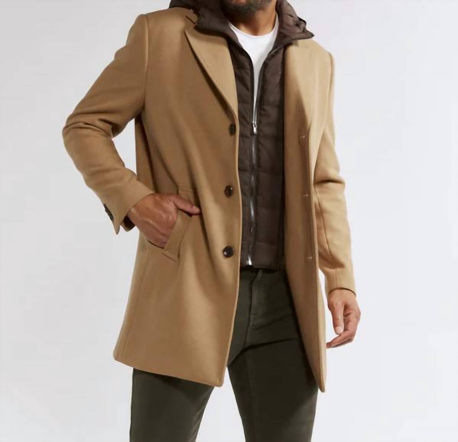 Introducing the Midtown Modern Overcoat by 7Diamonds, a sophisticated choice in a timeless camel hue perfect for versatile occasions. This men's overcoat features long sleeves and a sleek solid pattern, crafted from a 40% recycled wool and 60% polyester blend with a 100% polyester lining. Designed for both style and warmth, it includes a removable zip-out puffer hoodie and a button closure, complemented by interior welt pockets for convenience. Care is professional dry clean only, ensuring this coat remains a staple in your wardrobe season after season.