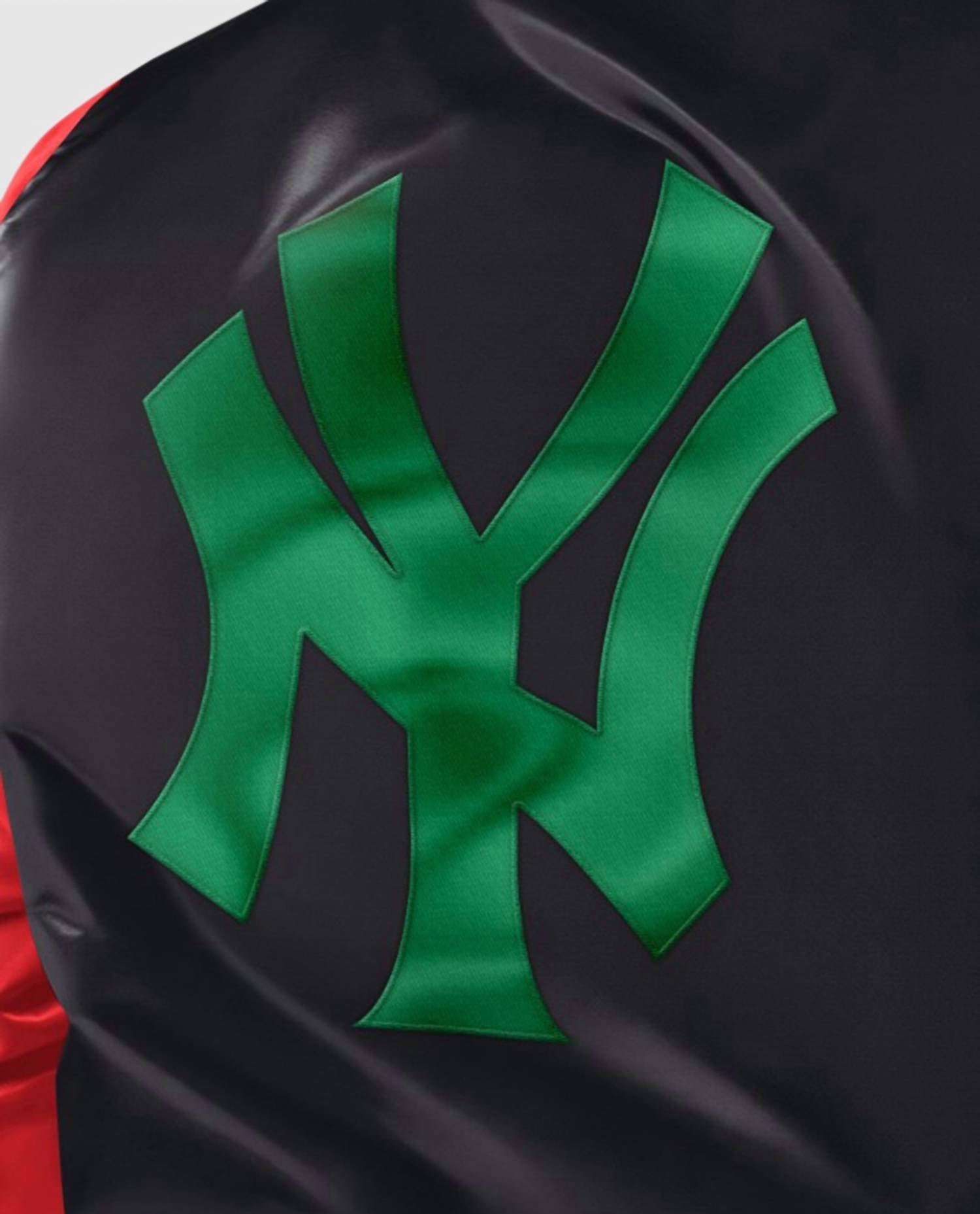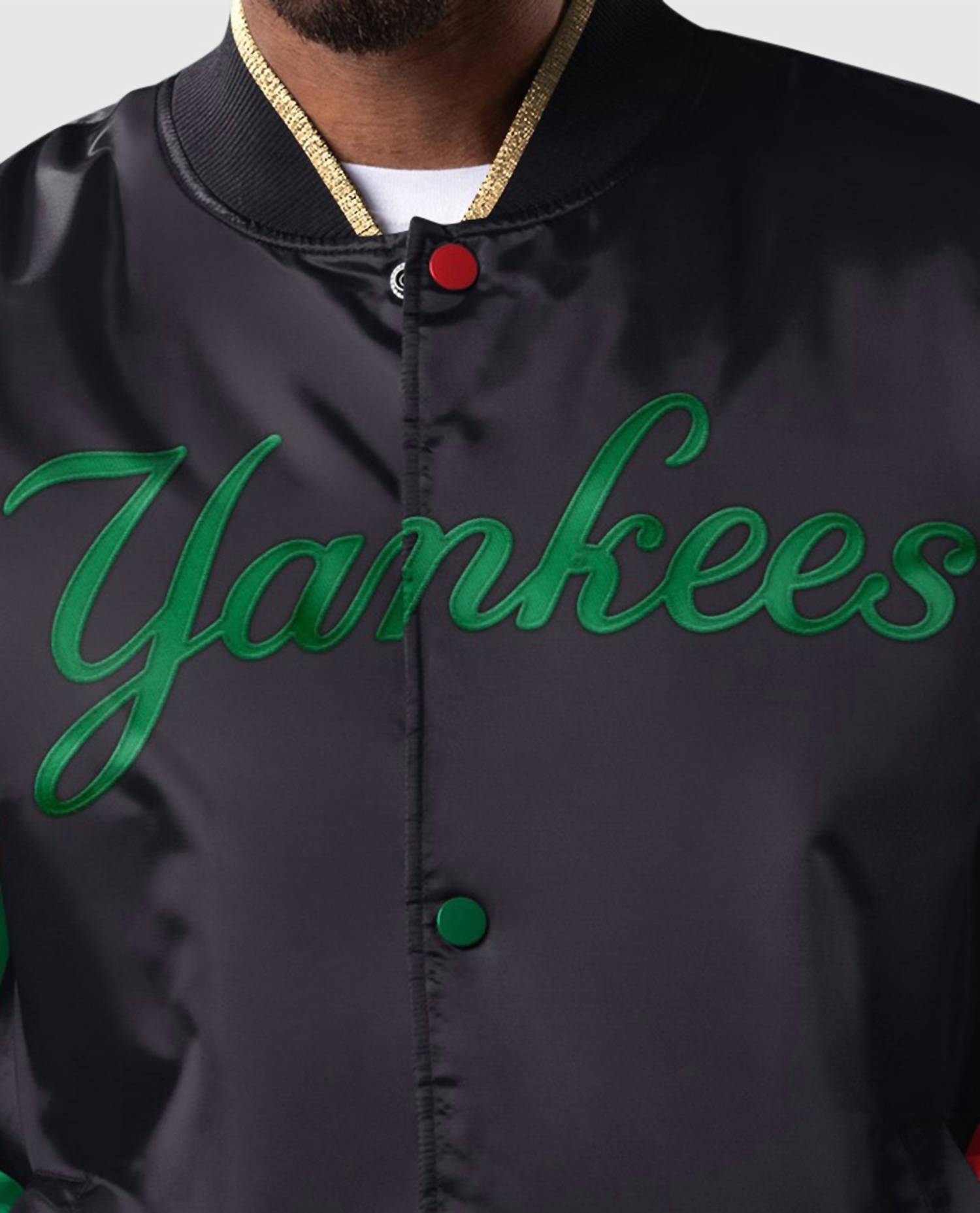 Celebrate Black History Month with the Limited Edition Ty Mopkins x Starter Collab Satin Jacket, crafted for the true New York Yankees fan. This men's bomber and varsity jacket features long sleeves with contrasting red and green, and a snap closure for added style. The glossy black satin exterior is adorned with a team word mark and logos in twill applique, completed by ornate metallic trim on the collar, cuffs, and wristband. With a quilted lining and an interior pocket stamped "Till Victory Is Won" with Ty Mopkins' signature, this jacket merges heritage with modern flair.