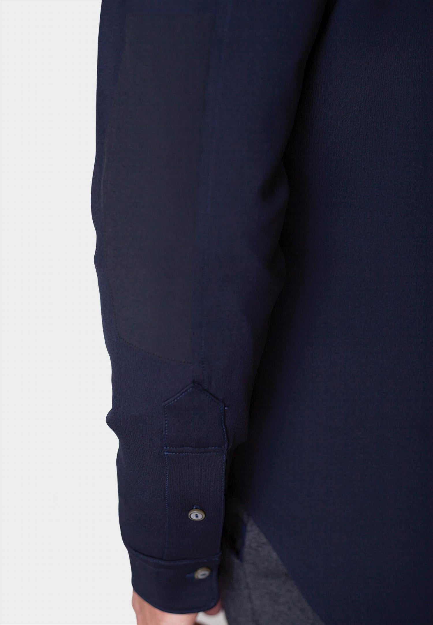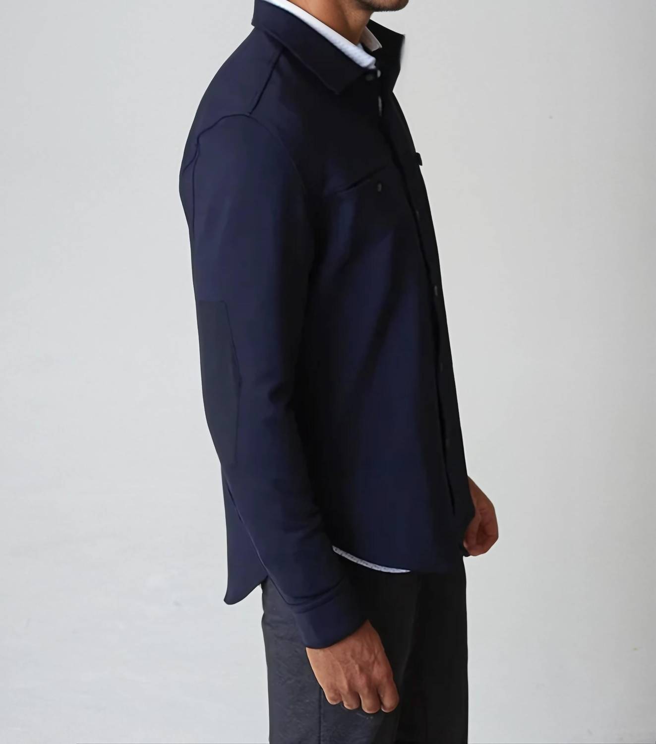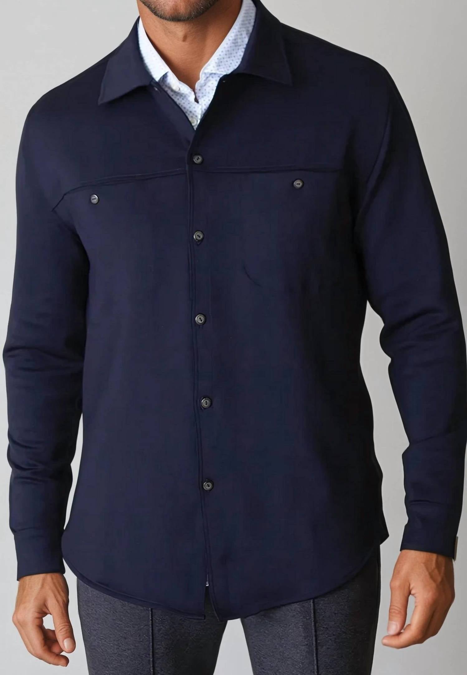 Introducing the City Chief Petty Officer Shirt Jacket by Buki, a stylish blend of shirt and jacket in a sophisticated navy tone. Featuring long sleeves and made from high-tech fabric composed of 92% Micro Poly and 8% Spandex, it offers a wrinkle-resistant, four-way stretch, and moisture management system for ultimate comfort and mobility. Designed with a button closure and two front pockets, this piece is perfect for a minimalist fall wardrobe and is effortlessly machine washable. Model is wearing size L and stands at 6'1", making it ideal for engagement events and New Year's Eve celebrations.