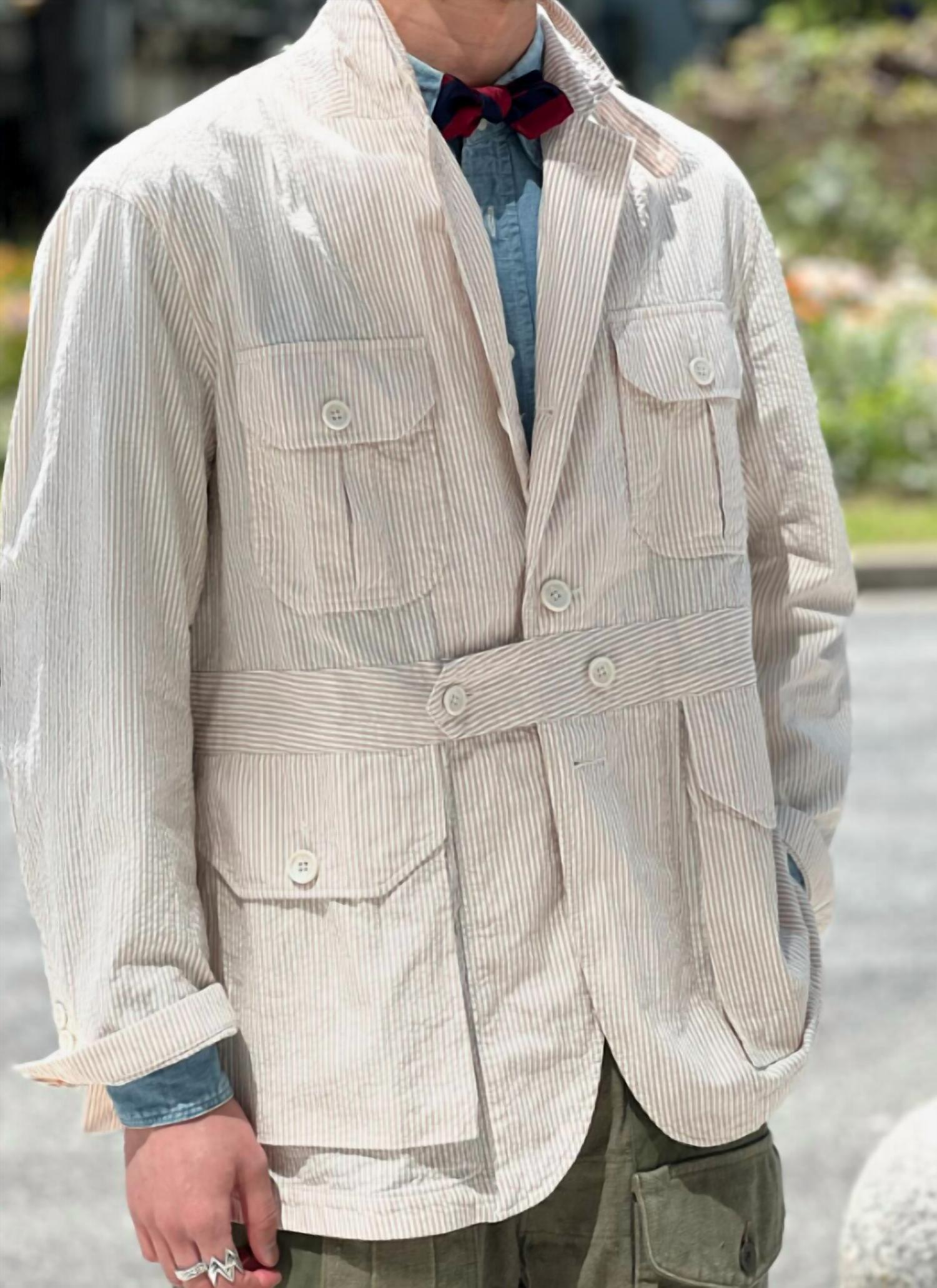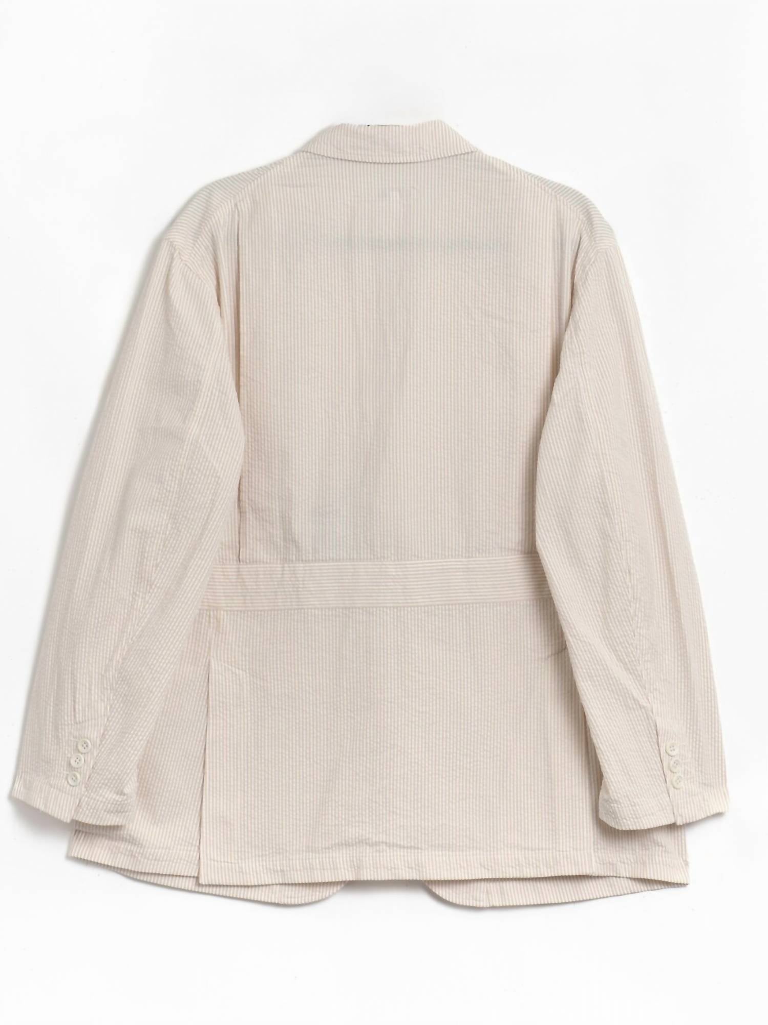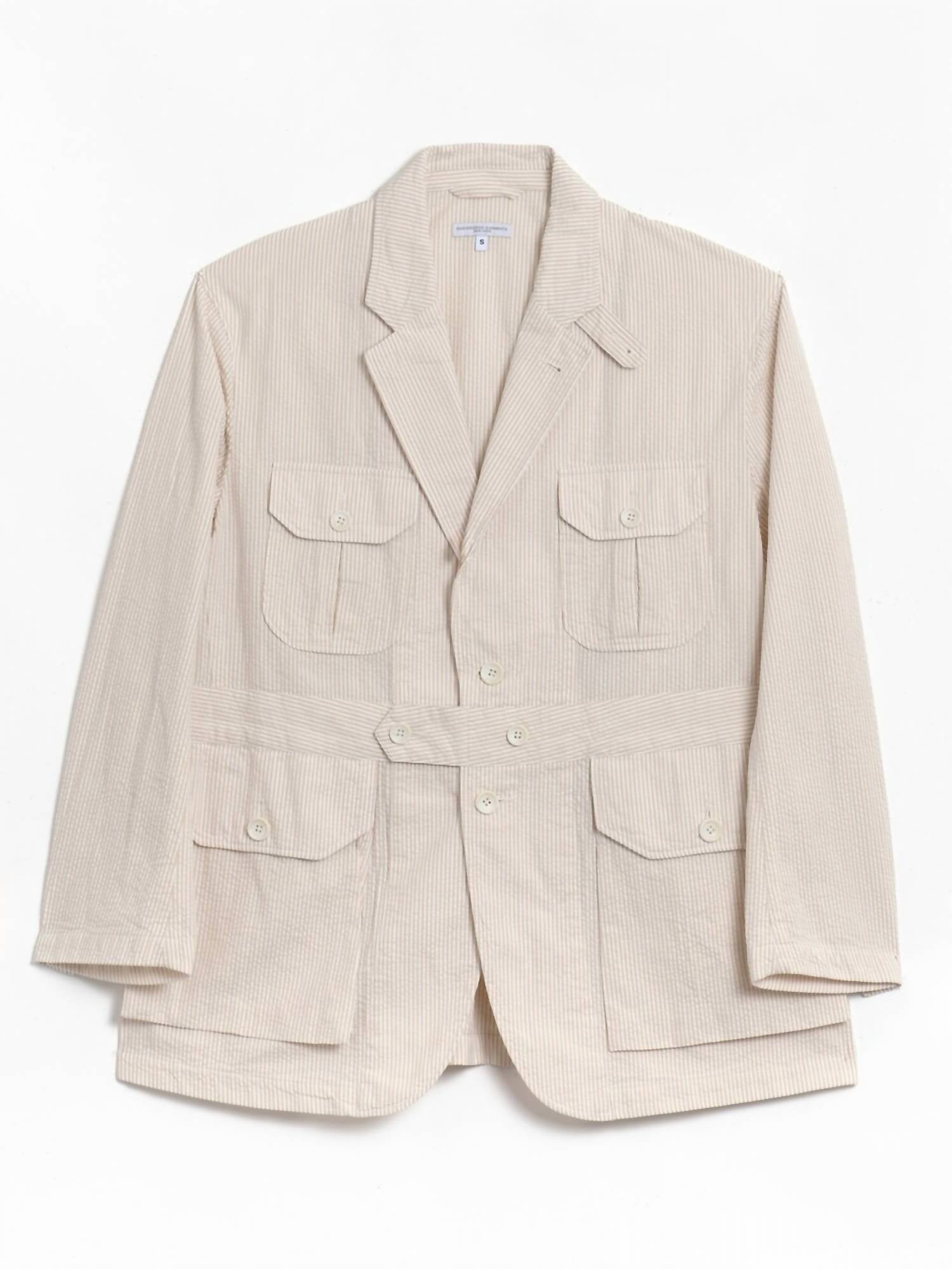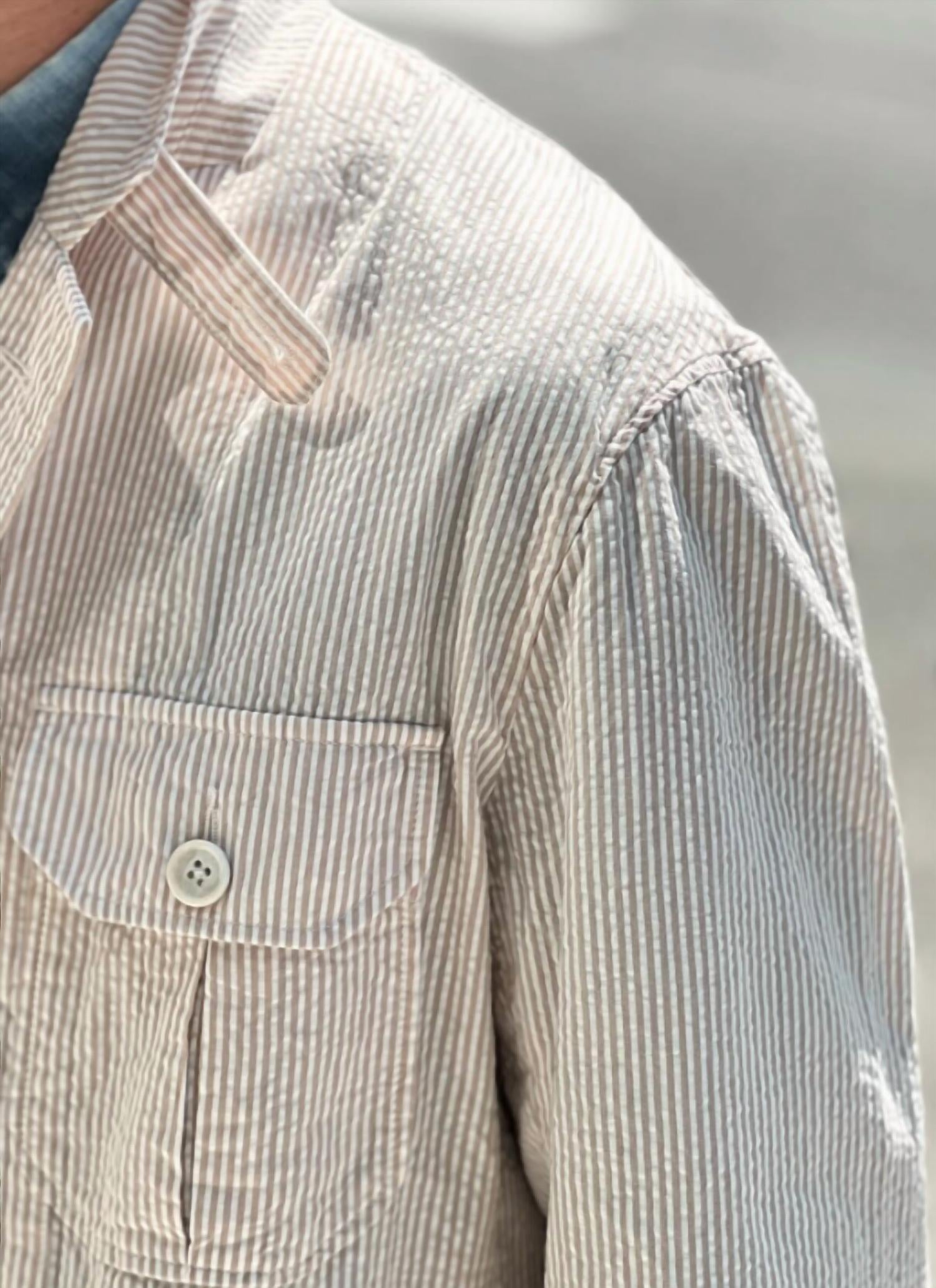The Folk Seersucker Stripe Jacket by Engineered Garments is made of 100% cotton seersucker fabric in beige with a subtle stripe pattern. It features a button closure and four patch pockets on the front for a utilitarian look. The jacket has a relaxed fit with long sleeves and a classic collar. It is made in the USA and offers lightweight, breathable comfort suitable for warmer weather.