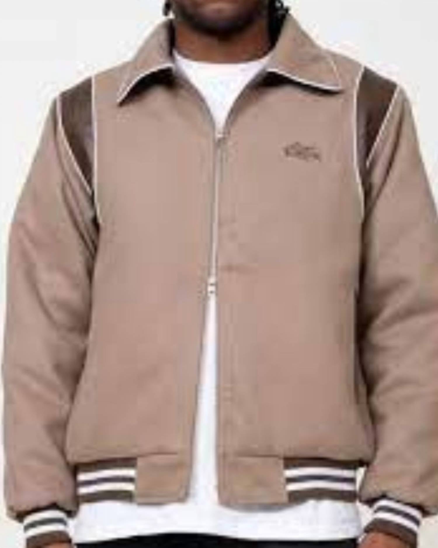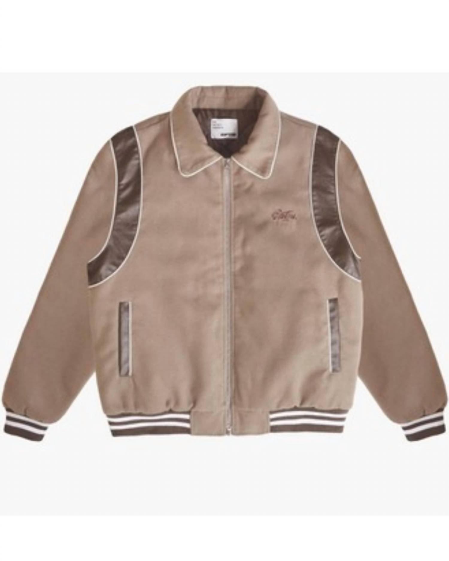 The EPTM 23 Two-way Zipper Varsity Jacket is an essential streetwear piece featuring long sleeves and a cozy padded lining for comfort. Crafted entirely from 100% polyester, the mocha-hued jacket showcases faux wool and leather textures enhanced by elegant piping accents. Designed with versatility in mind, it includes banded rib accents, two welt pockets with faux leather detailing, and an additional inside chest pocket. Origin: Not specified. Closure: Two-way zip closure. Care instructions: Machine wash.