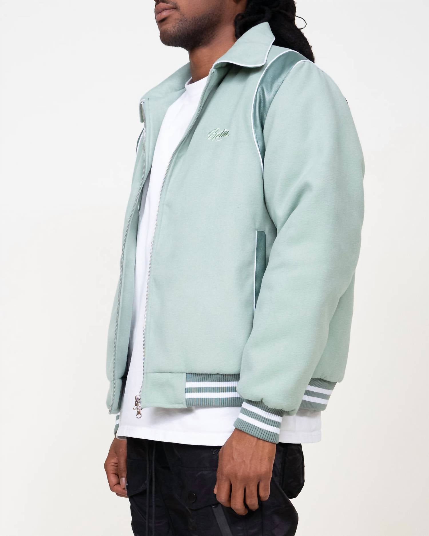 Embrace timeless style with the EPTM 23 Two-way Zipper Varsity Jacket. This men's bomber-style jacket in sage features long sleeves, a blend of faux wool and leather, and is crafted from 100% polyester with a padded lining for added comfort. The versatile two-way zipper closure, welt pockets with faux leather detailing, and ribbed accents offer functionality and style. Suitable for machine wash, this jacket effortlessly combines monochrome elegance with a relaxed fit, making it a back-to-school essential.
