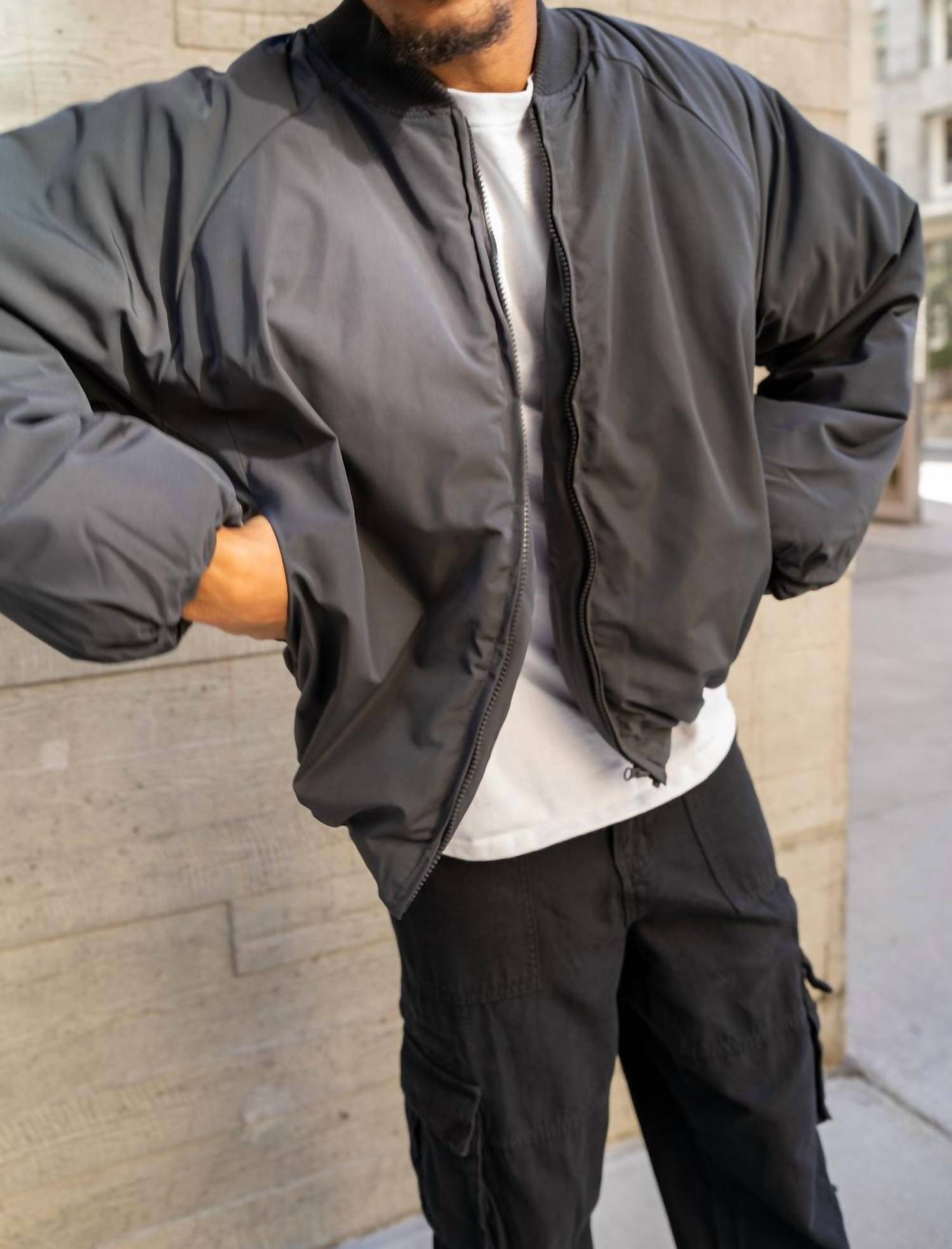 Introducing the Cropped Bubble Bomber Jacket by EPTM, a stylish reinvention of the classic bomber in a solid charcoal hue. This men's jacket features long raglan sleeves and a traditional ribbed collar, crafted entirely from polyester with a fully lined interior. It is designed with a slight crop and a back pleat for modern sophistication. Closure: Zip. Care: Machine wash. Perfect for summer streetwear, this piece includes pockets for added functionality.