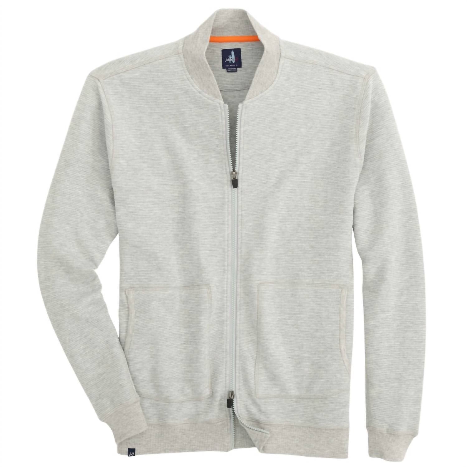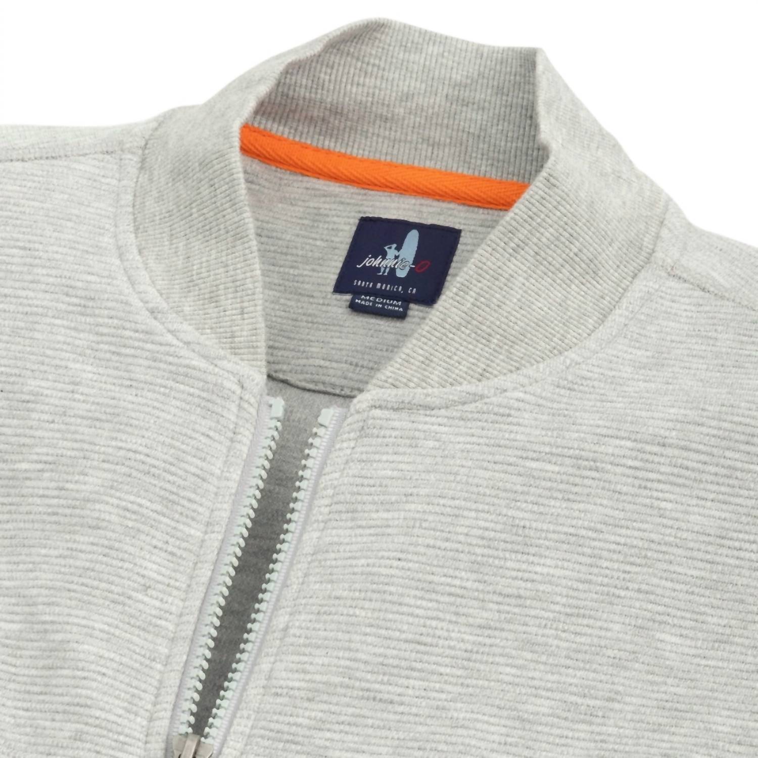 Elevate your travel wardrobe with the Decker Baseball Jacket by JOHNNIE-O, a minimalist classic in light grey designed for men's fall fashion. This long-sleeve jacket showcases a baseball collar and solid pattern, crafted from 100% cotton Ottoman stitch for a cozy feel. The 2-way zip closure offers versatile styling, while the patch side pockets and JO patch on the bottom cuff add subtle detail. Made for machine wash and tumble dry, this jacket combines ease of care with a chic aesthetic.