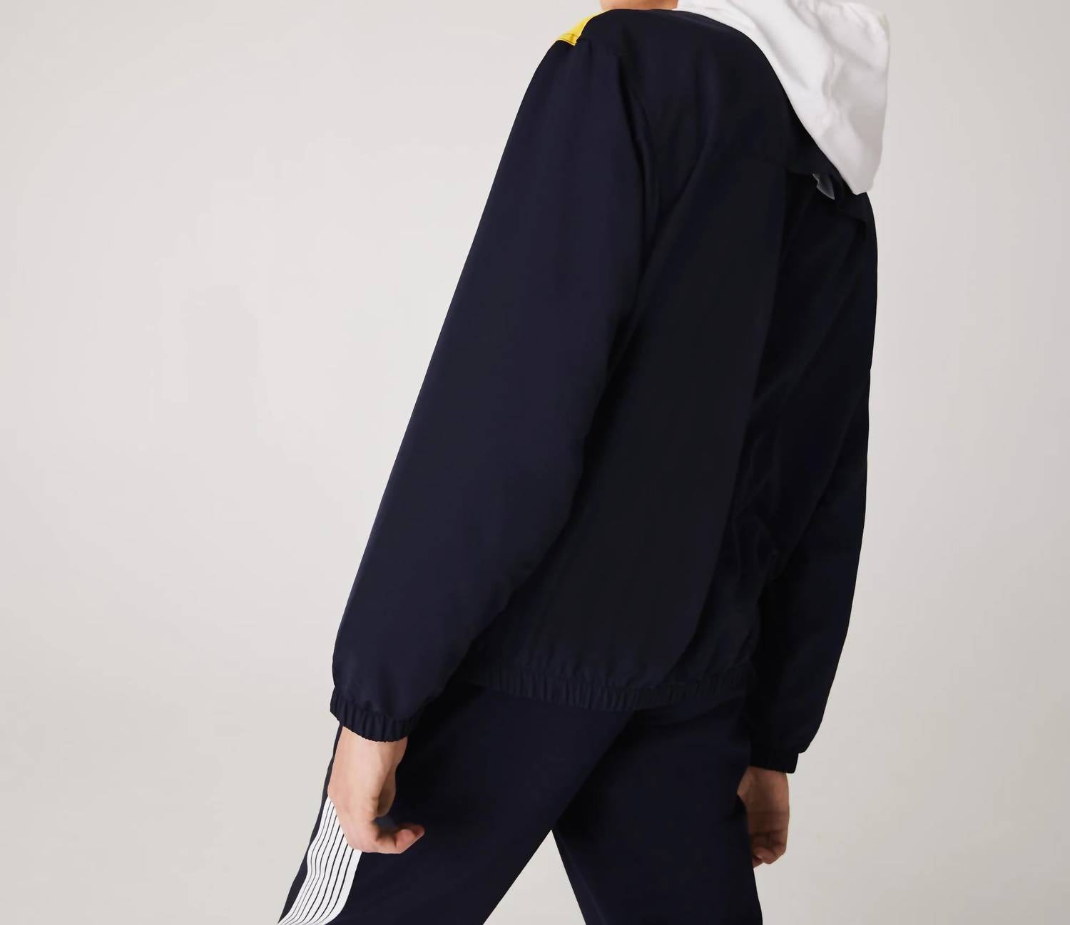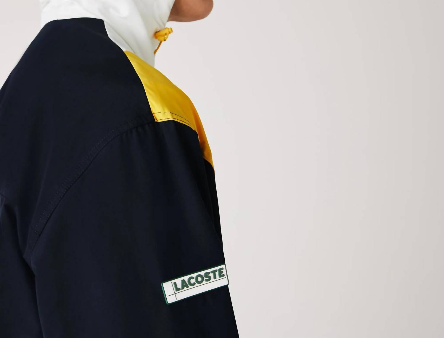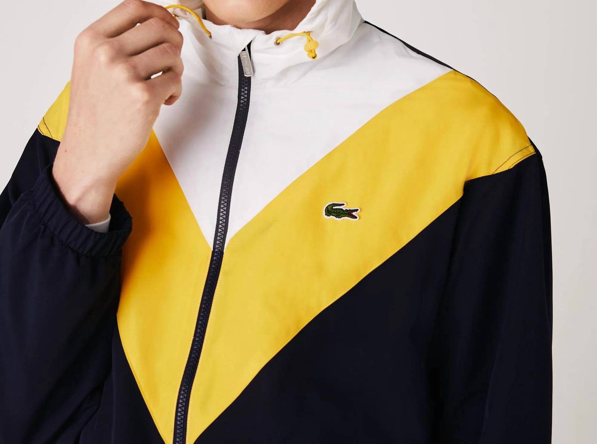 Introducing the Lacoste Colorblock Hooded Full-zip Jacket, a striking addition to any winter wardrobe. Crafted with 100% polyester, this men's performance jacket features a bold navy, yellow, and white colorblock design. The long sleeves and elastic cuffs and hem provide comfort, while the adjustable hood offers practicality. With its zip closure and crocodile logo detail, it pairs effortlessly with athleisure outfits. Care: Hand wash and line dry.