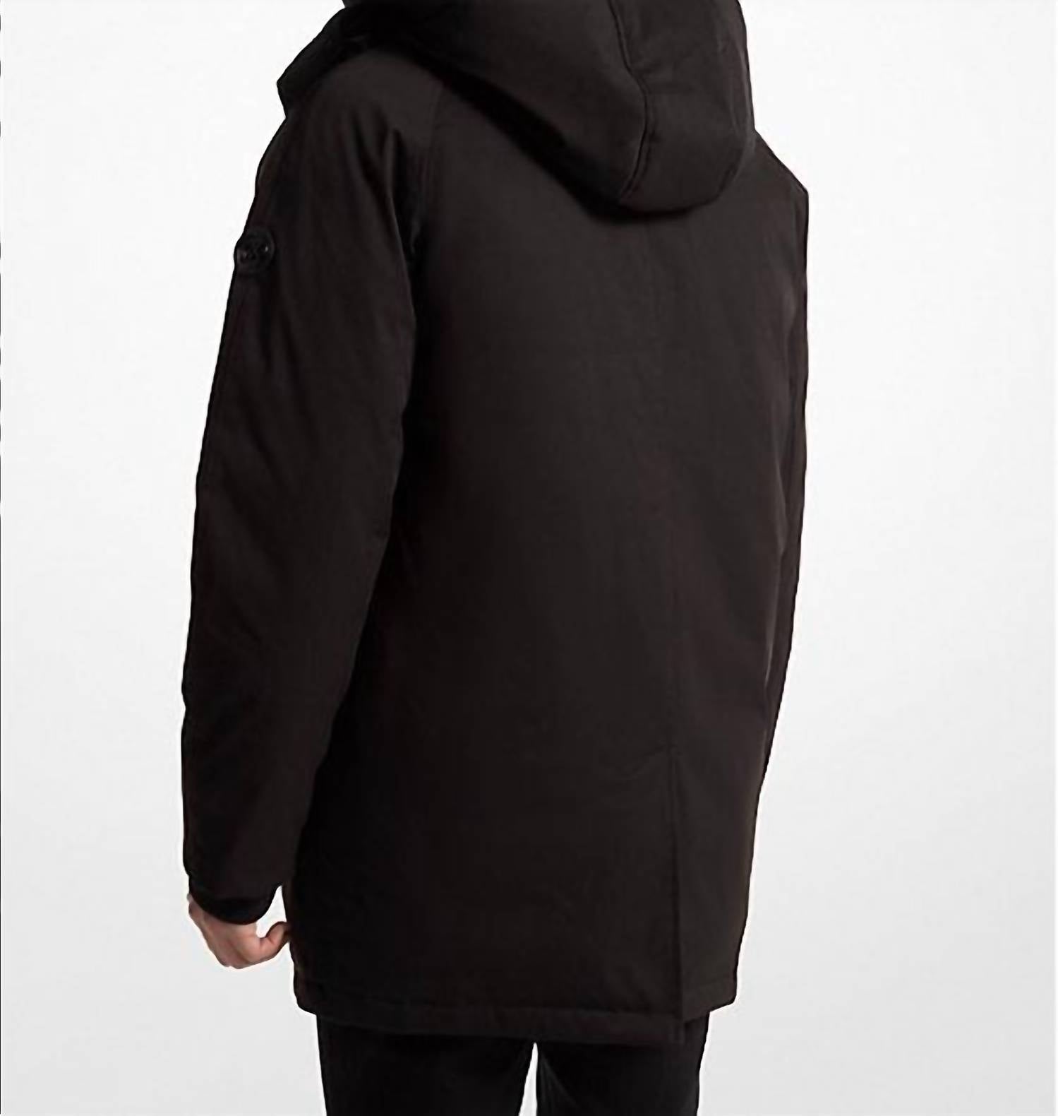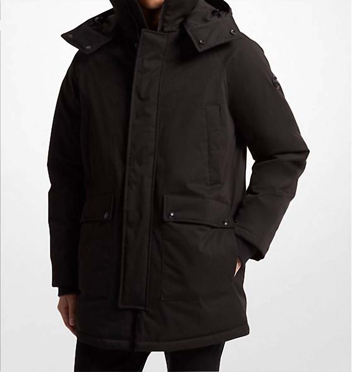 Introducing the Michael Kors Melrose 2-In-1 Woven Parka, a stylish black winter essential for the modern man. This long-sleeve parka is composed of 100% polyester and expertly crafted in China. Featuring a full front zip closure with a storm flap, it provides excellent weather protection and adaptability with its removable inner jacket. Care for this versatile piece by machine washing at a maximum of 30°C, tumble drying on low heat, and ironing on a low setting, while avoiding bleach and dry cleaning.