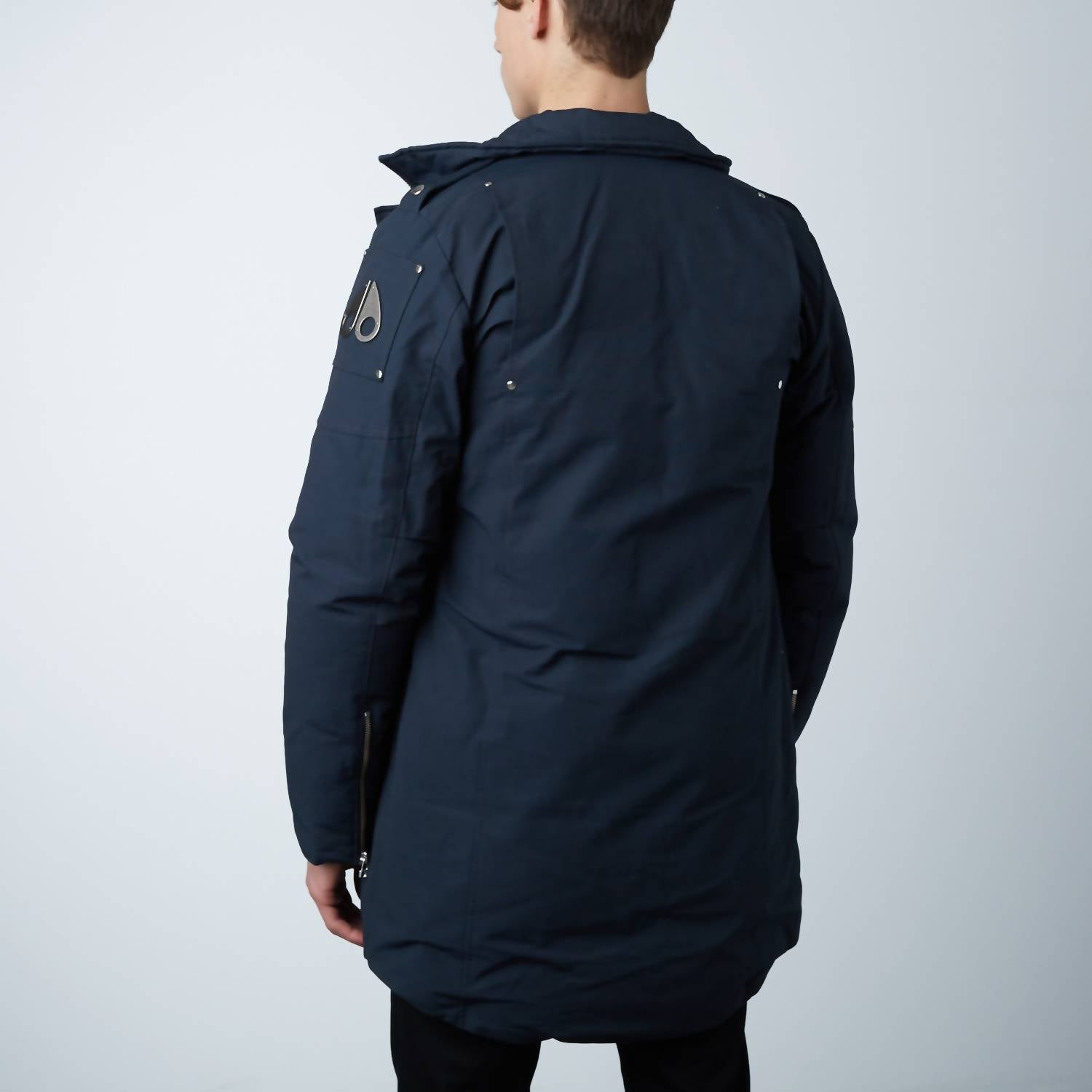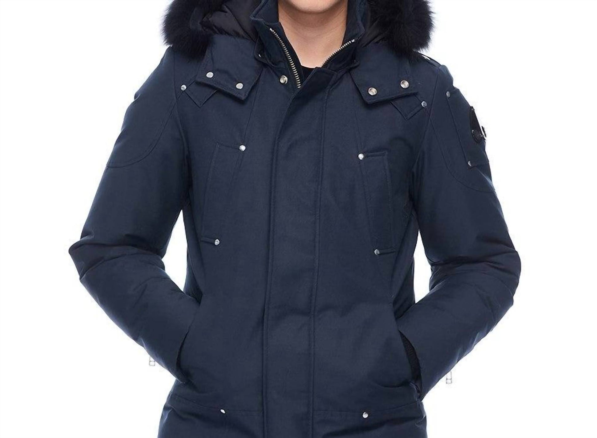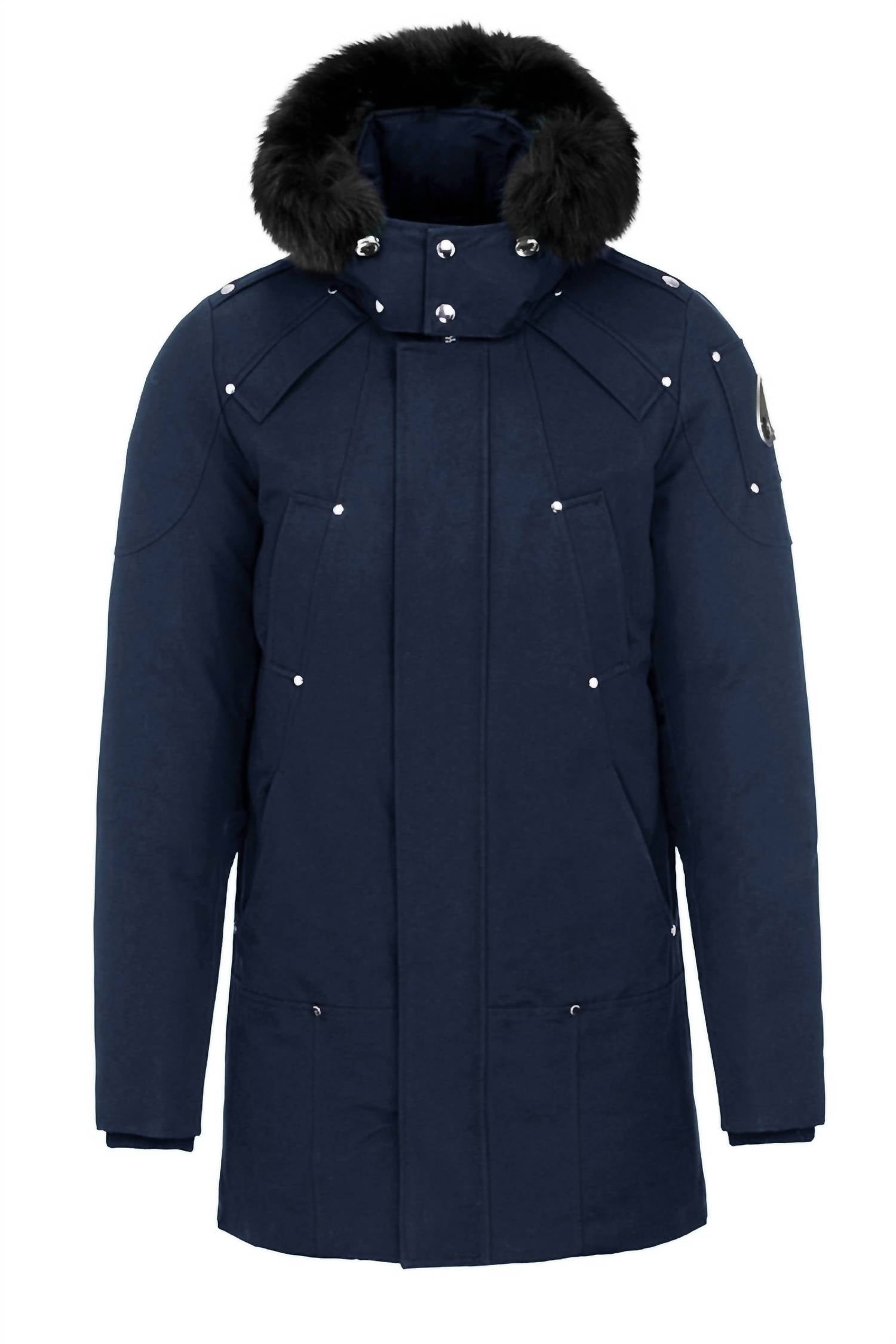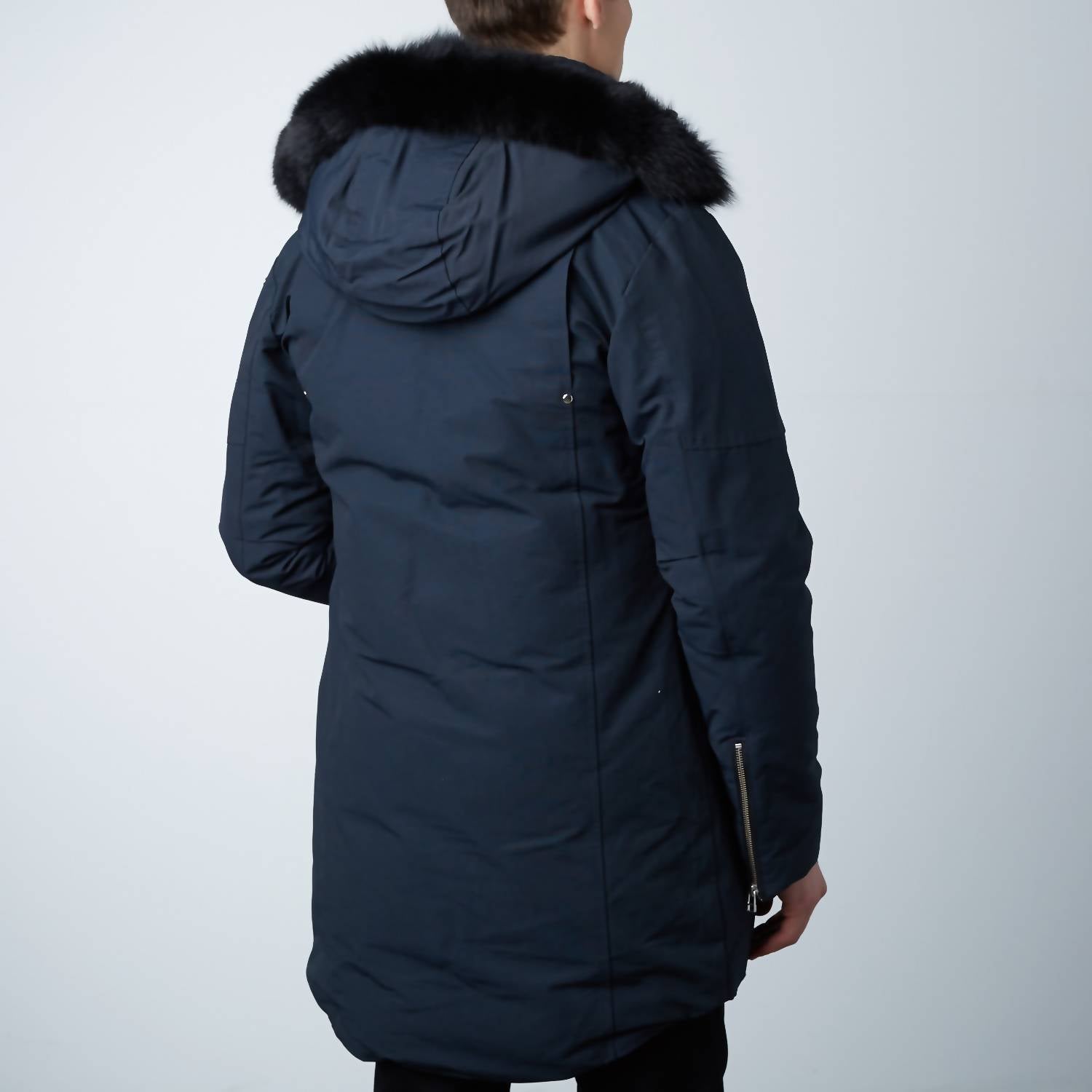 Experience the ultimate winter warmth with the Moose Knuckles Stirling Parka Coat in blue. This coat features long sleeves and is crafted from a cotton blend, with a solid pattern and a water-repellent outer shell. Made in Canada, it boasts 80/20 duck down insulation with a loft of 650 CC per oz, complete with a detachable hood trimmed in blue fox fur. The parka includes a zip closure, front placket with hidden snap closure, and heavy-duty YKK zippers, all enhanced by four seam pockets for functionality. Care instructions recommend machine washing.