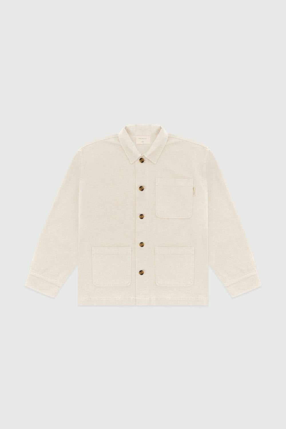 Presenting the Men's Wordmark Chore Coat by Museum of Peace & Quiet, a streetwear essential in a bone hue. With long sleeves and a collared neckline, this lightweight shirt jacket is crafted from mid-weight terry cloth, offering stretch and comfort. The coat features a button placket and practical patch front pockets. Made from 100% cotton, it is perfect for travel, especially during the fall season, and is imported from China. Care: Machine wash cold and tumble dry.