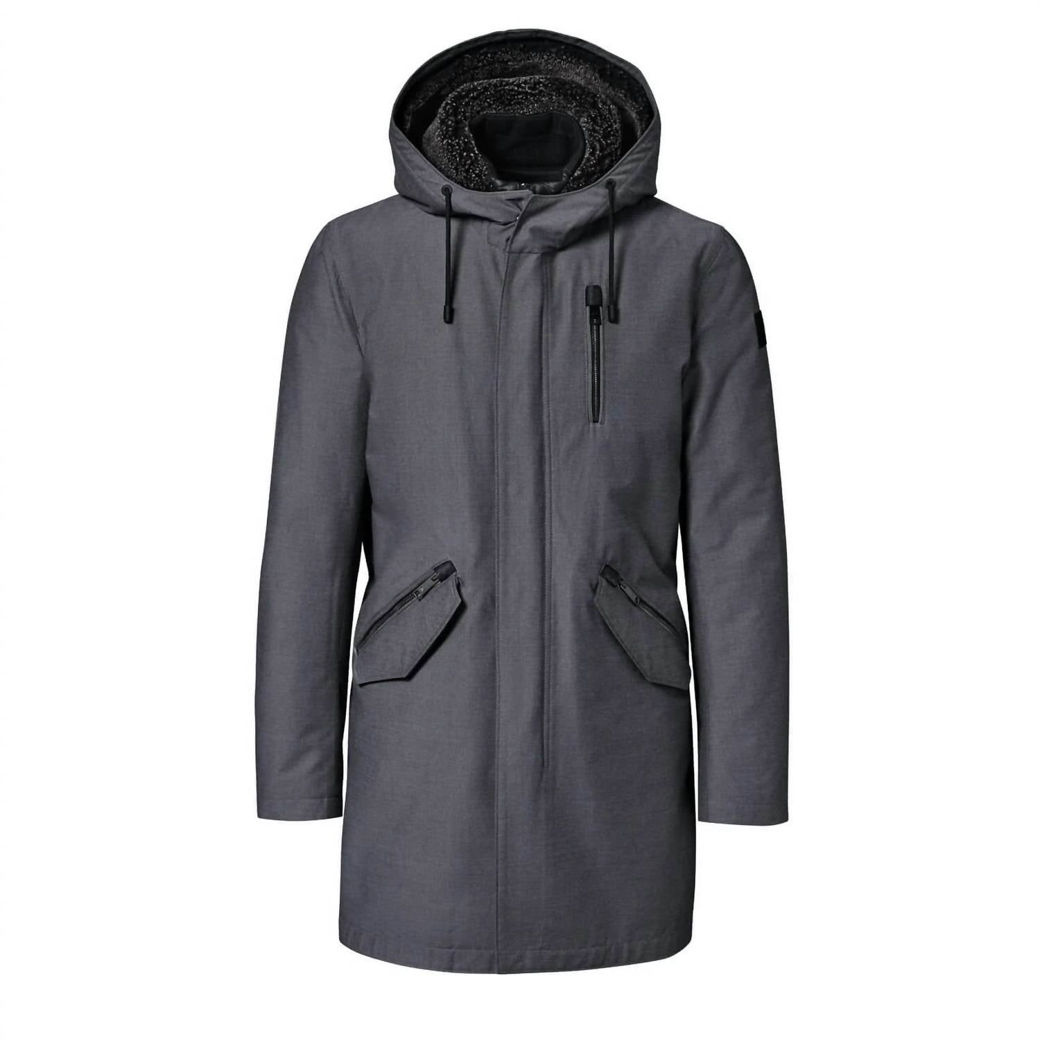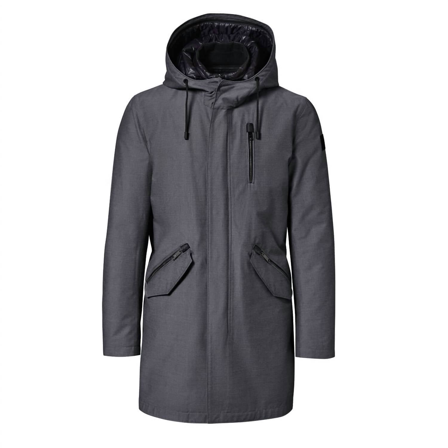 Introducing the Porsche Design Men's 3-in-1 Function Parka, a smart solution for adaptable style in dark heather grey and black. This long-sleeve parka made with Polyamide features a zip closure and a hooded neckline, combining the shell's animal pattern and inner quilted vest for year-round functionality. The robust Italian fabric ensures water-repellent and windproof protection, perfect for winter travel. Despite its sophisticated design, no specific care instructions are provided.