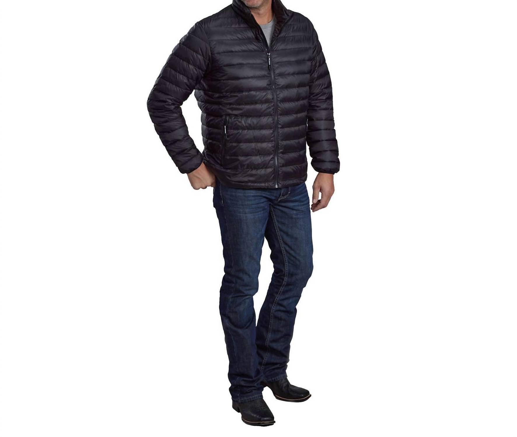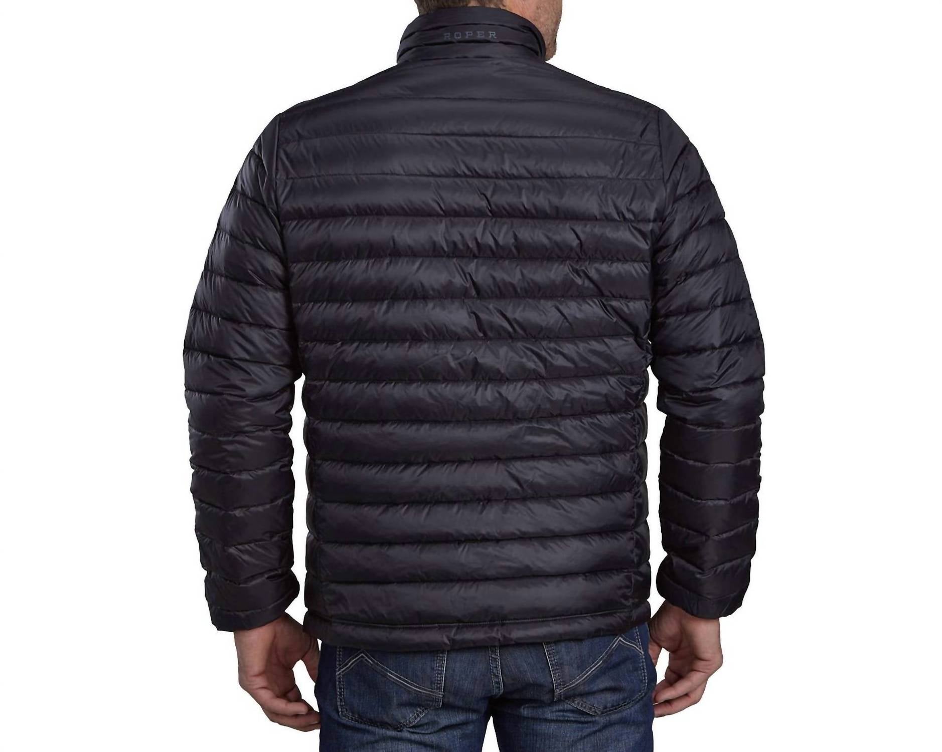Introducing the ROPER Men's Crushable Parachute Jacket, a lightweight essential for your travel wardrobe. This long sleeve puffer in classic black is crafted from 100% nylon with down fill for optimal warmth. Designed with a zip closure featuring reflective pulls, a stand-up collar, and horizontal quilting, it ensures both comfort and style. Care instructions recommend machine wash. The jacket also features practical zippered hand pockets and a self-fabric lining with a screen-printed logo on the back neck for a sleek finish.