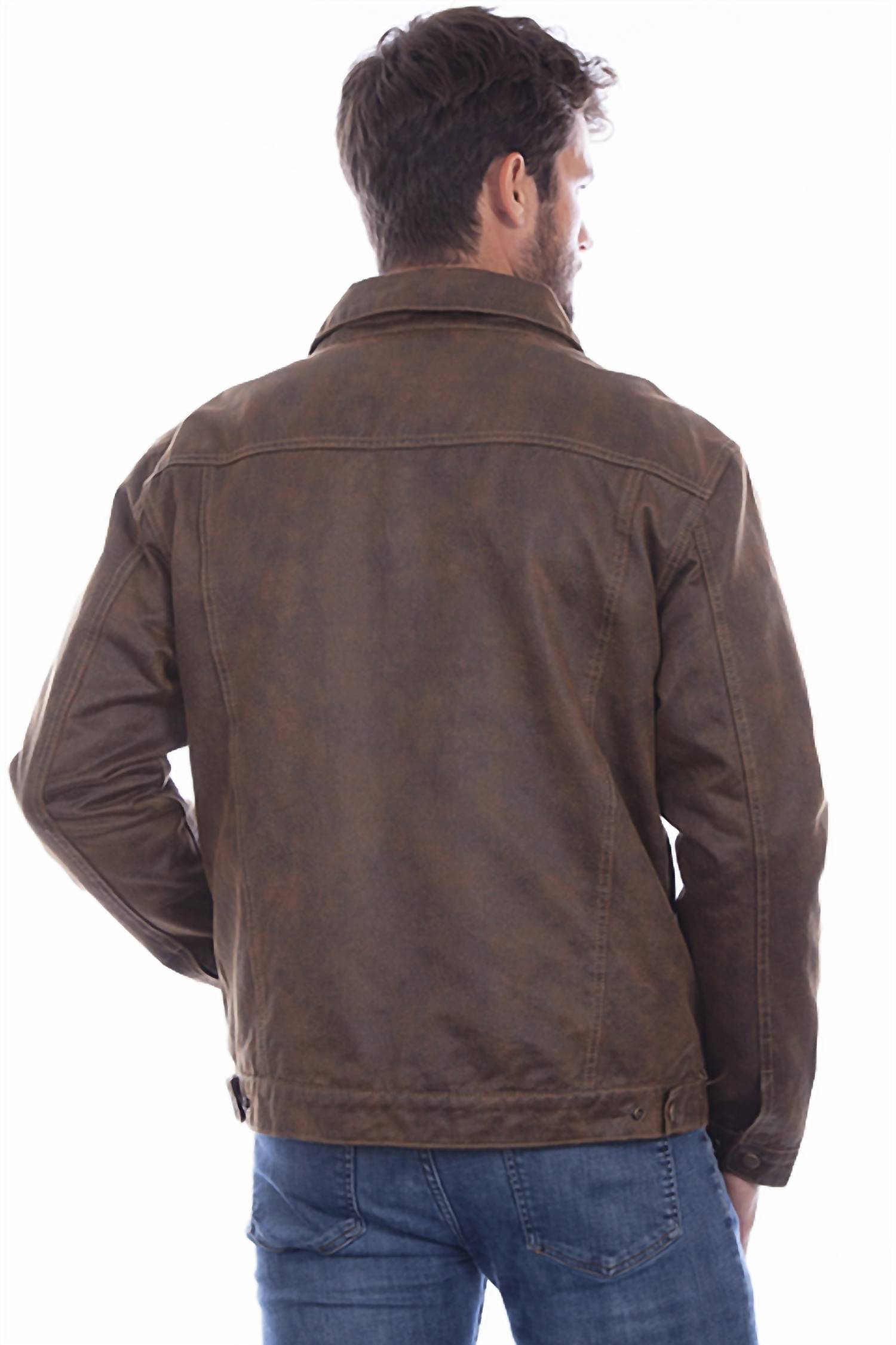 Elevate your vacation wardrobe with Scully's Men's Faux Jean Jacket, a striking choice for the fall season with its brown striped pattern. Designed with a collar and long sleeves, this lightweight jacket is perfect for maximalist styling. It features a functional button closure and pockets for added convenience. This men's jacket embodies effortless style that is easy to wear and ideal for any casual outing.