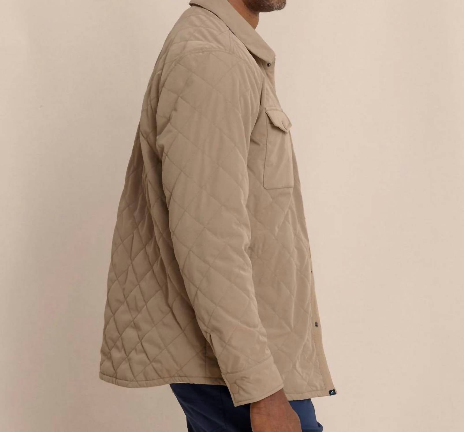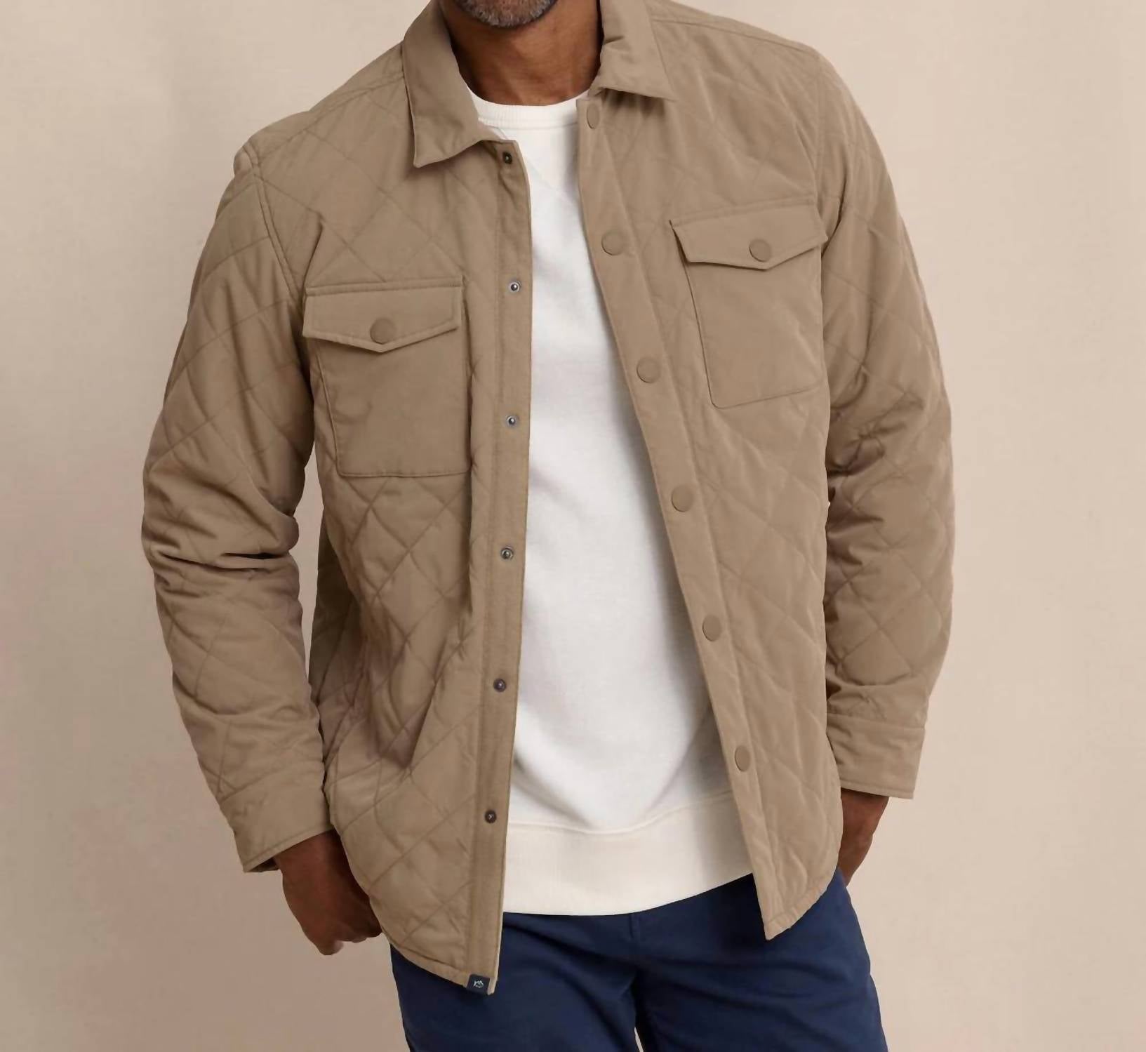Experience the sophistication of the Grafton Quilted Jacket by Southern Tide, crafted from 100% polyester for lightweight warmth and timeless appeal in Petrified Oak. This patterned, long sleeve jacket features a diamond quilted exterior with a contrasting jacquard camo interior lining, adding a touch of coastal sensibility. Enhancing its functional style, it includes secure welted pockets and a stand collar, closing with a snap for added convenience. Care: Hand wash and lay flat to dry for lasting durability. Ideal for spring occasions and holiday parties, it complements a refined minimalist trend.