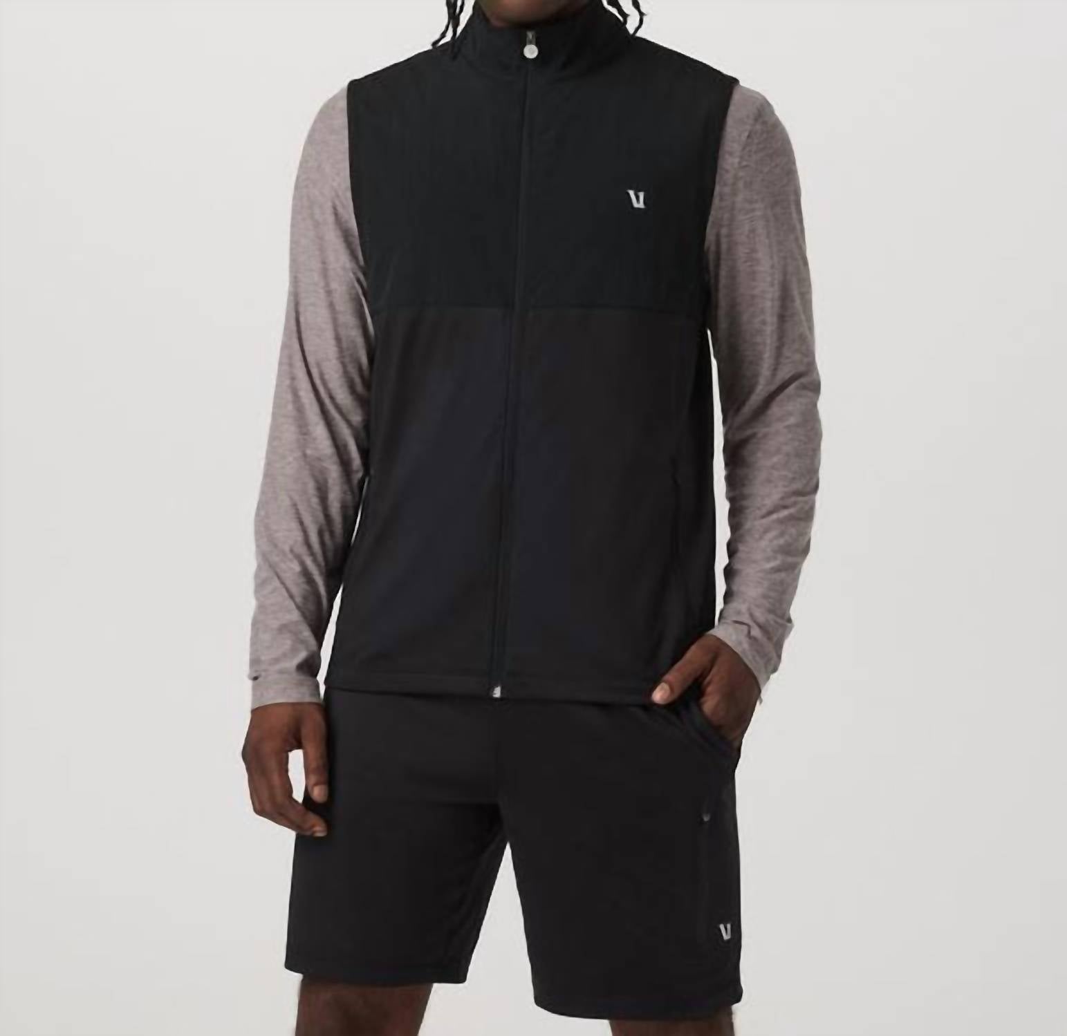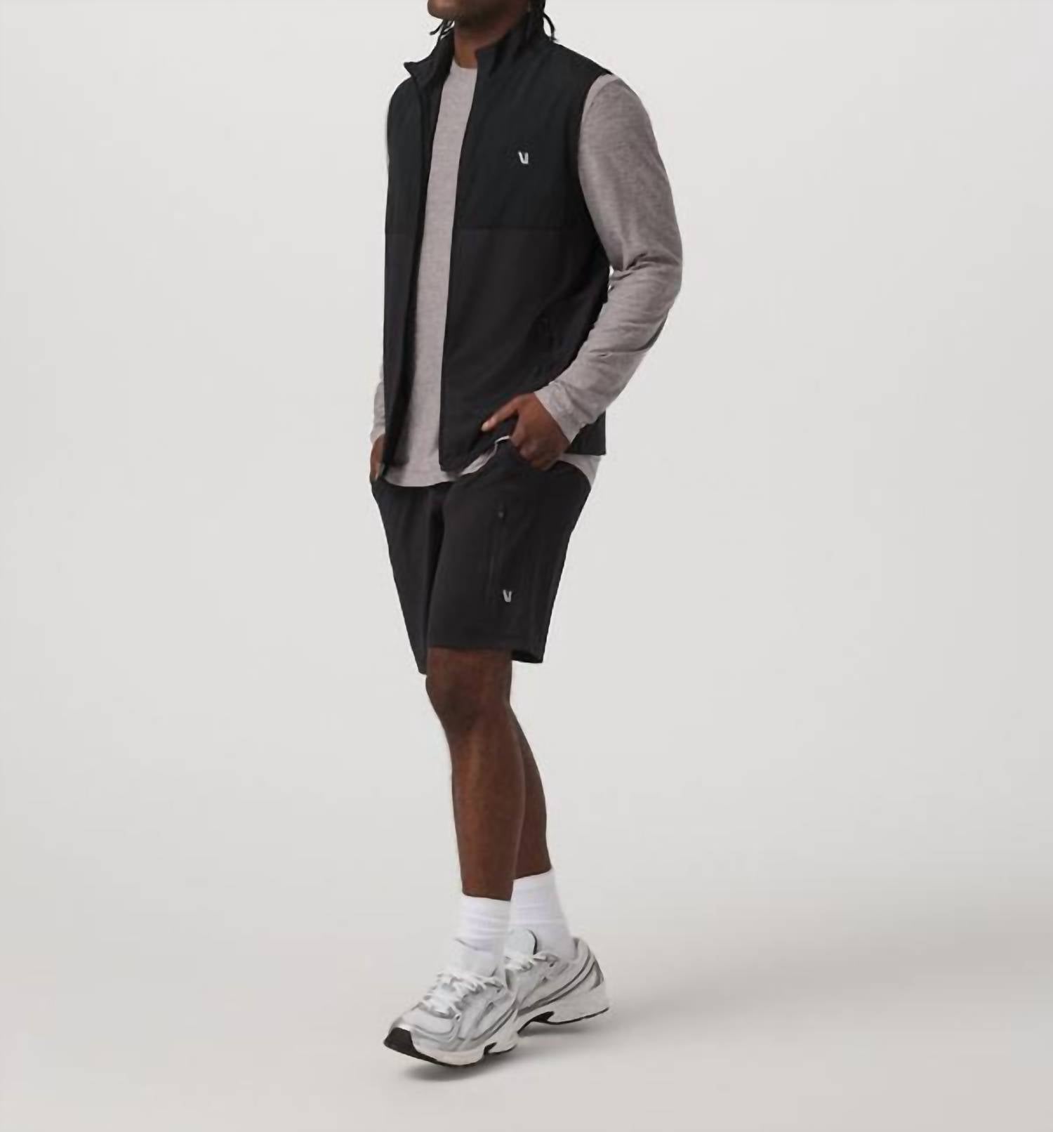 Discover the Sunday Element Vest by Vuori, a perfect companion for your summer hiking adventures. This sleeveless vest comes in a sleek black solid pattern, featuring a practical zip closure and handy pockets. Crafted from 88% recycled polyester and 12% elastane, the vest is designed with a mockneck and lined for added comfort. Care is a breeze with machine wash and tumble dry instructions.