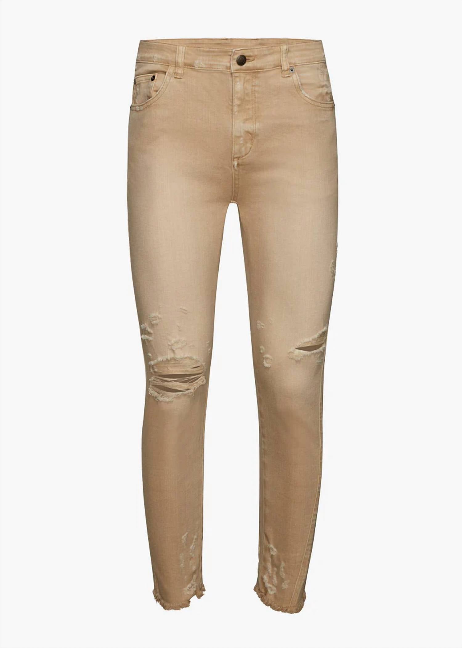 Designed with a low-rise waist and a slim fit for modern masculinity. Made from 98% cotton and 2% spandex. Offer the perfect balance of flexibility and comfort, featuring distressed detailing and a drop crotch in a Sand Dune hue. Design includes a straight leg style with functional front and back pockets and a button closure. Made in China. Care instructions are simple with a machine wash option.