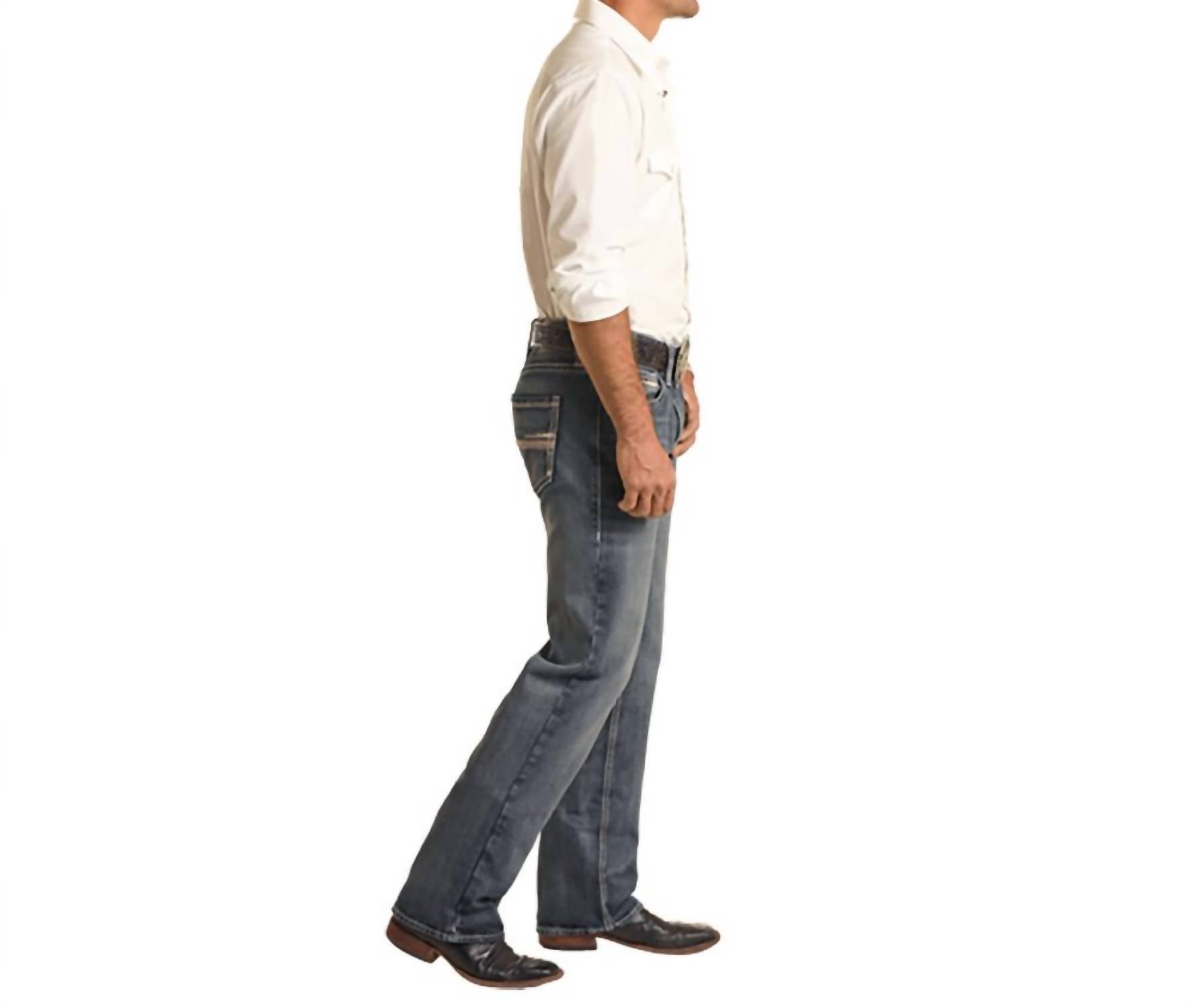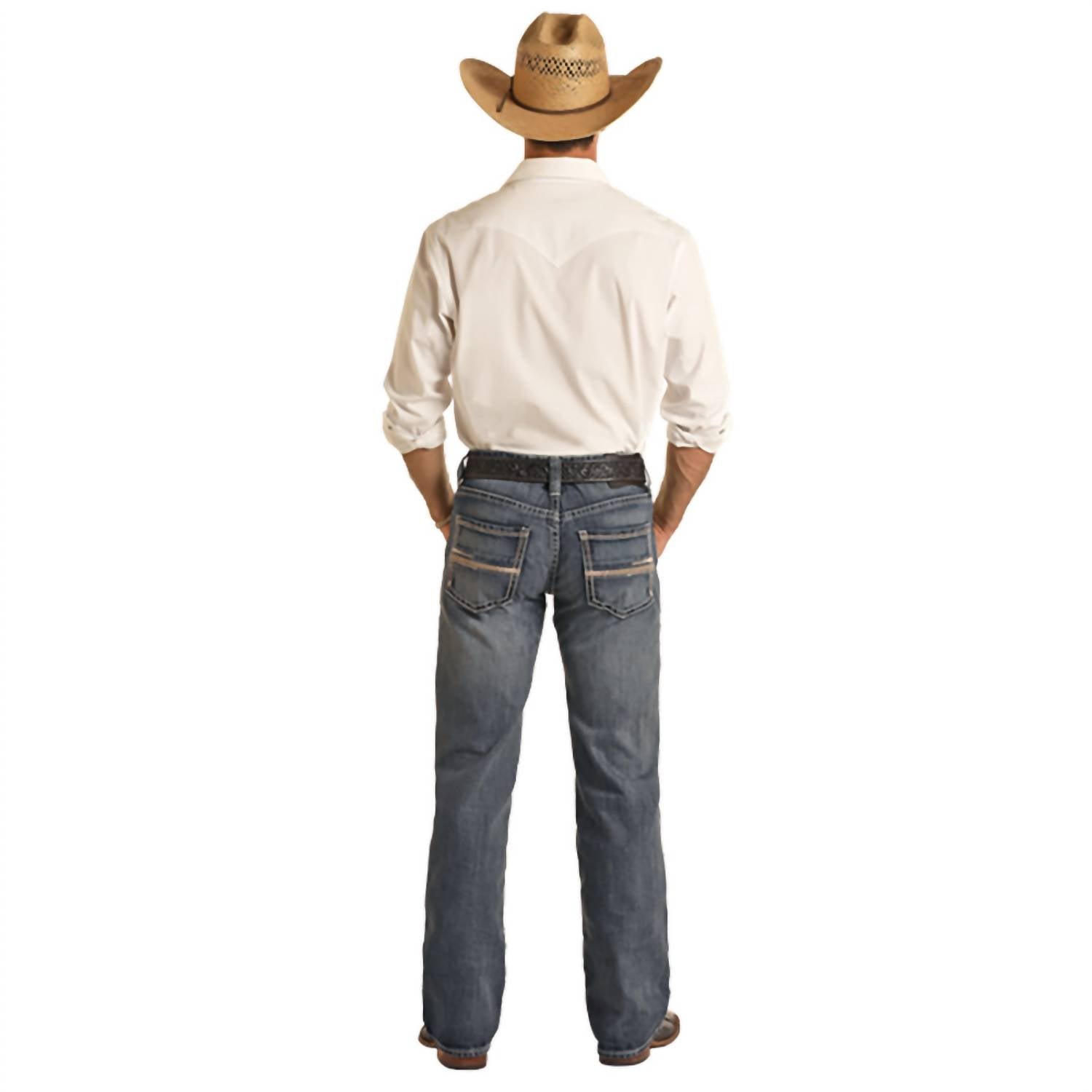 Introducing the Pistol Regular Fit Straight Leg Rope Stitch Jean by Rock & Roll Denim, a remarkable piece in Medium Vintage denim perfect for the modern wardrobe. This style offers a regular fit with a straight leg design and an 18.5" leg opening, featuring a low-rise waist for a contemporary look. Constructed from 100% cotton, these non-stretch jeans come equipped with a classic 5-pocket design, detailed whiskers, and sandblasting for that authentic vintage vibe. Closure: Zip fly. Care: Machine wash and tumble dry.