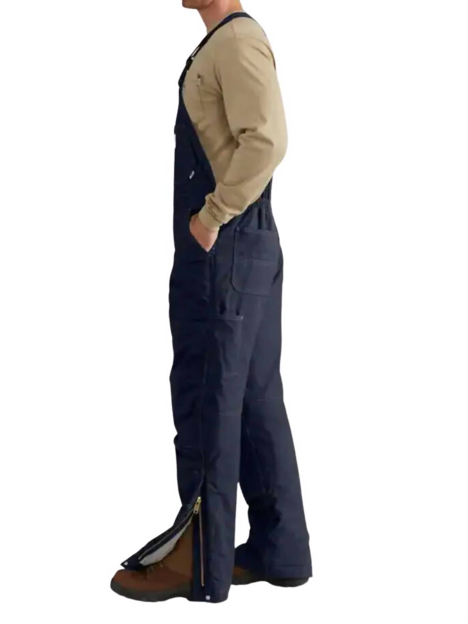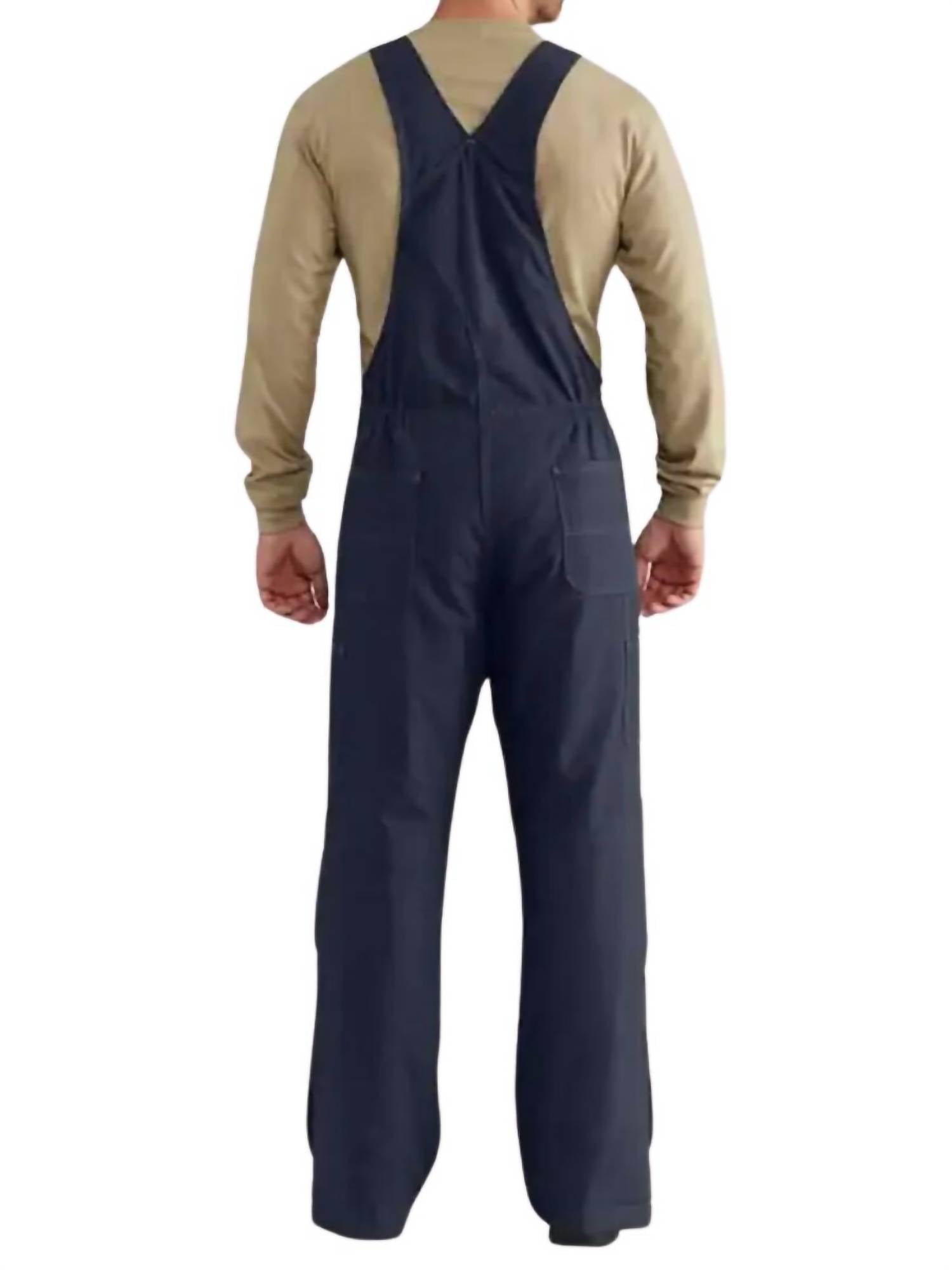High back with fire-resistant elastic suspenders and fire-resistant side-release buckles. Bib pocket with zipper closure. Chap-style double-front for durability. Brass zipper fly with Nomex® fire-resistant zipper tape. FR melamine buttons at waist. Articulated knee enhances ease of movement. Multiple tool and utility pockets. Brass leg zippers with Nomex® fire-resistant zipper tape and protective flaps with arc-resistant snap closures. Machine wash warm. 88% Cotton, 12% Nylon with Rain Defender® durable water-repellent.