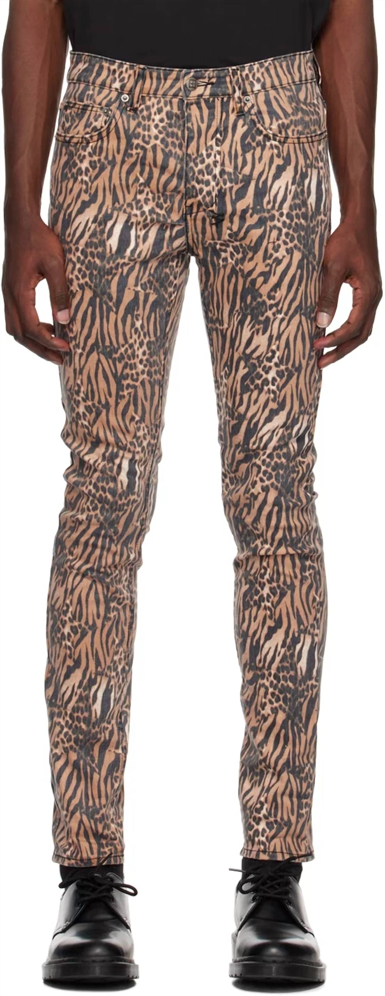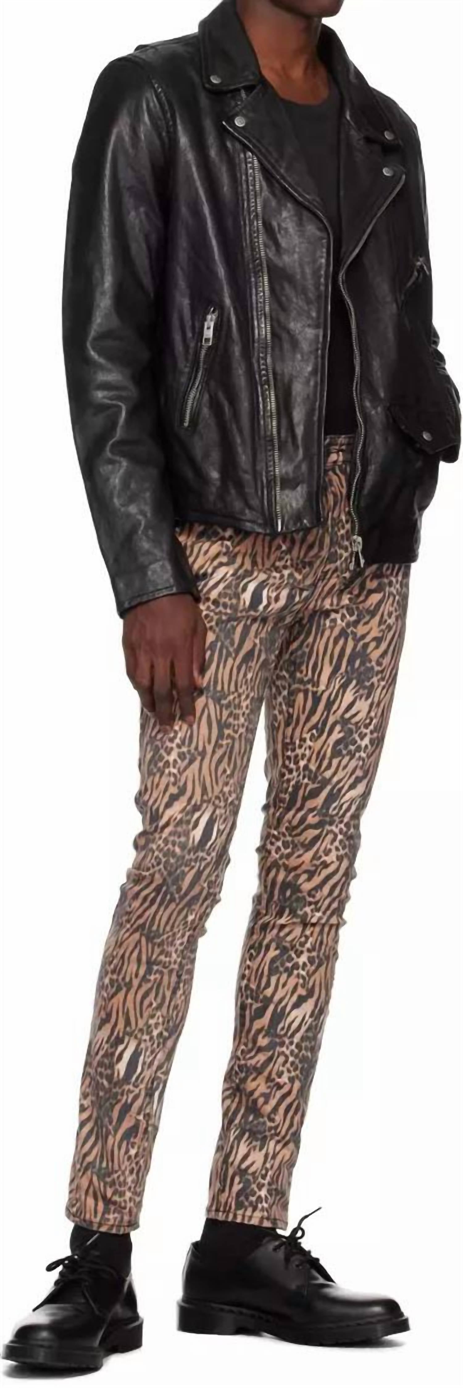 Meet the Chitch Zoo Animal Print Jeans by Ksubi, where bold style meets comfort. Featuring a striking Leopard and Tiger pattern, these slim-fit, skinny-leg jeans are crafted from a blend of 98% cotton and 2% elastane for stretch. They include a button closure, five-pocket styling, and logo graphics for added flair. Care instructions recommend machine washing, with measurements including a 36-inch waist, 32-inch inseam, and a high rise of 11.5 inches.
