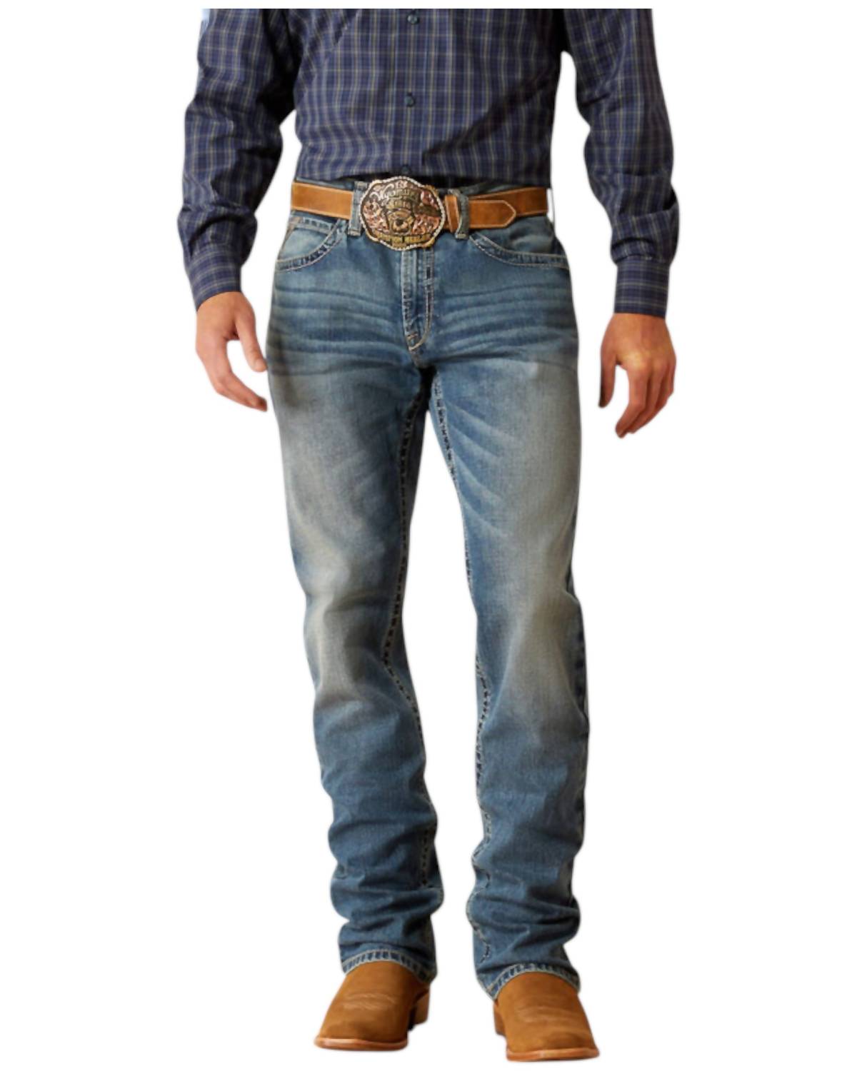 Introducing the ARIAT M2 Traditional Relaxed Buster Boot Cut Jeans in Dakota, designed for both work and casual settings. Crafted from a durable blend of 99% cotton and 1% Lycra® Spandex elastane, these jeans offer a comfortable fit with a slight stretch for flexibility. Featuring a solid pattern and convenient zip closure, these bootcut jeans ensure easy wearability. Care for them with a machine wash in cold water and tumble dry on low heat.