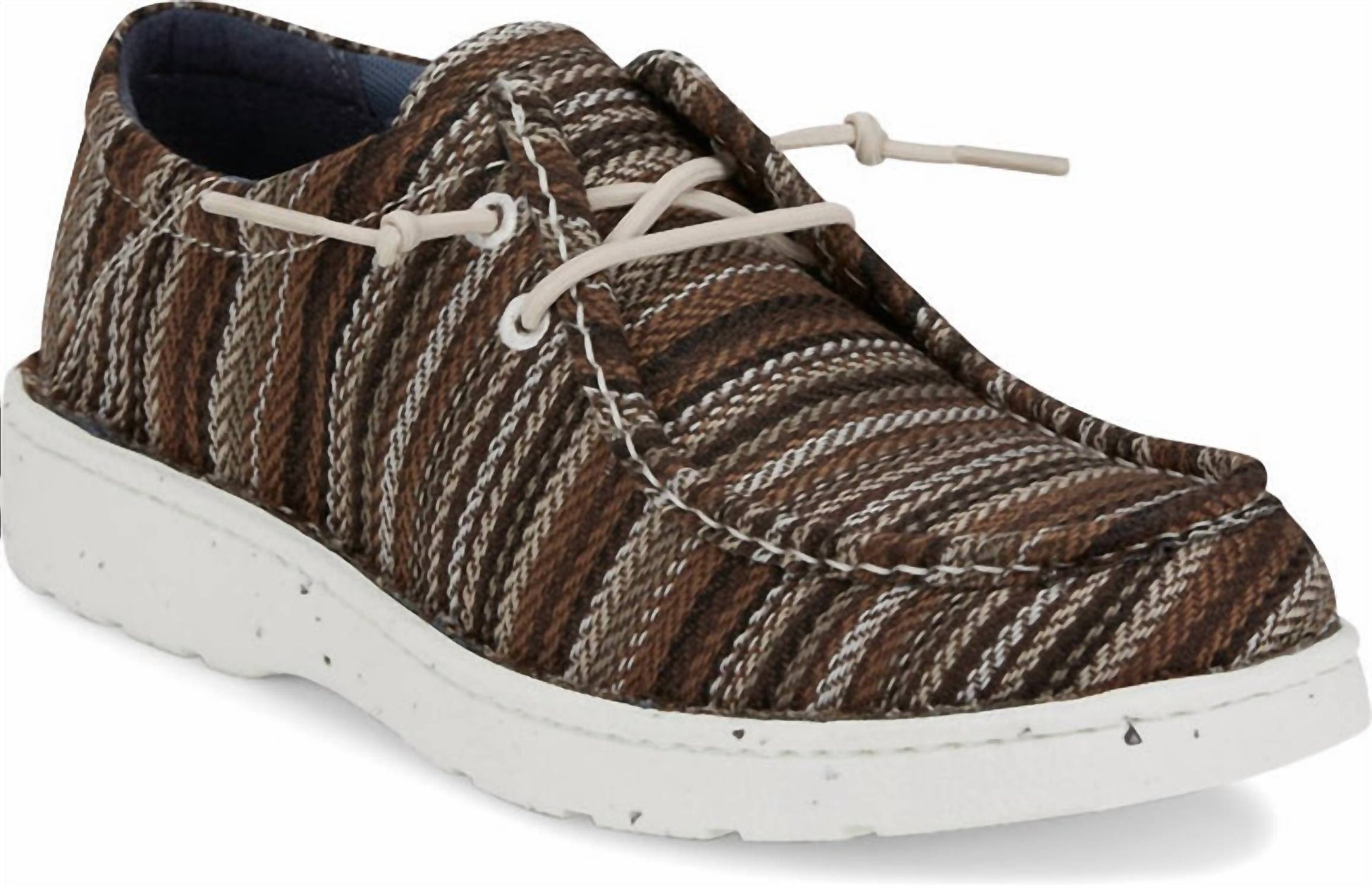 The Men’s Hazer Slip-On combines lightweight comfort with standout style, featuring a durable fabric upper and lining in a bold Aztec print. Designed with slip-on styling and laces for a secure fit, this moc toe shoe includes a cushioned insole and flat heel for all-day support. Built with Opanka construction and finished with an EVA outsole for traction and flexibility, it delivers both durability and comfort in a versatile everyday design.