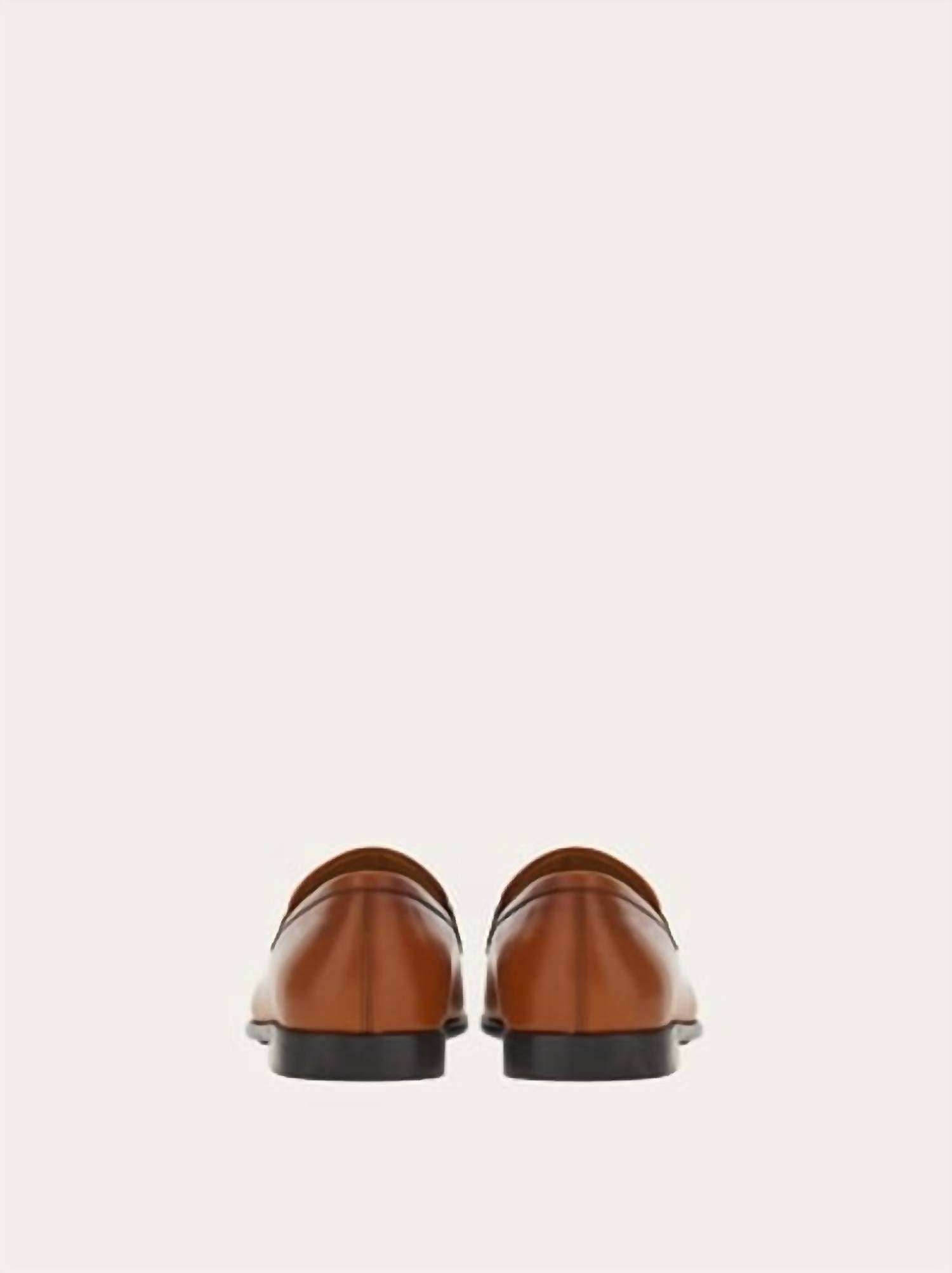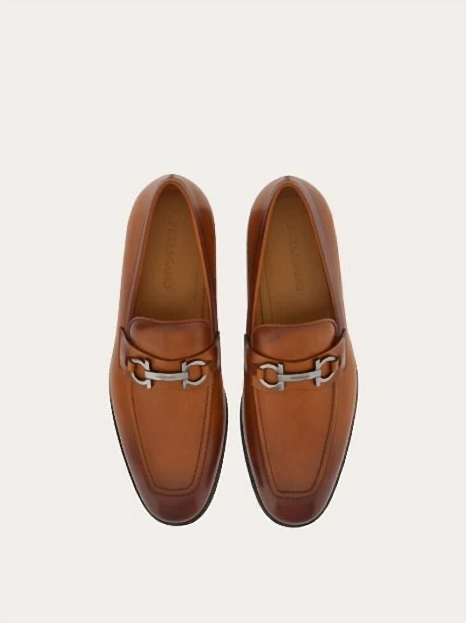 Discover the Men's Moccasin With Gancini Ornament Loafer by Salvatore Ferragamo, expertly crafted for the discerning gentleman. Made from hammered calfskin leather, this loafer boasts a natural grain and dual-tone color, offering a rich aesthetic with artisan-buffed depth. A metallic Gancio bit and raised stitching accent the sophisticated design, complemented by a flexible rubber sole for comfort. Proudly made in Italy, this shoe epitomizes quiet luxury and is perfect for a stylish dinner party during the spring, especially during the Thanksgiving holiday.