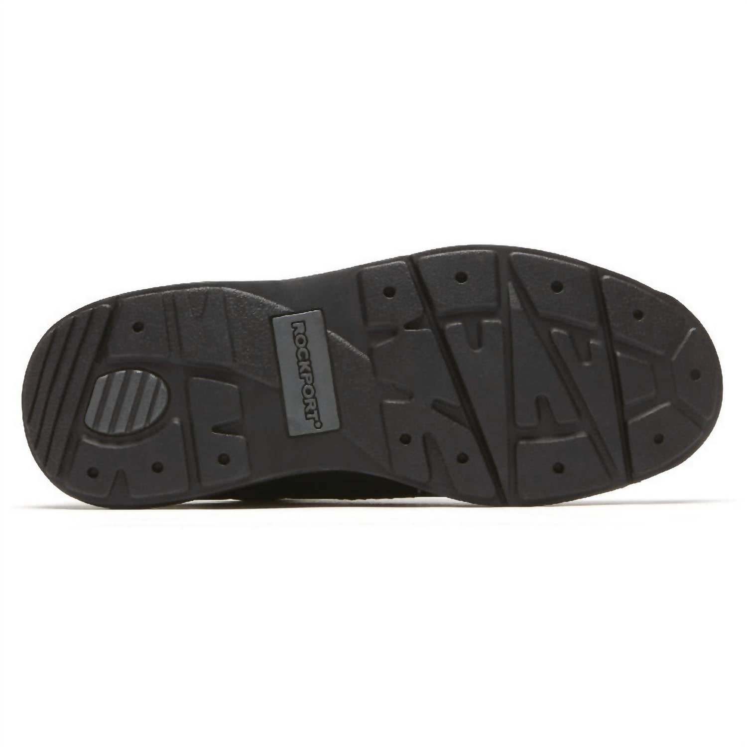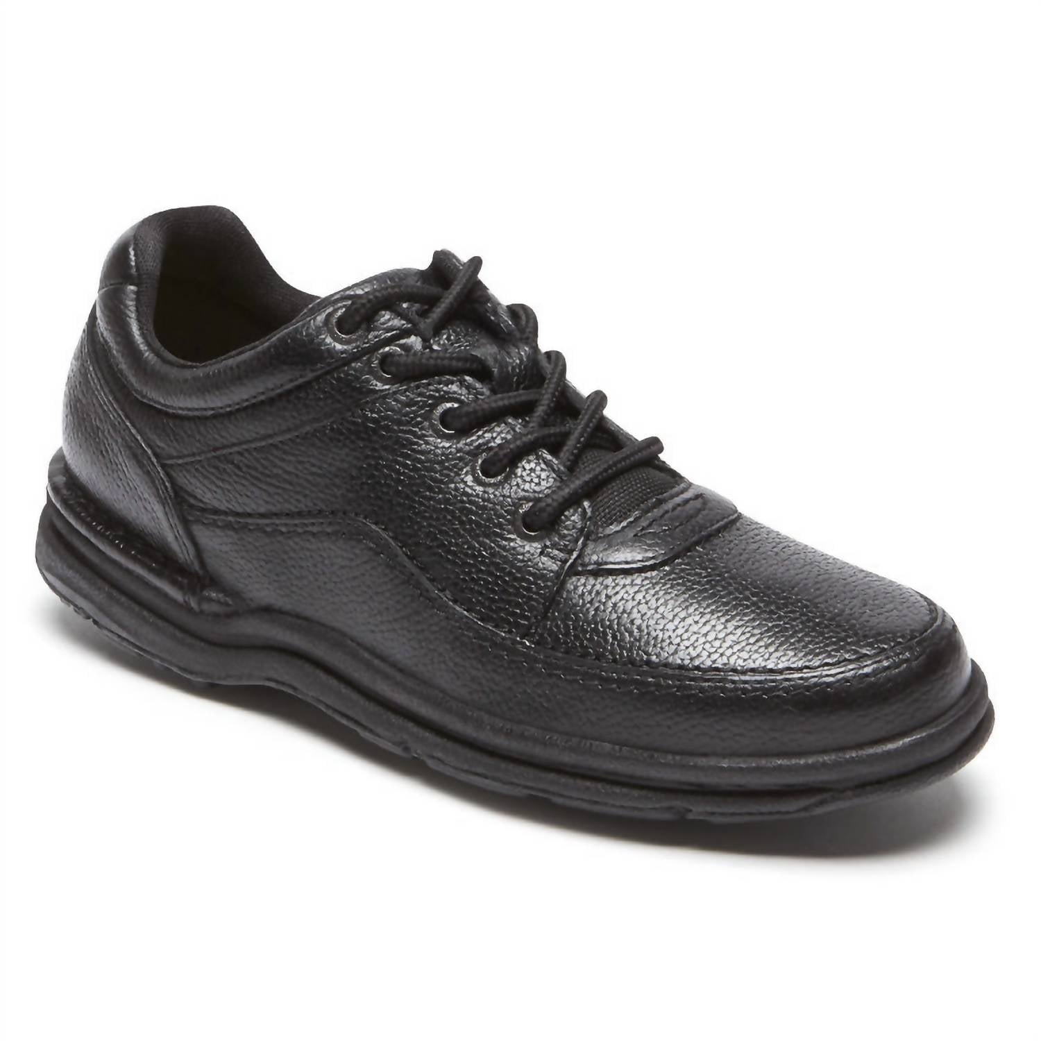 Explore the world in style with the Men's World Tour Classic Lace Up Shoes by ROCKPORT. Crafted from easy-to-clean black leather, these shoes mold to your foot over time for a custom fit. The design features a padded collar and tongue to prevent blisters and a durable rubber sole for a reliable grip. Enjoy lightweight shock absorption with EVA, while breathable polyurethane cushioning offers moisture absorbency and odor resistance.