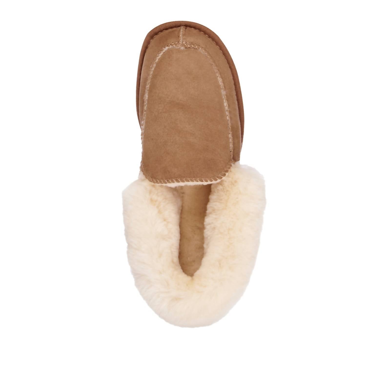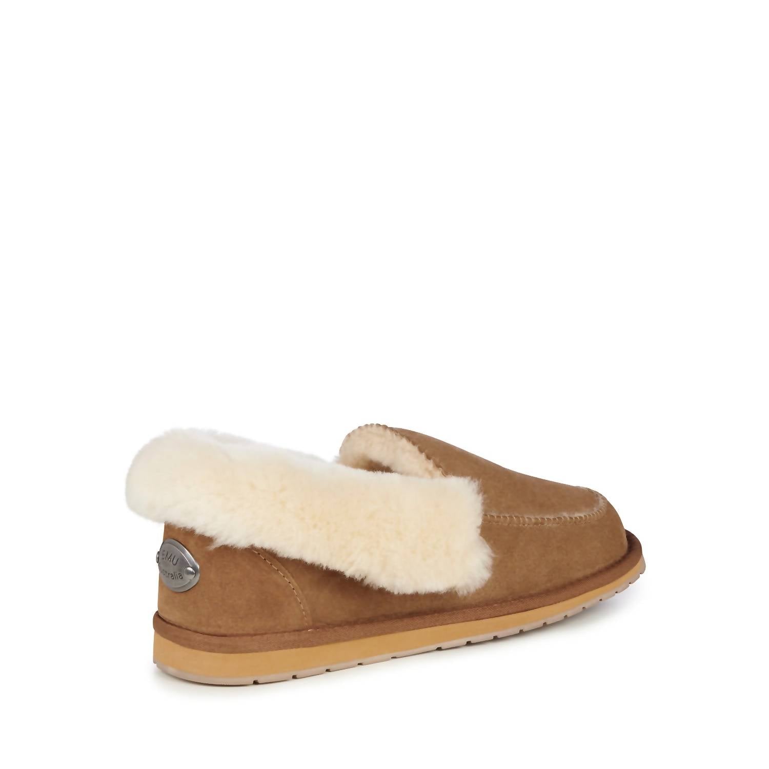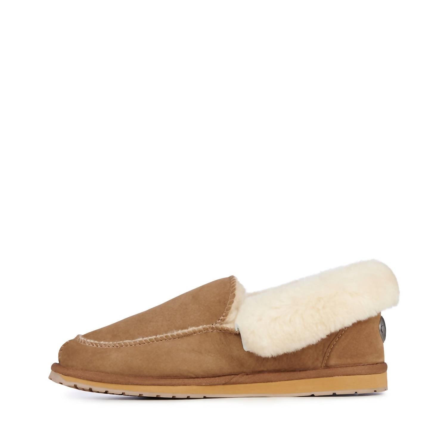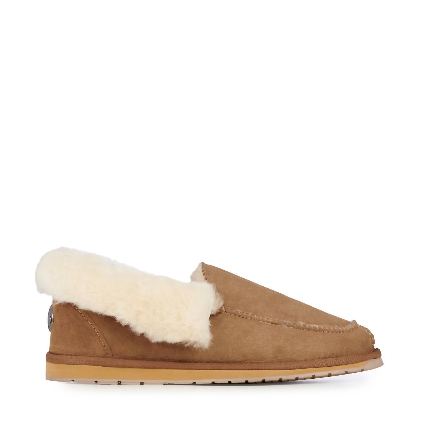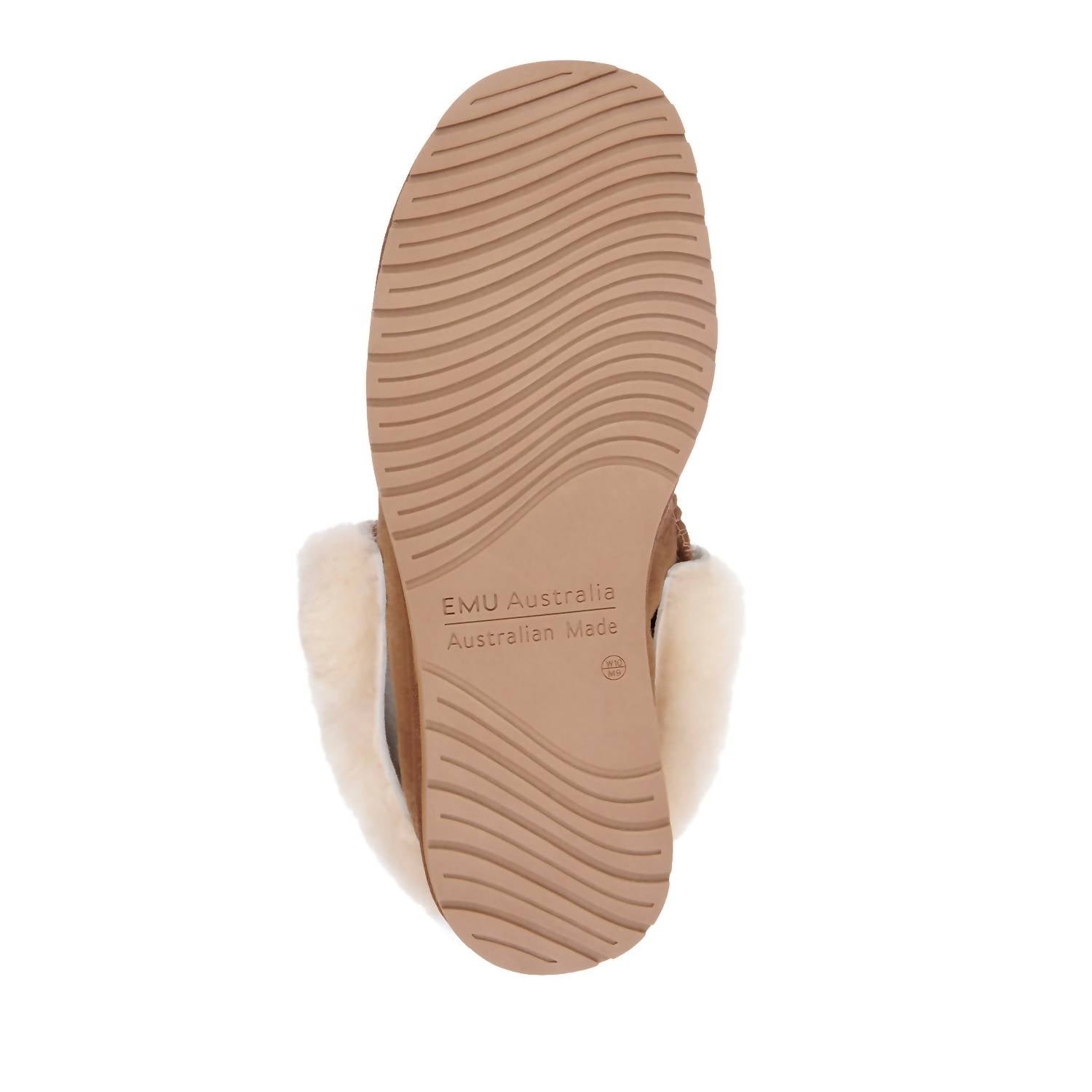 The Platinum Murray Fold Down Slipper by EMU Australia offers premium comfort and versatility. Made in Australia from double-face natural Australian sheepskin, it features a reinforced suede heel cup for improved fit and support. An EVA midsole adds cushioning, while a durable rubber outsole provides traction for indoor and outdoor use. The moisture-wicking sheepskin ensures warmth in winter and breathability in summer. Available in classic chestnut, these slippers deliver luxurious all-season comfort.