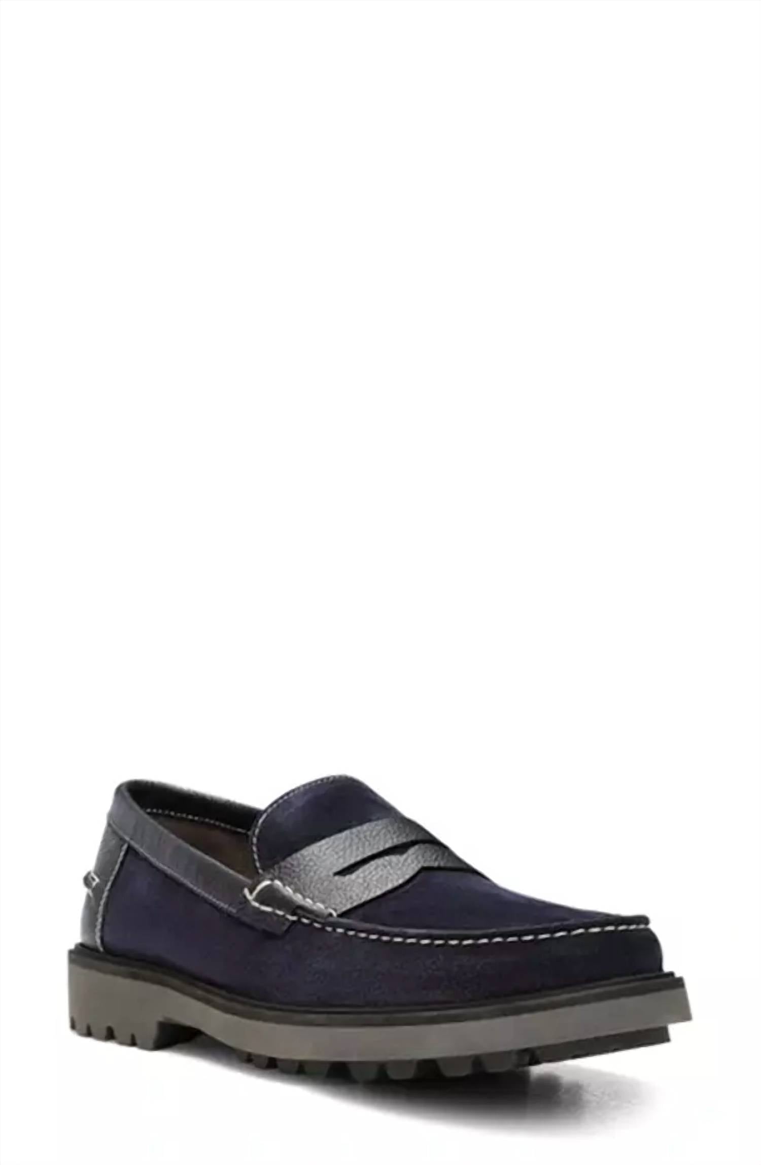 Step into comfort and style with the Men's Jimmy Suede Penny Loafer by DONALD PLINER. This sophisticated shoe features a squared toe design complemented by a chunky heel, offering a unique blend of elegance and practicality. The loafers come in a rich navy suede, perfect for adding a touch of class to any outfit. Ideal for the modern man, these loafers are a must-have addition to your wardrobe.