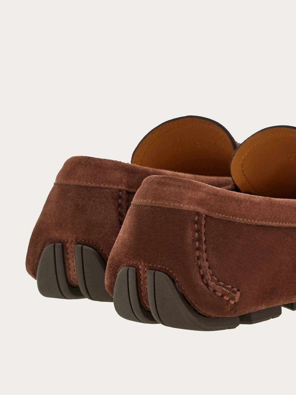 Elevate your footwear collection with the Men's Driver With Gancini Ornament Loafer by Salvatore Ferragamo, crafted in Italy. This minimalist loafer features a chic brown suede upper, skillfully utilizing eco-friendly materials for a sophisticated look. Highlighted by a recyclable steel Gancini buckle and a round toe design, the shoe combines luxury with an innovative plant-based bioplastic sole. The meticulous "Tubular" technique enhances its softness and lightness, making it ideal for travel occasions.