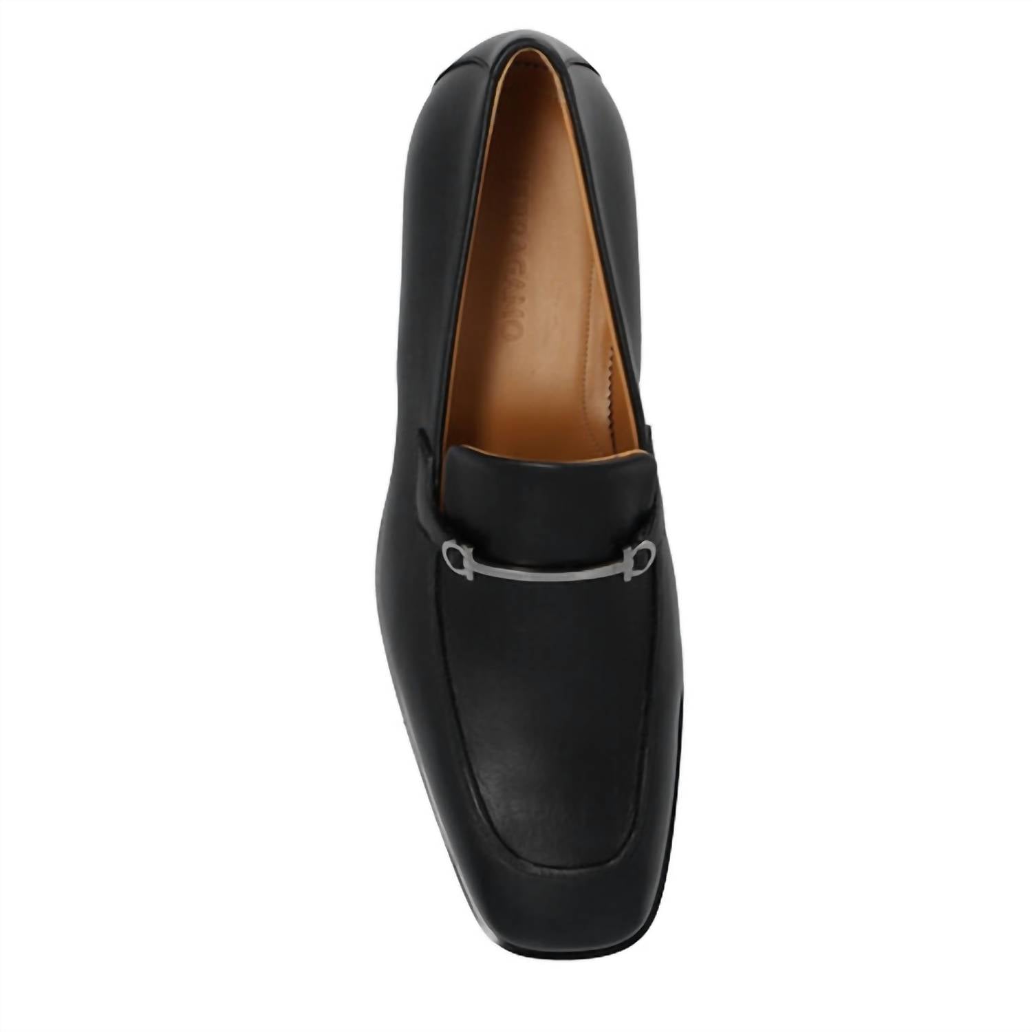Introducing the Men's Gancini Ornament Leather Moccasin by Salvatore Ferragamo, designed in a timeless black hue. These loafers feature a sophisticated slip-on style with a squared toe and topstitched apron, complemented by a signature burnished metal Gancini accent. Crafted from 100% calfskin leather, this elegant pair is made in Italy for superior quality. Perfect for special occasions such as weddings or New Year's Eve, embrace minimalist style with these flat heels.
