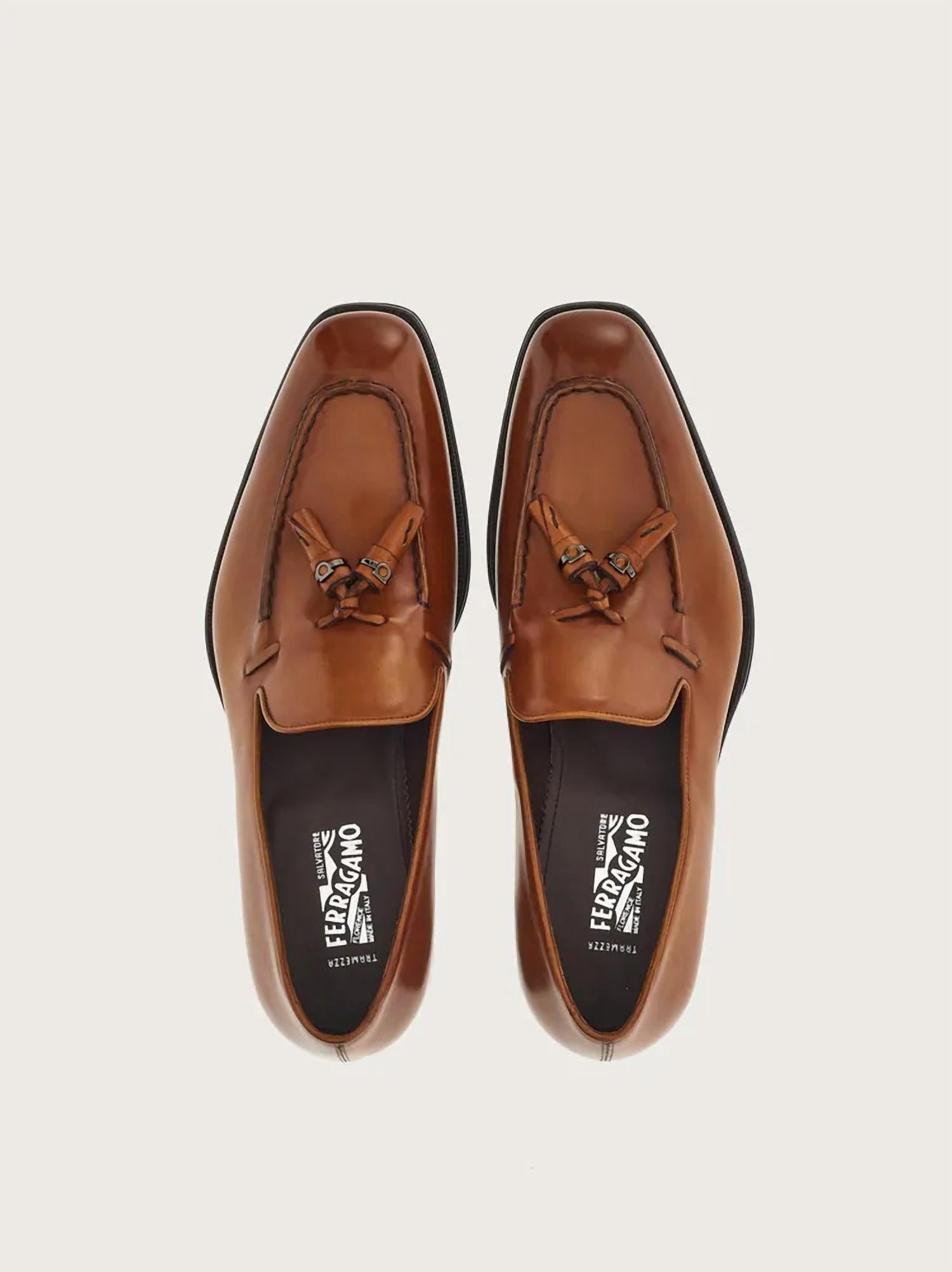 Step into sophistication with Salvatore Ferragamo's Men's Tassels Loafer, the perfect addition to any wedding ensemble or refined Thanksgiving gathering. Crafted in a rich brown leather, this loafer exudes effortless minimalism and style. Featuring an almond toe and flat heel with a height of 1" and under, it's a comfortable choice for long spring events. Ideal for the modern man who values quality and timeless design.a