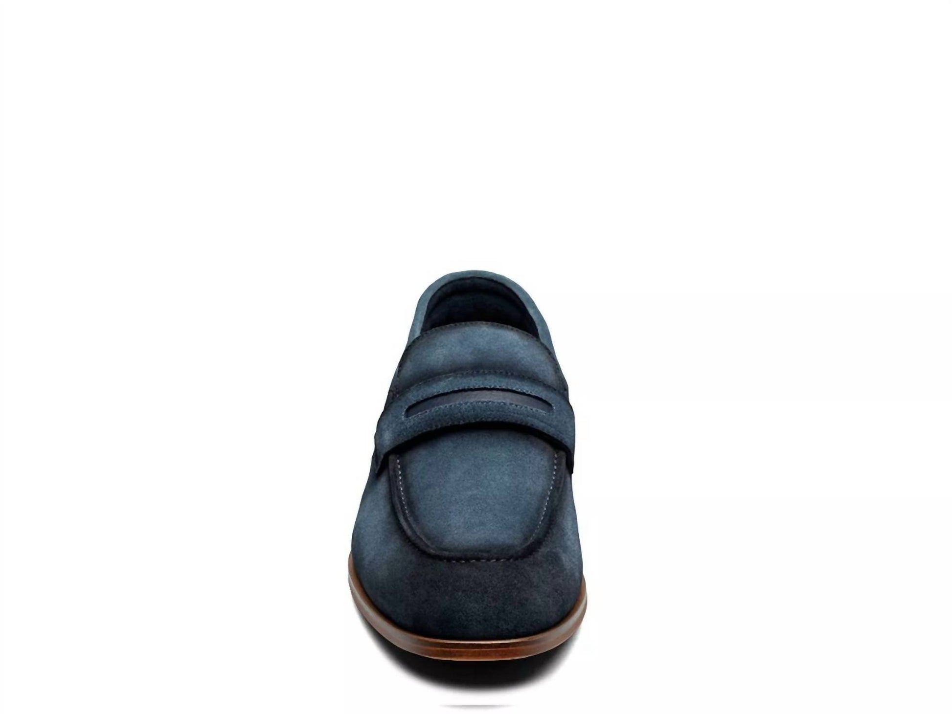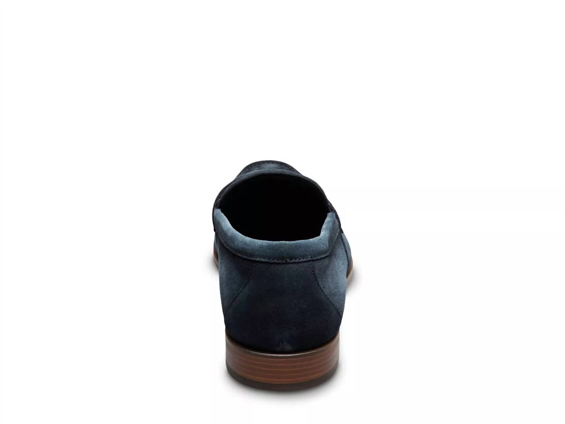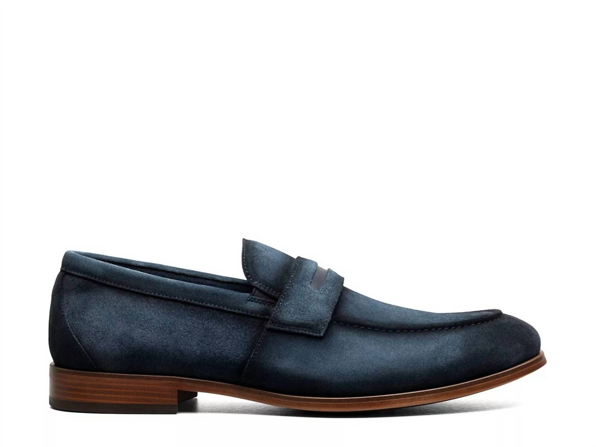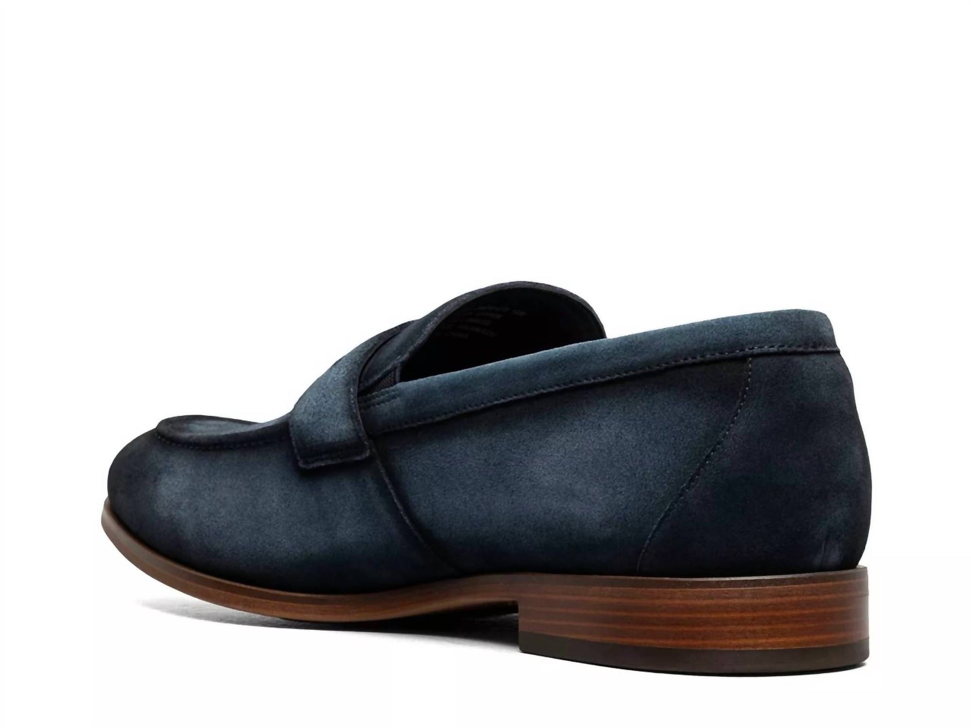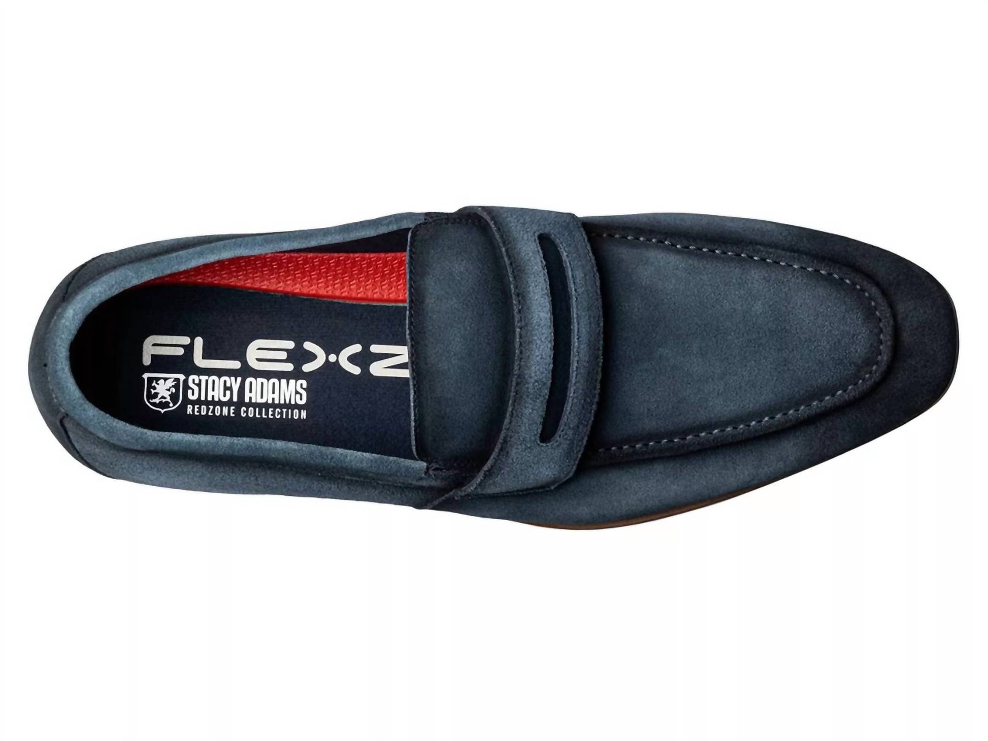 Enhance your professional or formal wardrobe with the Men's Burke Suede Loafer by Stacy Adams in a striking navy hue. This loafer features a suede upper with a stylish slip-on design and round moc toe, perfect for effortless elegance. It includes a removable Flexzone insole for cushioned comfort and a durable rubber sole for long-lasting wear. Made with a synthetic lining, these loafers are imported.