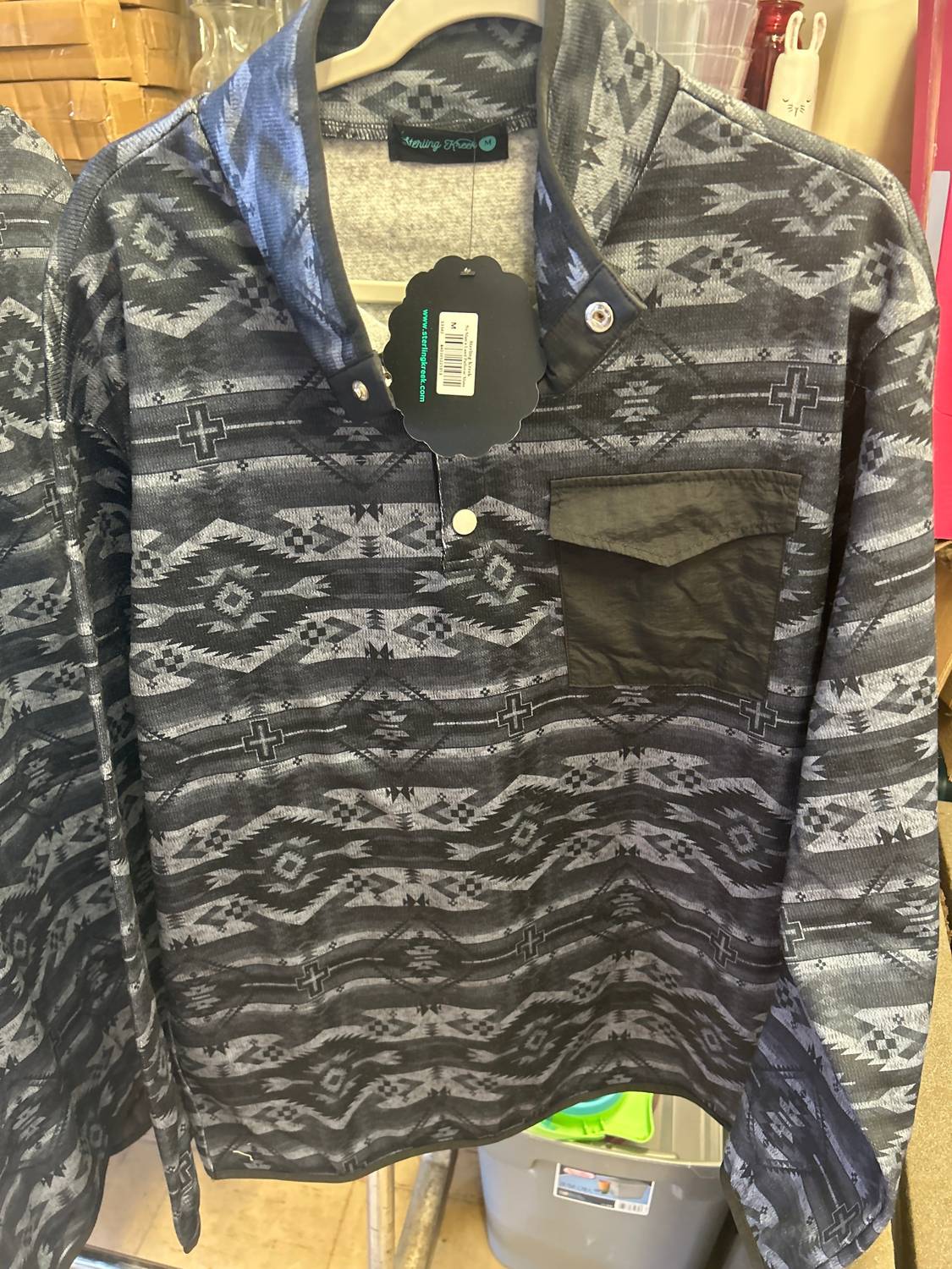 Introducing the Man's Land Pullover Shirt by Sterling Kreek, a stylish choice in black for the modern man. This Western trend piece features long sleeves and a comfortable pull-on closure with a classic collar. Its patterned design with a convenient pocket is perfect for adding functionality to your wardrobe. Made for those who prioritize both style and practicality, this pullover is a must-have, especially for chilly days.