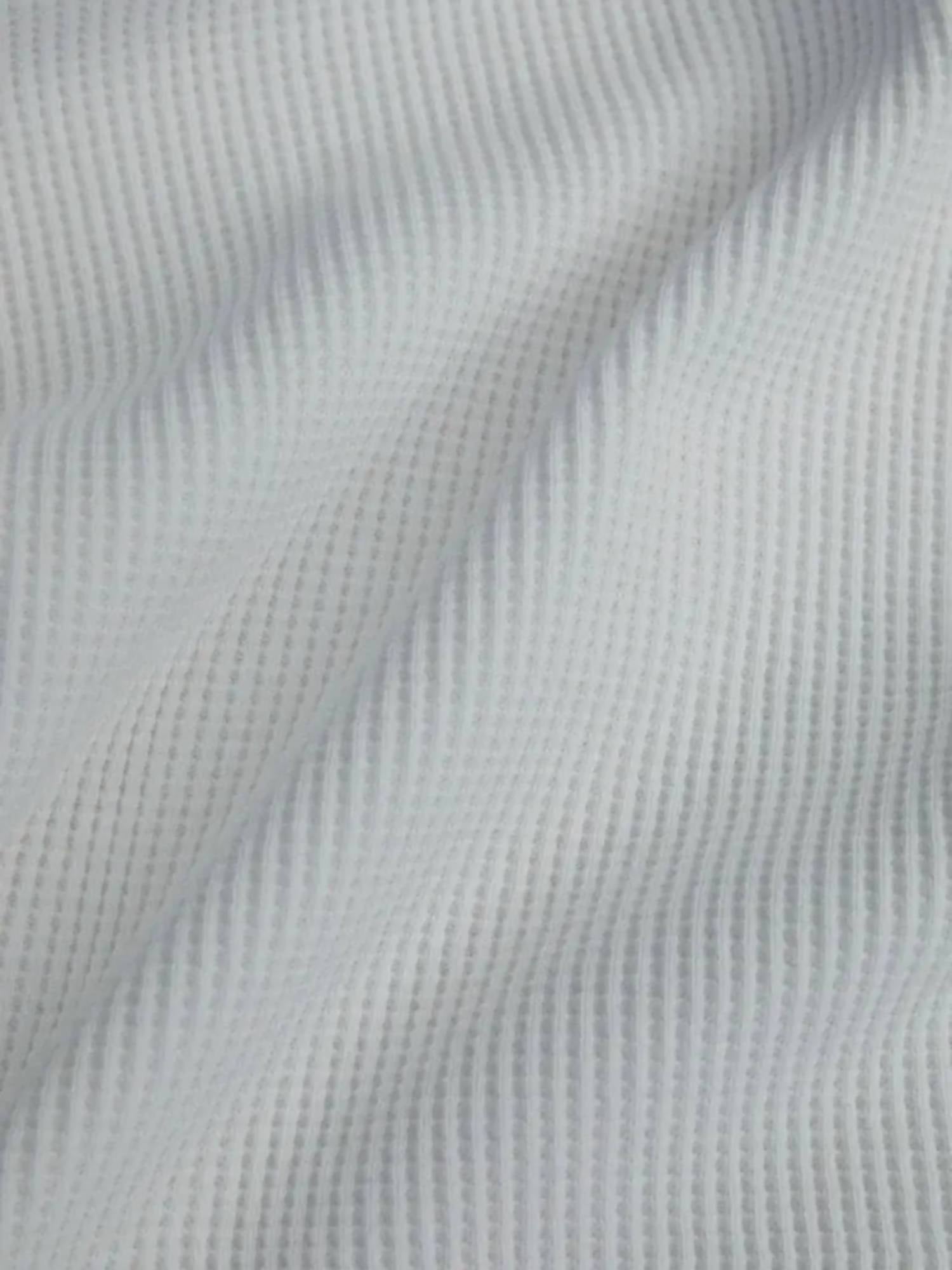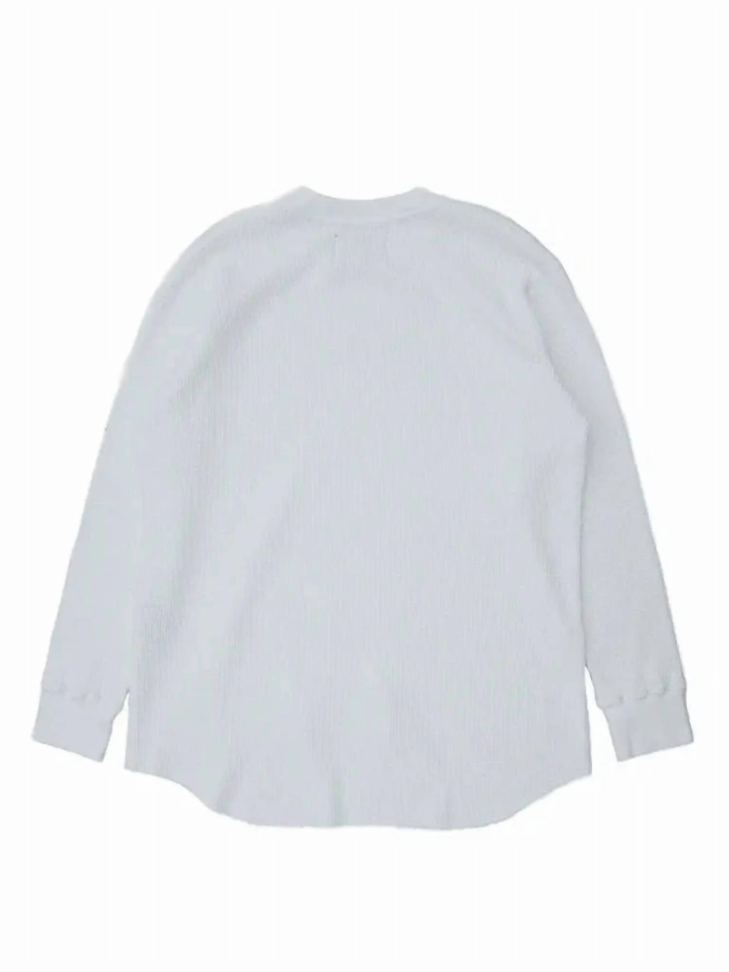 Introducing the Men's Long Sleeve Thermal Top by Lite Year, crafted for both warmth and style with its custom dyed waffle knit design. This heavy weight top features a dropped hem and wide rib cuffs and collar, all in a refined crewneck style. Made from 100% cotton, this solid white piece is tailored in the USA to meet minimalist travel needs, ensuring comfort throughout the spring season. Easily maintained with machine wash and tumble dry, it offers effortless pull-on closure for convenient wear.
