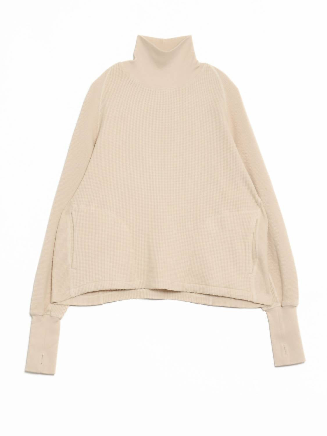 This waffle-knit rollneck is made from heavyweight 100% cotton and features raglan sleeves, curved in-seam front pockets, and elongated cuffs with thumb holes. Its textured knit and thoughtful details provide warmth, comfort, and a contemporary, relaxed silhouette.