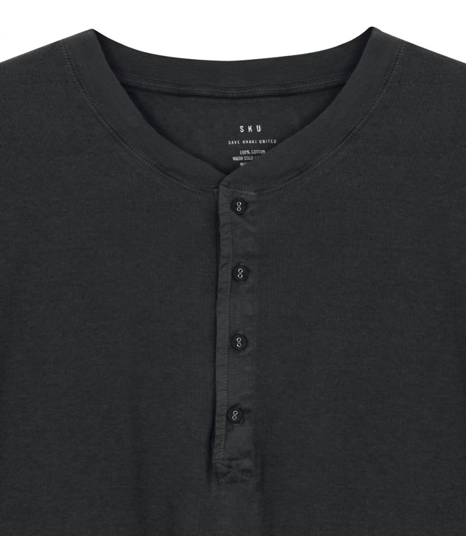 Introducing the Long Sleeve Pointelle Henley Top by SAVE KHAKI UNITED, a minimalist piece crafted for style and comfort in a soothing slate color. This men’s long sleeve garment is made from 100% cotton using a unique pointelle fabric that adds subtle texture and breathability. Designed with a woven binding and 1x1 rib collar and cuffs, it features a classic crewneck and a vintage-inspired shirt tail hem with a cover stitch finish. Closure: Pull on. Care: Machine wash, tumble dry.