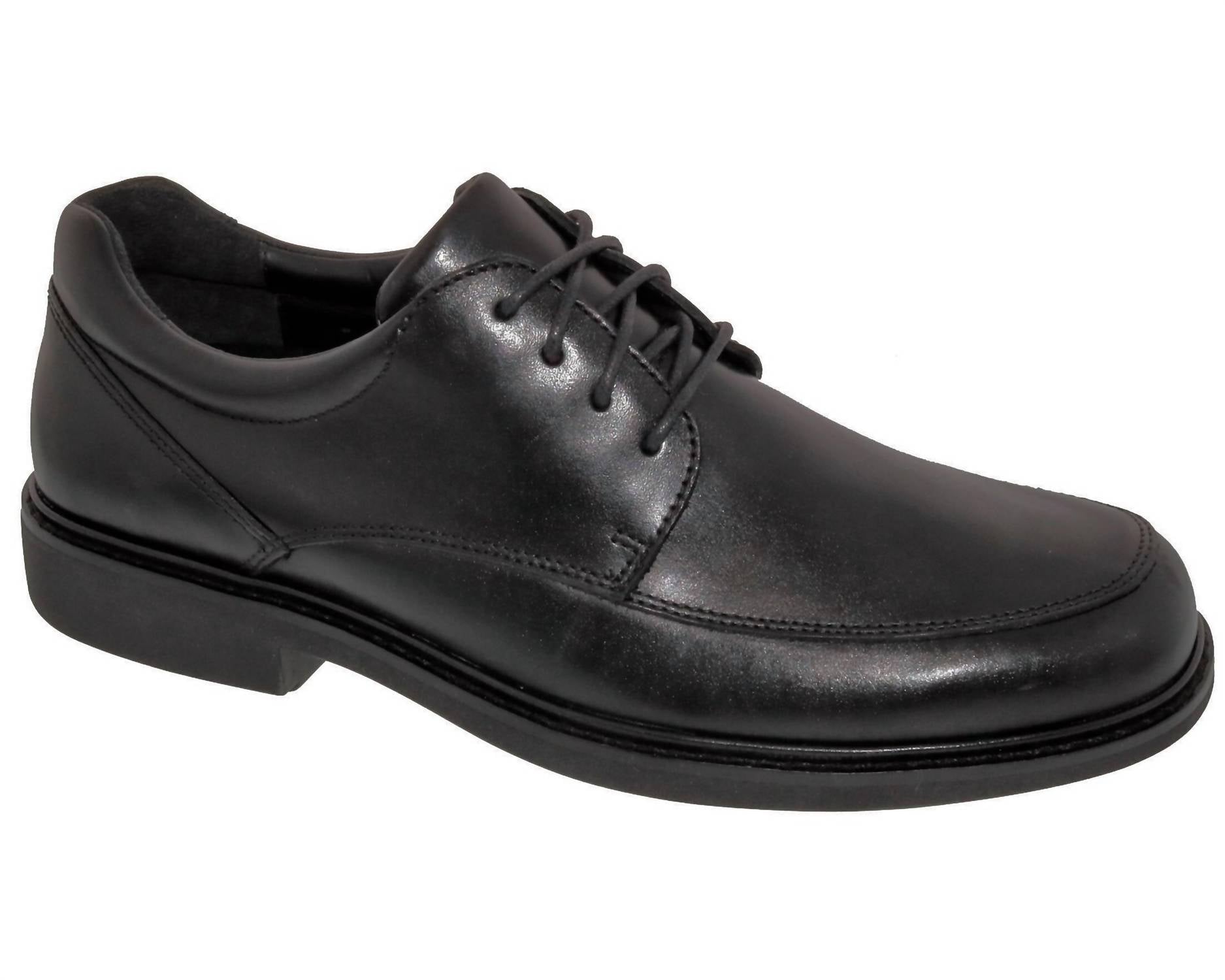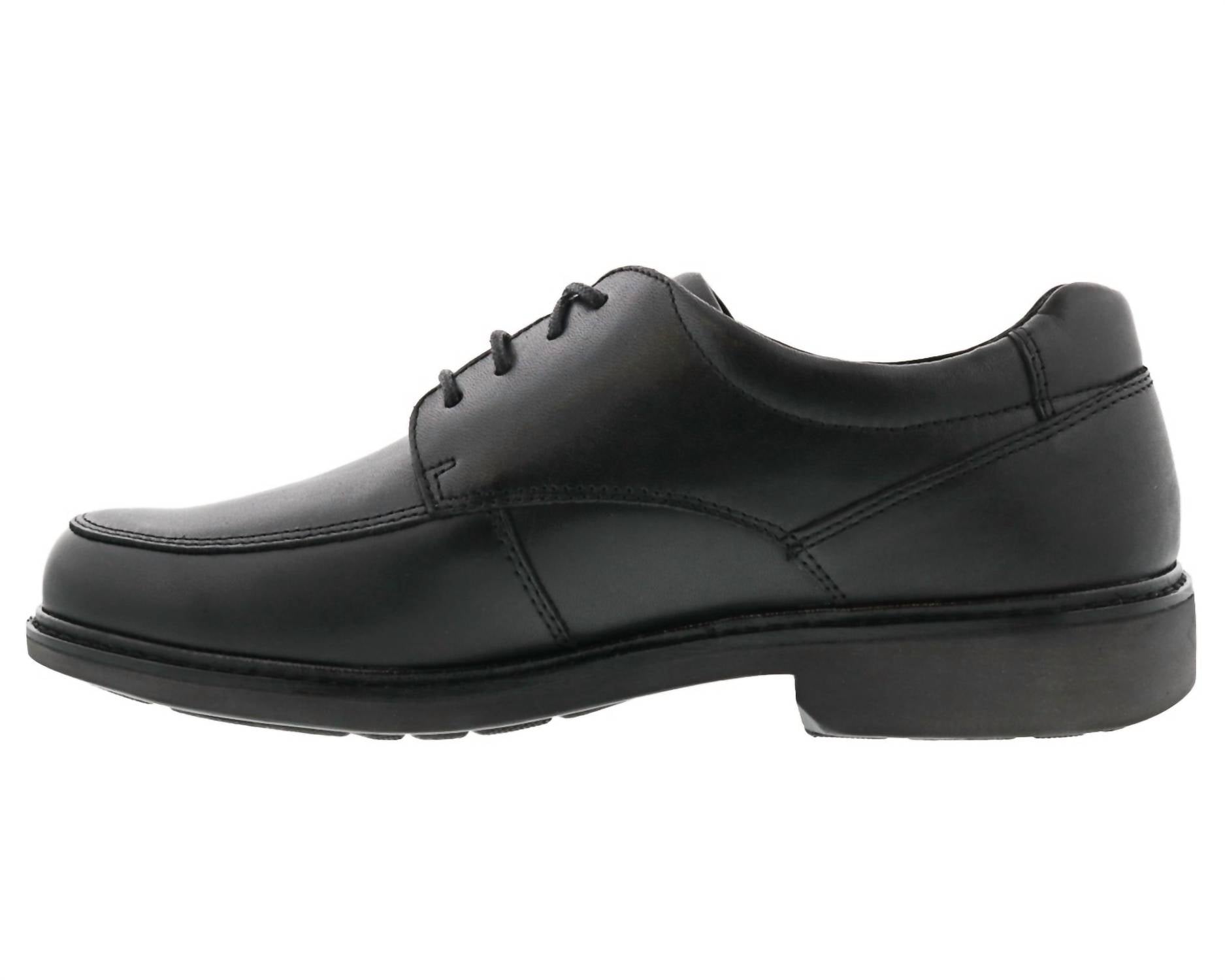 This men's dress shoe offers a sleek, classic look combined with therapeutic support. It features added depth, a removable footbed with maximum arch support, and an extended heel stabilizer for all-day comfort. The lightweight, flexible outsole and tempered steel shank provide stability, while the soft padded tongue and collar enhance comfort. Designed with leather linings and built to accommodate prescribed orthotics.